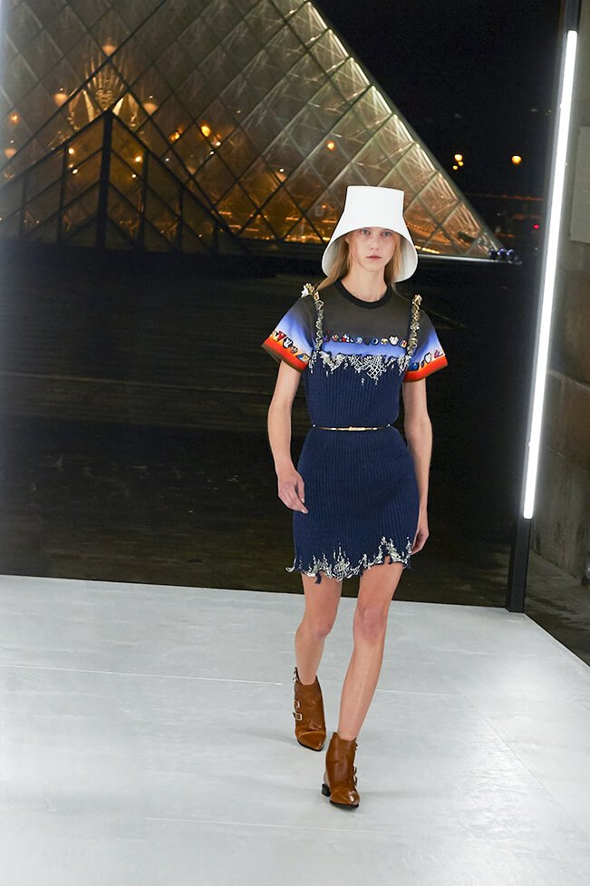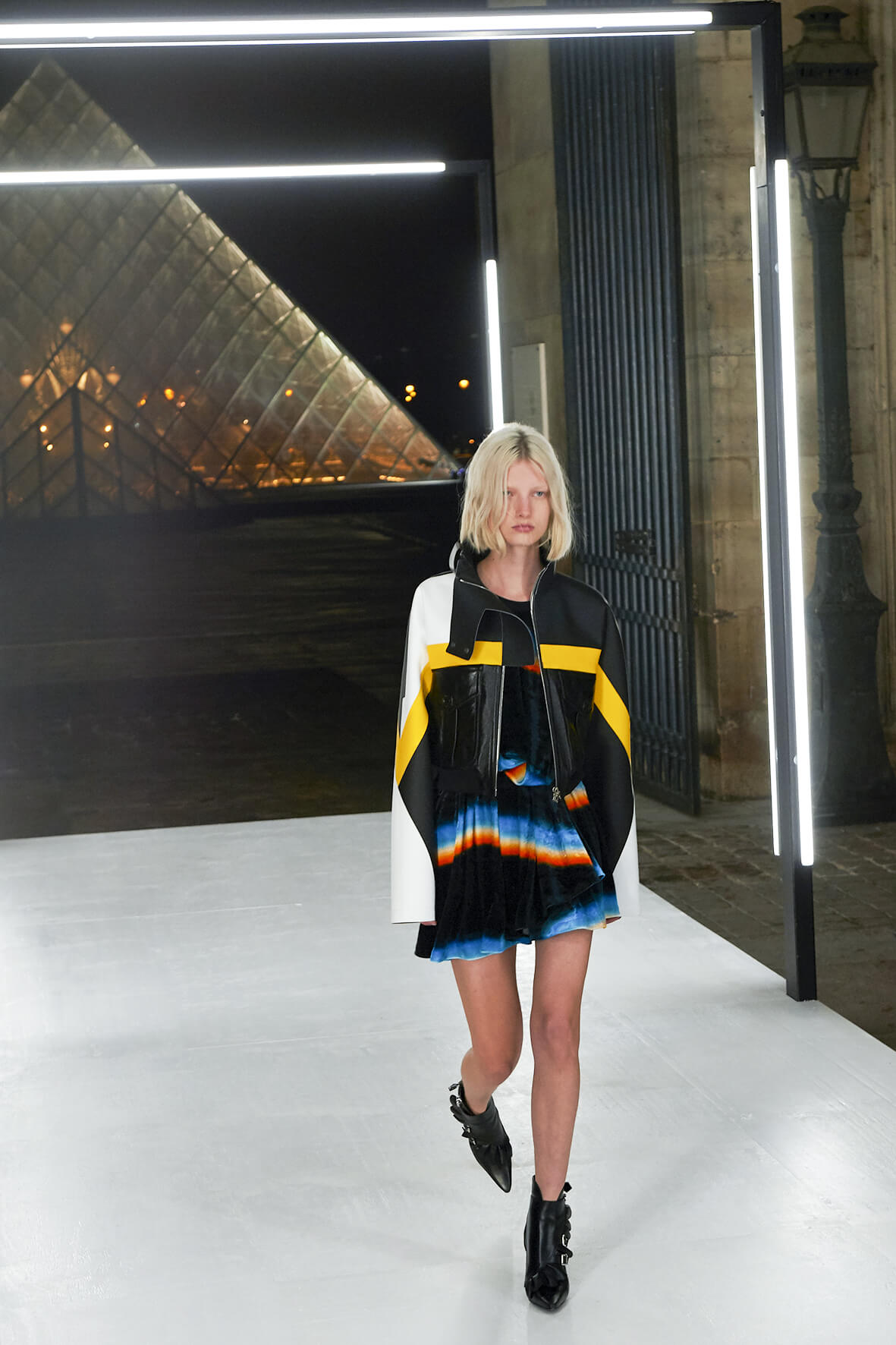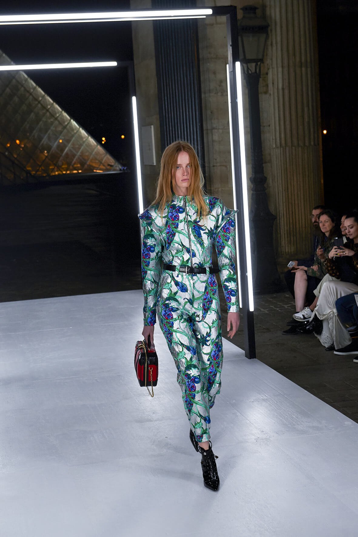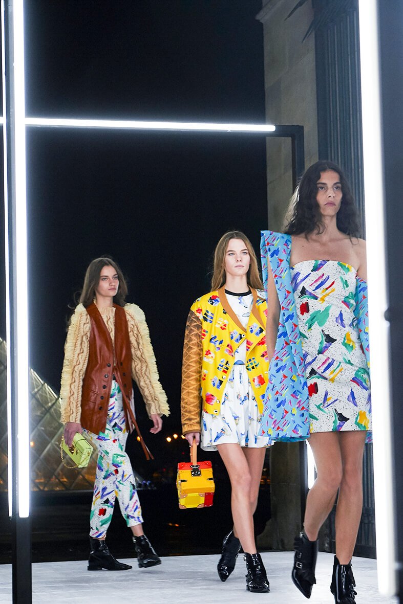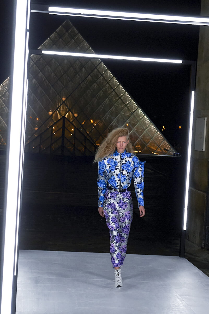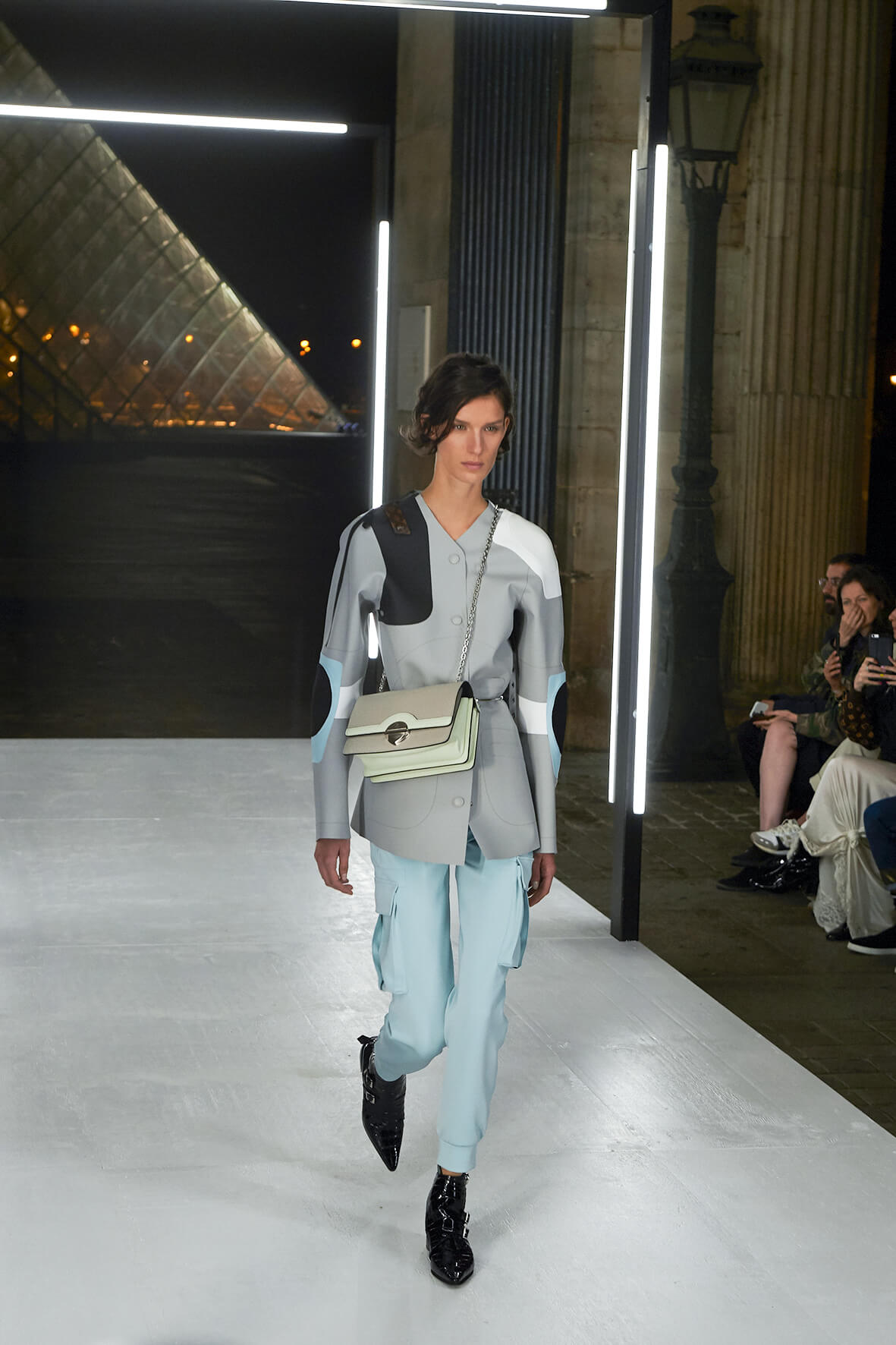 Around a historic courtyard within the Louvre, snaked a series of stark glass tunnels. It was as if some secret agency had constructed a secret facility in the most hallowed crucible of French culture. That’s what Louis Vuitton’s Nicolas Ghesquière did. The designer was in upbeat futurist mode. The first look – a voluminous blouson with space suit sleeves and matching mini skirt – set the tone for this sporty, vivid, sci-fi-inflected show. Out came the Ghesquière gang in their colourful confident clothes. This was not an exercise in clinical chic. Although the clothes were precise, they were also gaudy (in a good way) and the collection throbbed with a vibrant energy. The prints looked as if they were borrowed from collaged Instagram feeds or Memphis inspired graphics.