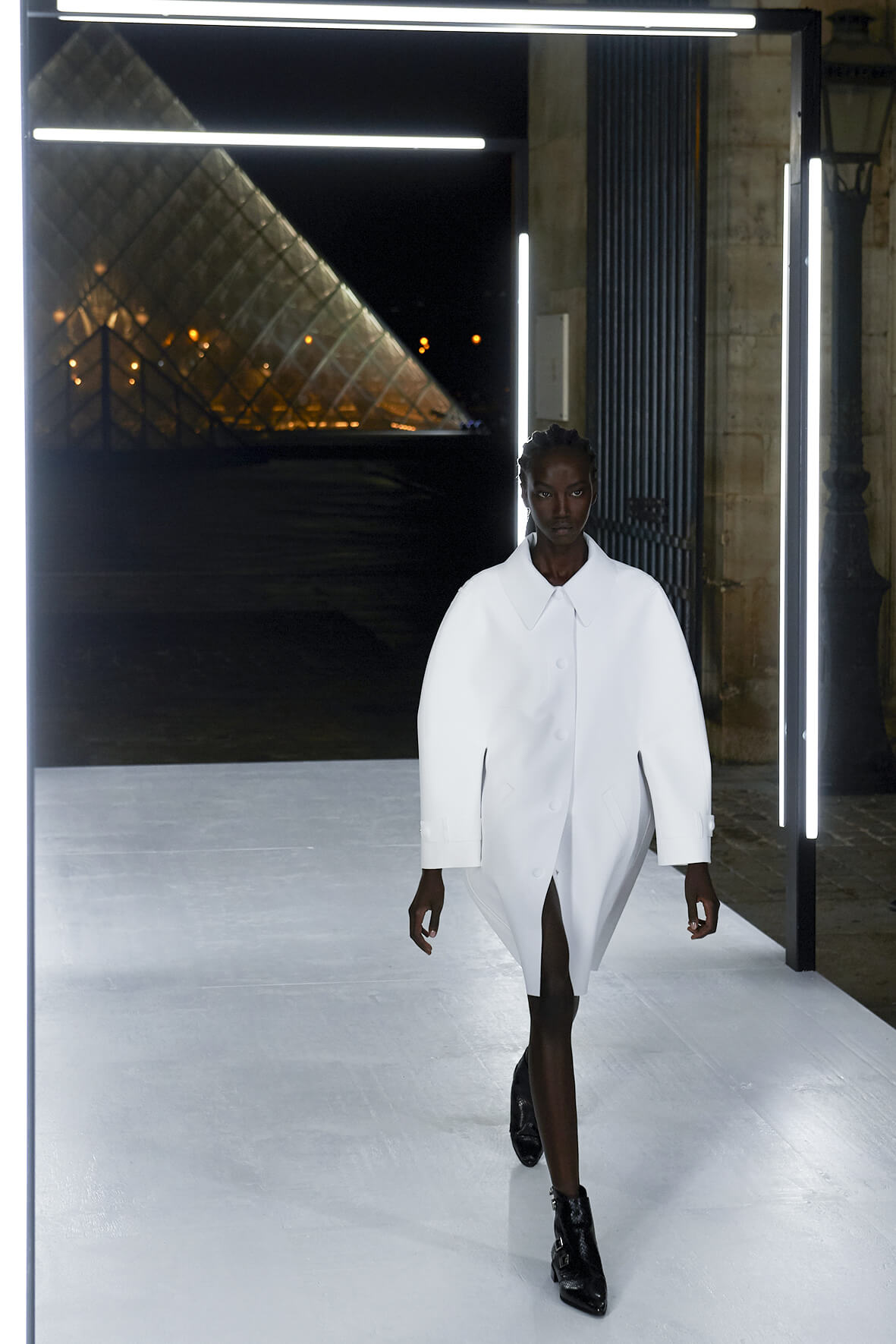 It was highly crafted but felt modern. One Sequin embroidered mesh dress, melded haute handwork with modernist chic. And was that Ghesquière menswear we saw? No, said the house, but there were several ultra-androgynous models in the show wearing butch, wide-shouldered zip-fronted blazers and crisp chinos. This was not a dystopian vision, but one full of optimism and joy. The models, with their big, bouncy scrunch-dried curls were unstoppable. Ghesquière is looking to the future with a smile on his face. Us too.