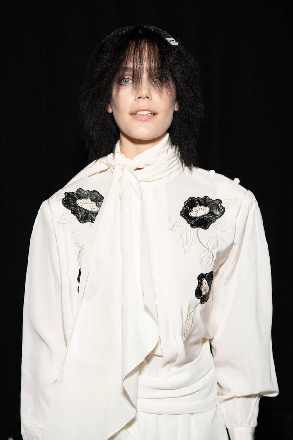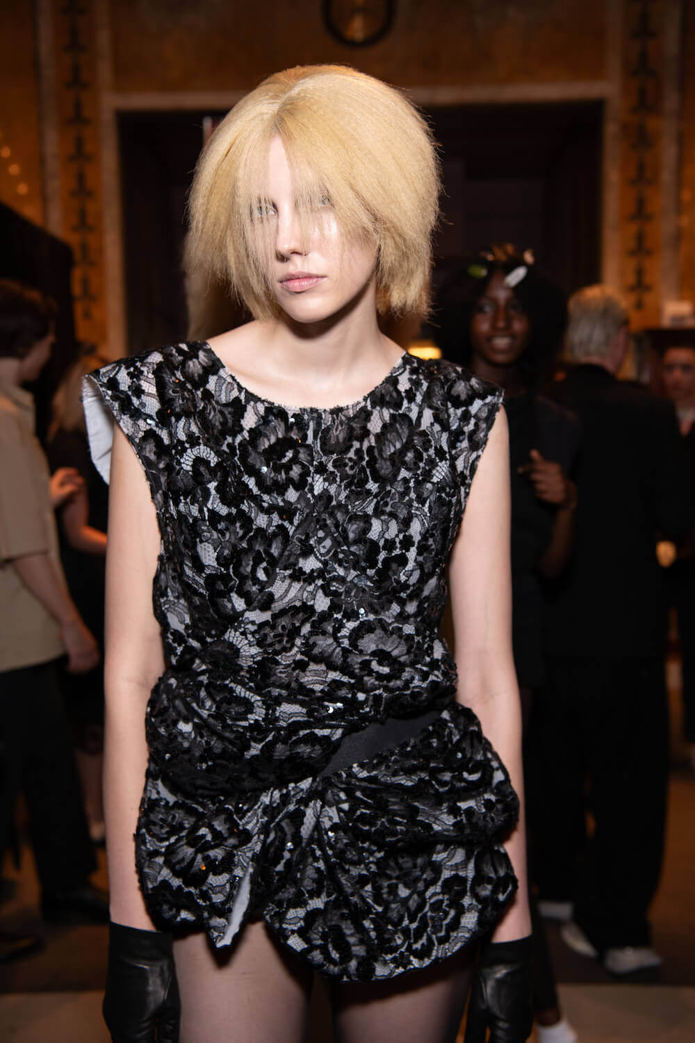 Dubbed a “striking fusion of masculine tailoring and feminine elegance”, the largely monochromatic collection saw swollen tailoring with meaty shoulders walk beside Beetle Juice suits and elegantly draped, metallic mini dresses which came in intricate clusters. It was as if models were copy-and-pasted, their looks only slightly altering by colour or shape. You could say they were clones from the 1980s teleported to the TikTok generation. Just don’t blink, you might miss ‘em…