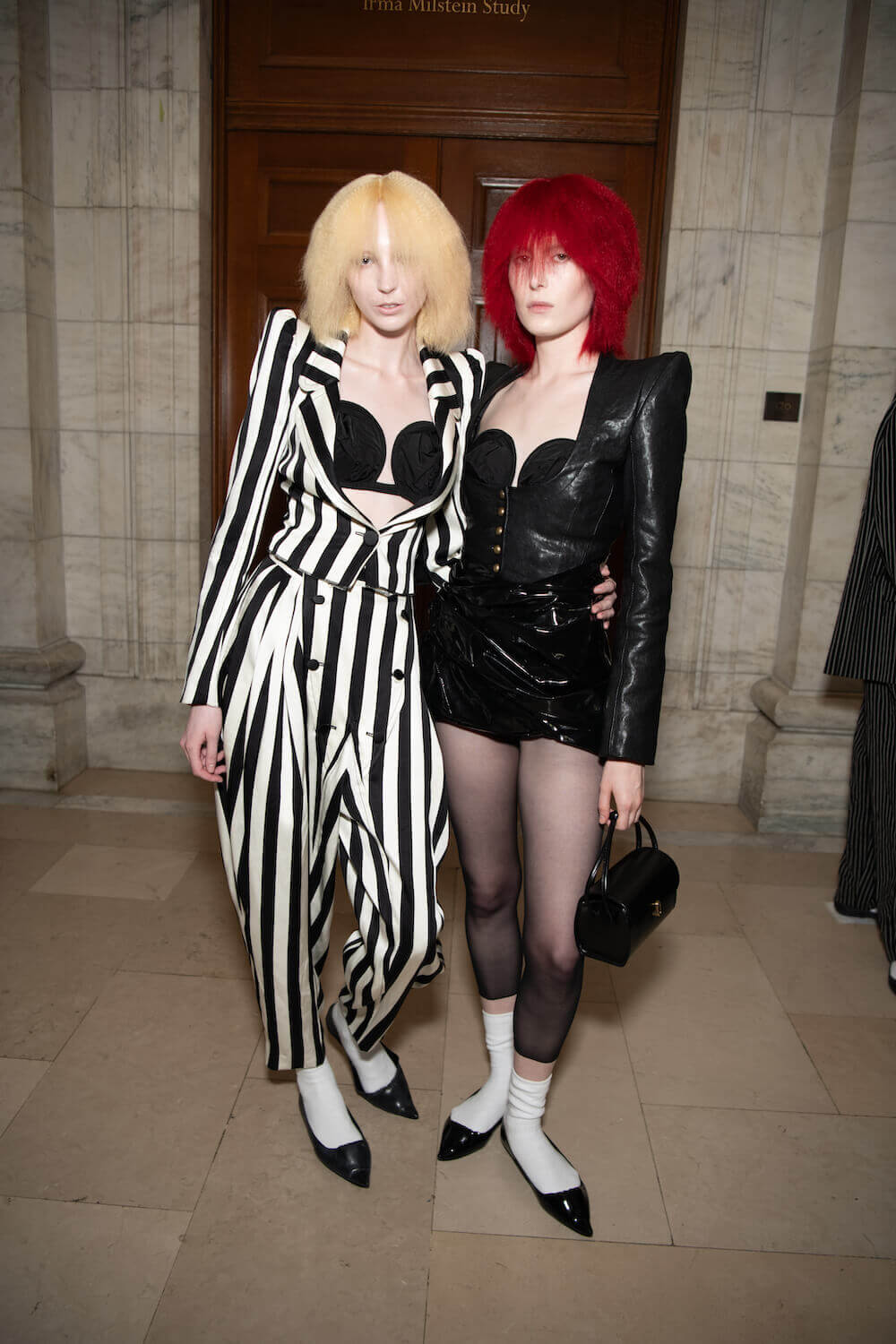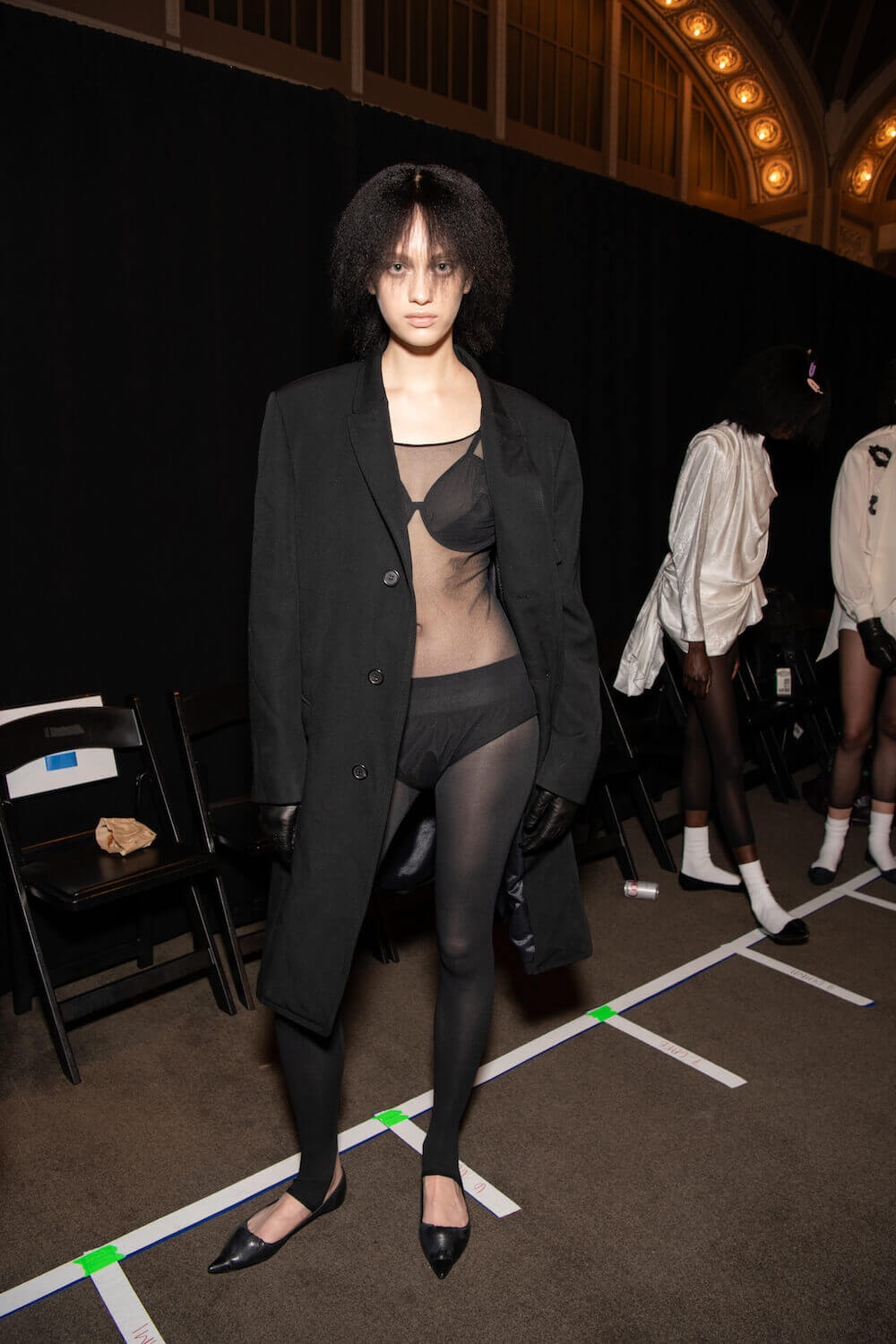 Models practically had smoke flaming from their pointed ballet flats (a sensible alternative to Jacobs’ signature Kiki Boot) as they stomped in a hurried unison of crimped, punky bobs, clad in mannish suit jackets, teeny-tiny negligee frocks and semi-sheer black tights. The turbo-charge seemingly read as a comment on fashion’s rapid pace and how we consume media in today’s age. A point driven home via the show’s press release, which was wrote by OpenAI and ChatGPT: the AI software threatening to put silly writers (like moi) out of a job. *Weeps*