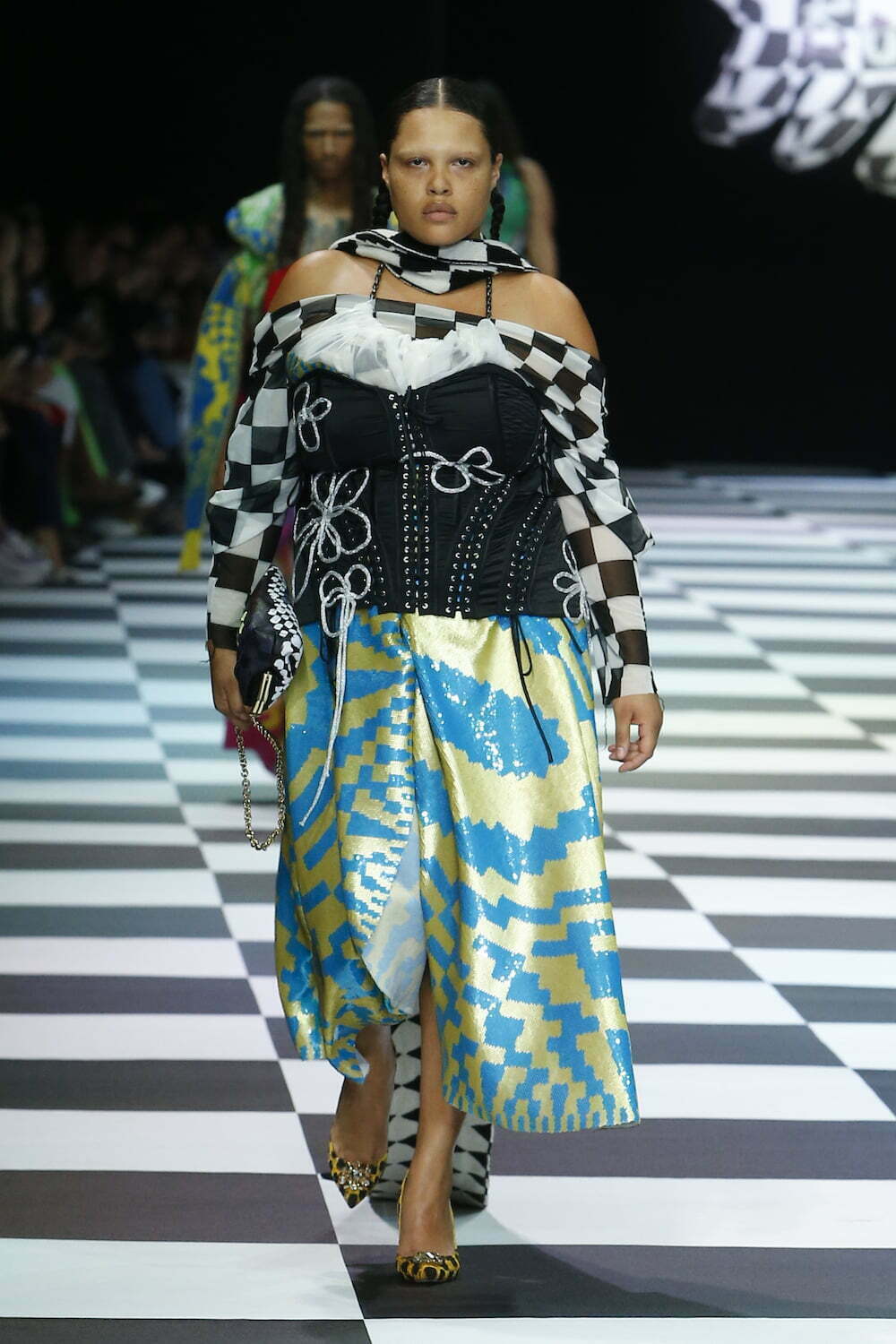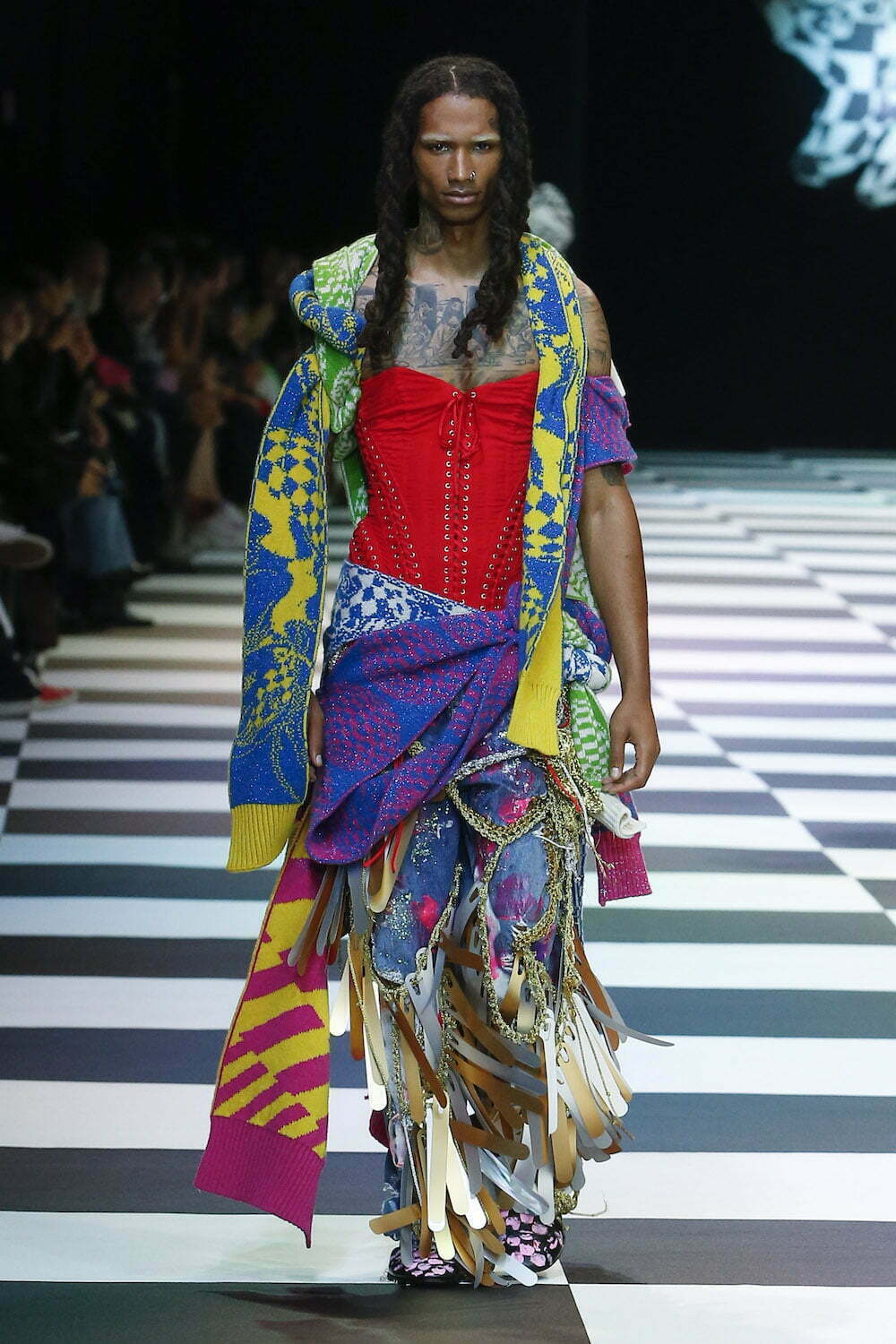Presenting his version of camouflage and checkerboard, exquisitely constructed corsets came hand-painted all over, while jeans came ripped, embroidered and embellished on a cast that included Ashley Graham, Richie Shazam, Lea T and Hari Nef. Elsewhere, the mirrored pyramid hats were realised by Stephen Jones, the recycled sequins were from The Sustainable Sequin Company, and the vintage telephone wires tangling and dangling off bags were sourced especially to cement this show – the majority of which was made by hand in Yorkshire – as a lesson in slow fashion for a fast-paced world.