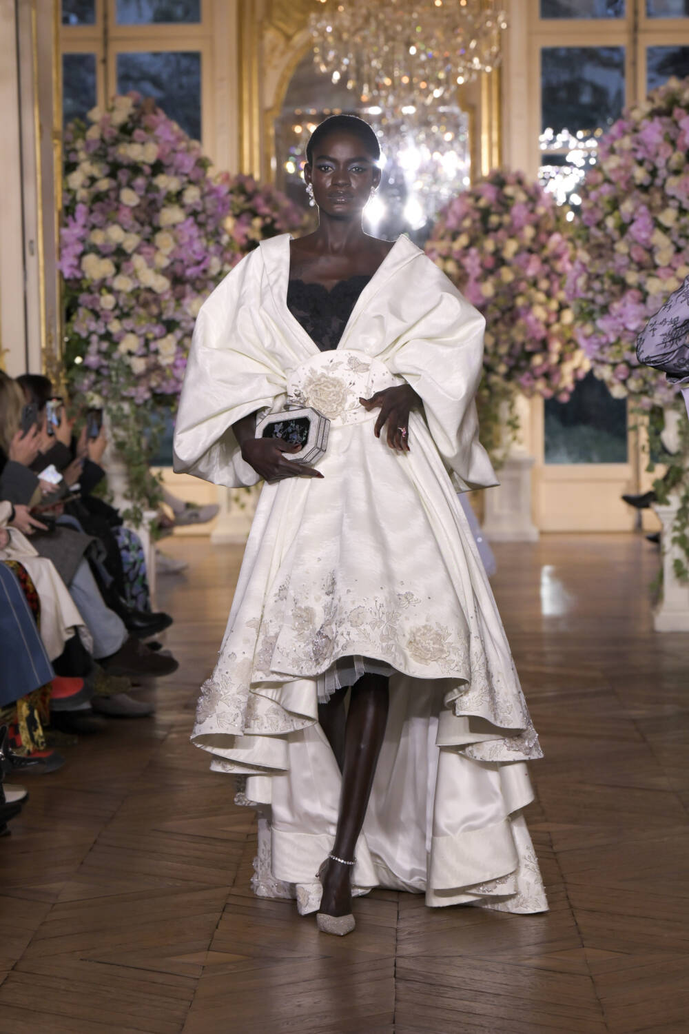 There were references to traditional Korean dress through craftsmanship, with the traditional mother-of-pearl inlaying technique of Najeonchilgi used on bodices and accessories. Minhwa, a Korean folk art, inspired the grandiose silhouettes as canvases. Royal levels of elaborate, Miss Sohee’s design language is couture to the core.