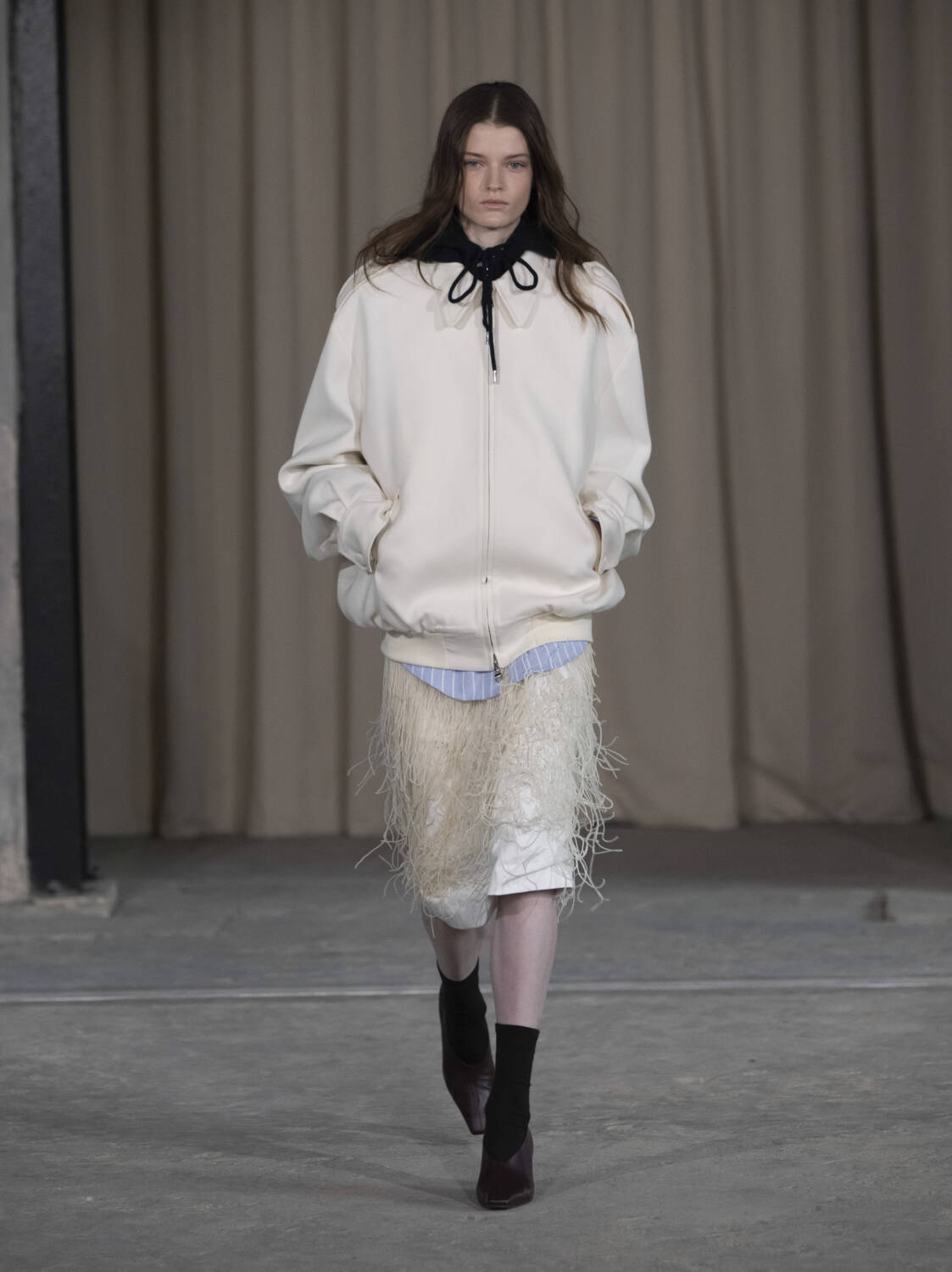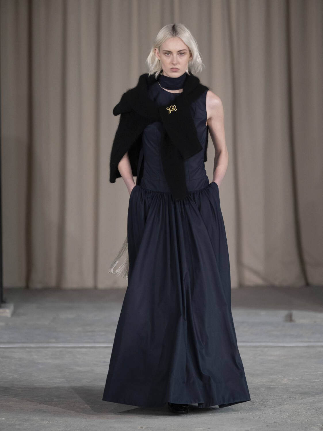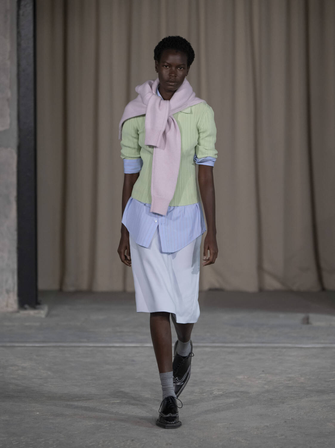 Elsewhere full skirts met sharp shoulders, tan leathers softened navy wools, and saccharine pastels clashed with a hard core edge. The collection questioned taste, drawing inspiration from the Eighties and Noughties in a vibrant display of colour and texture. Decades of influence and heritage are subverted through a bold colour palette, where awkward, sickly pastels clashed with classic preppy hues. Meanwhile, rock ’n’ roll prints and unexpected compositions injected a rebellious spirit.