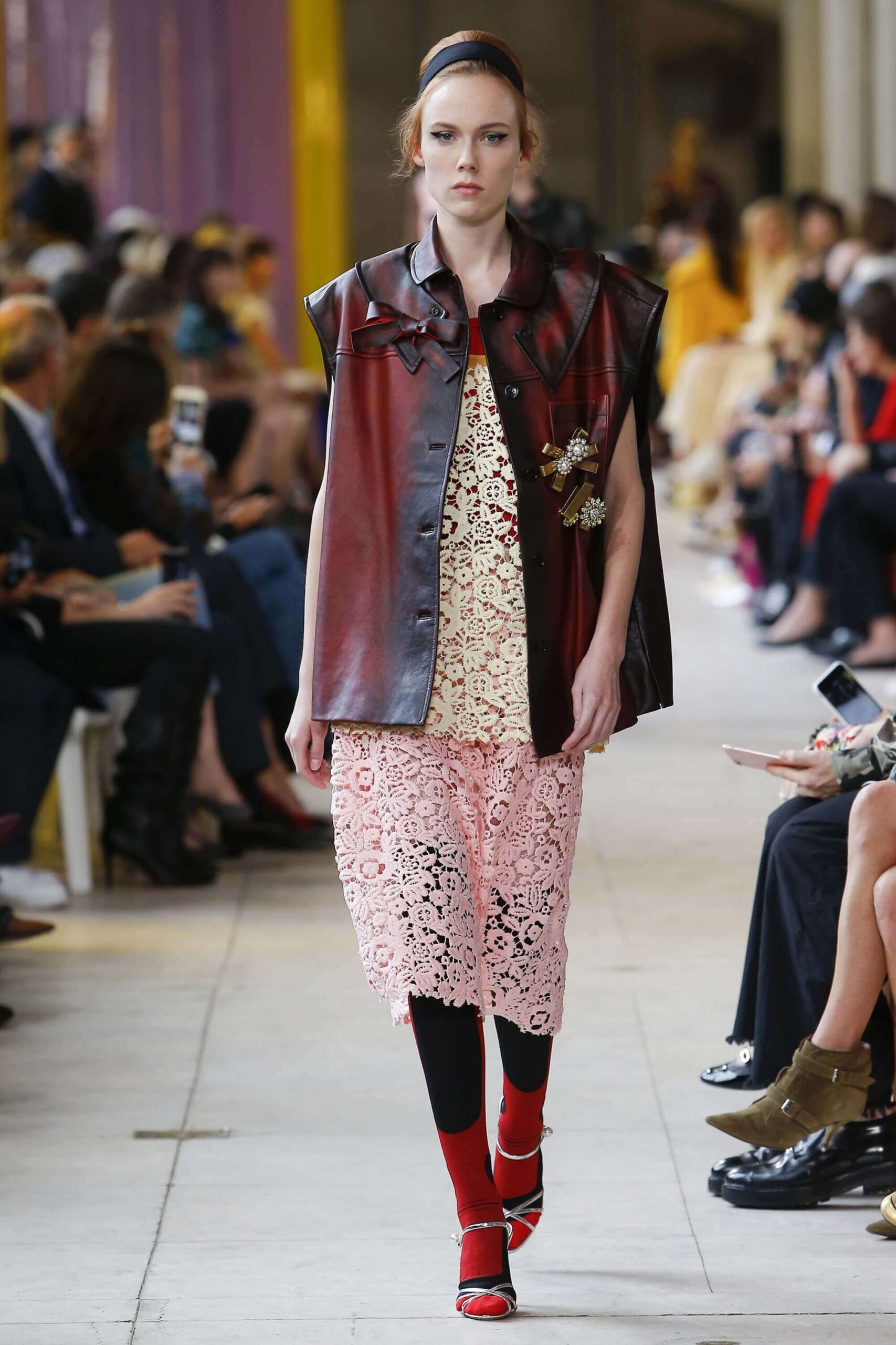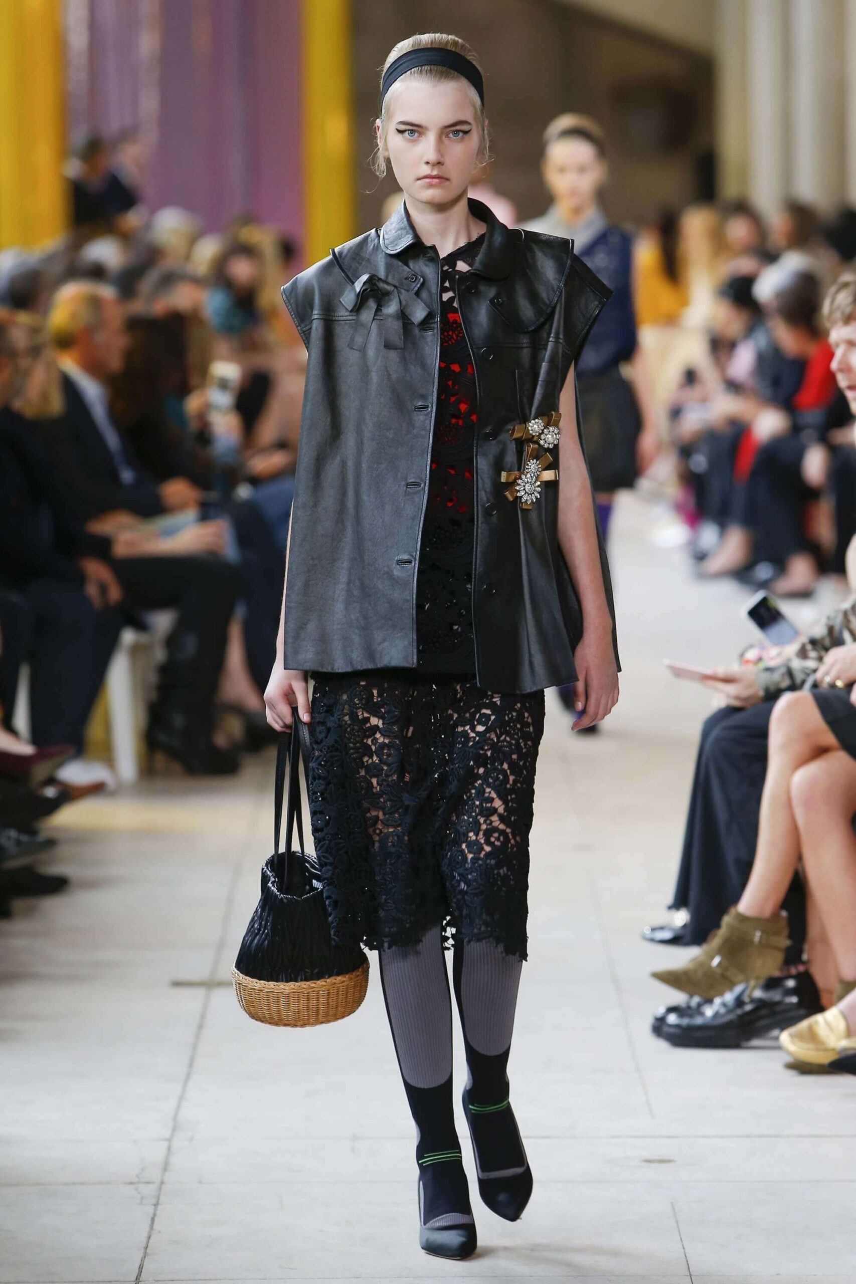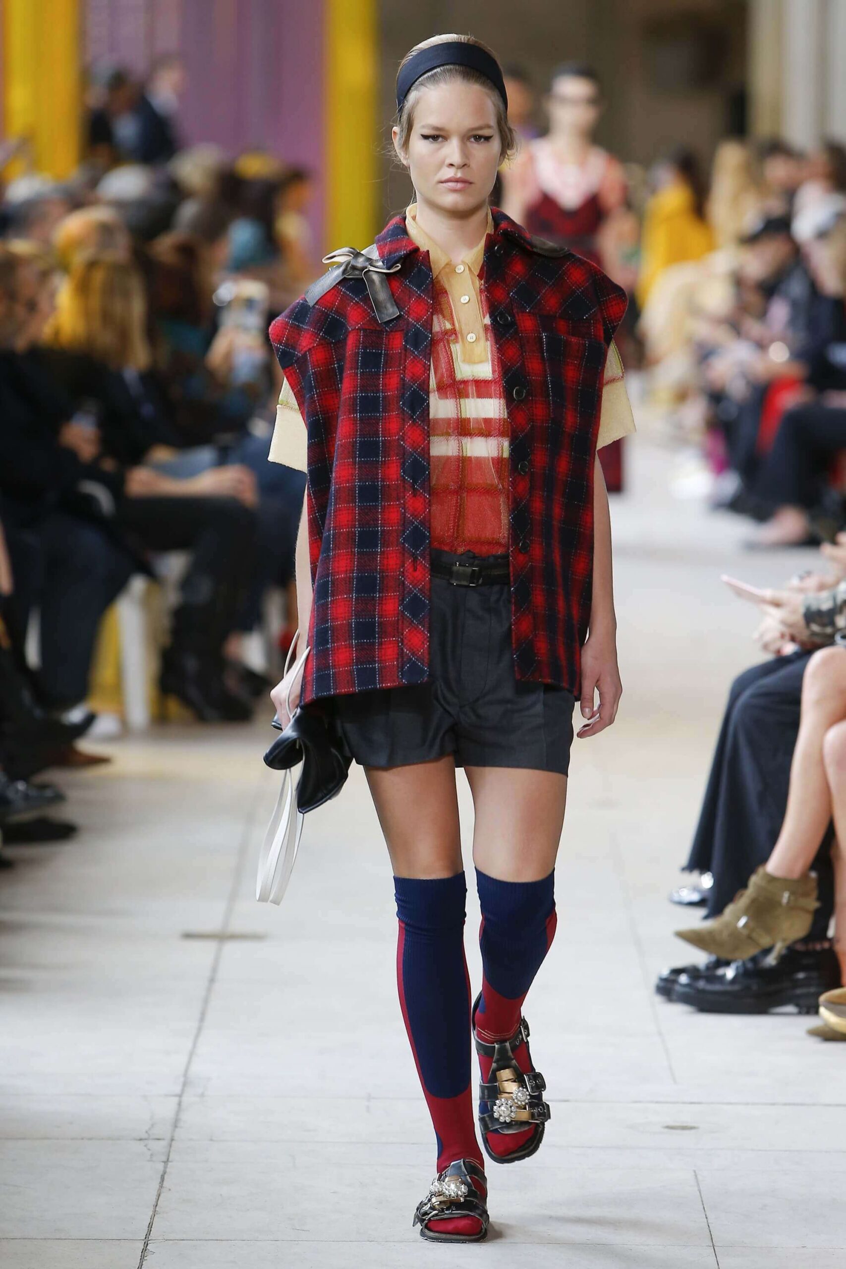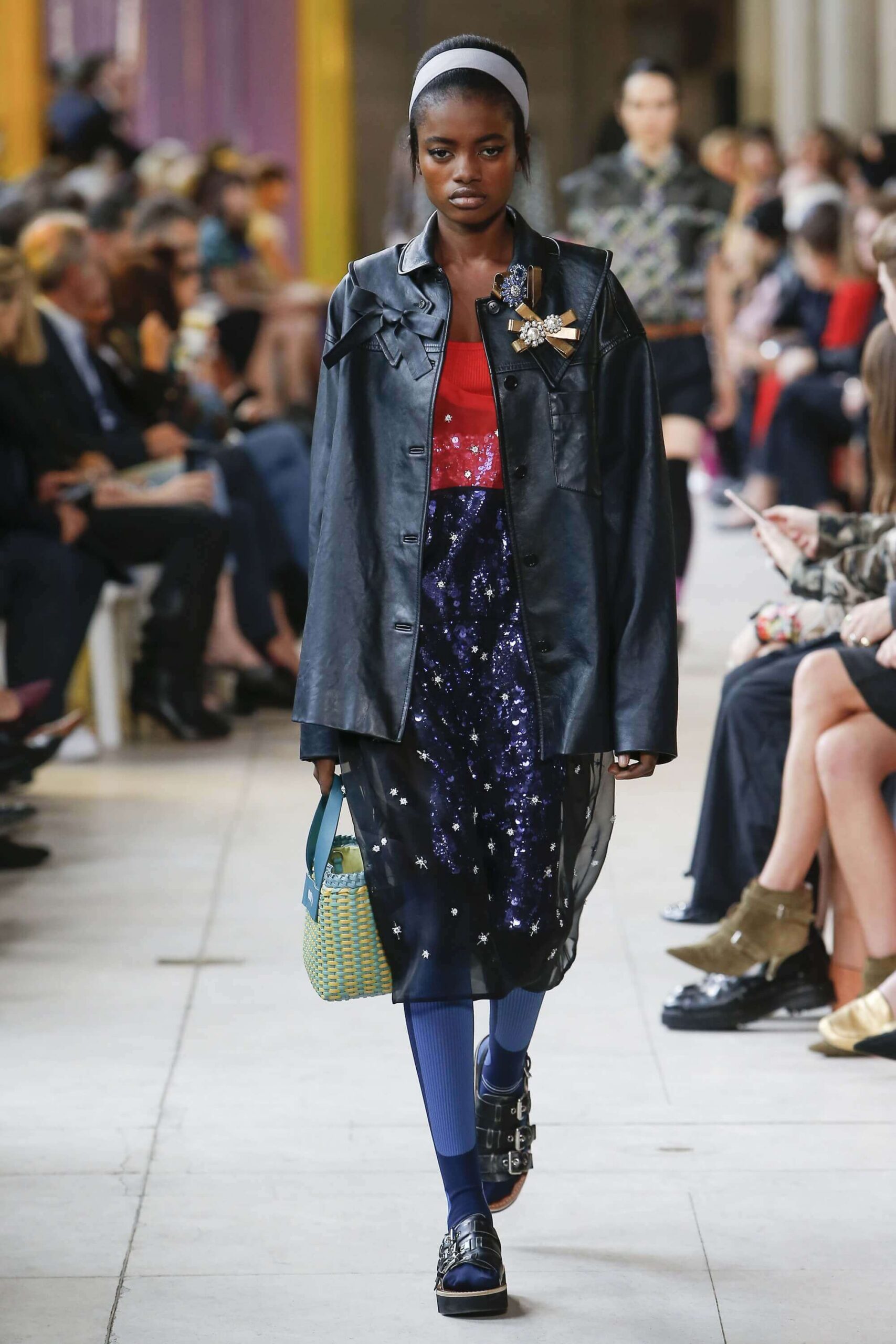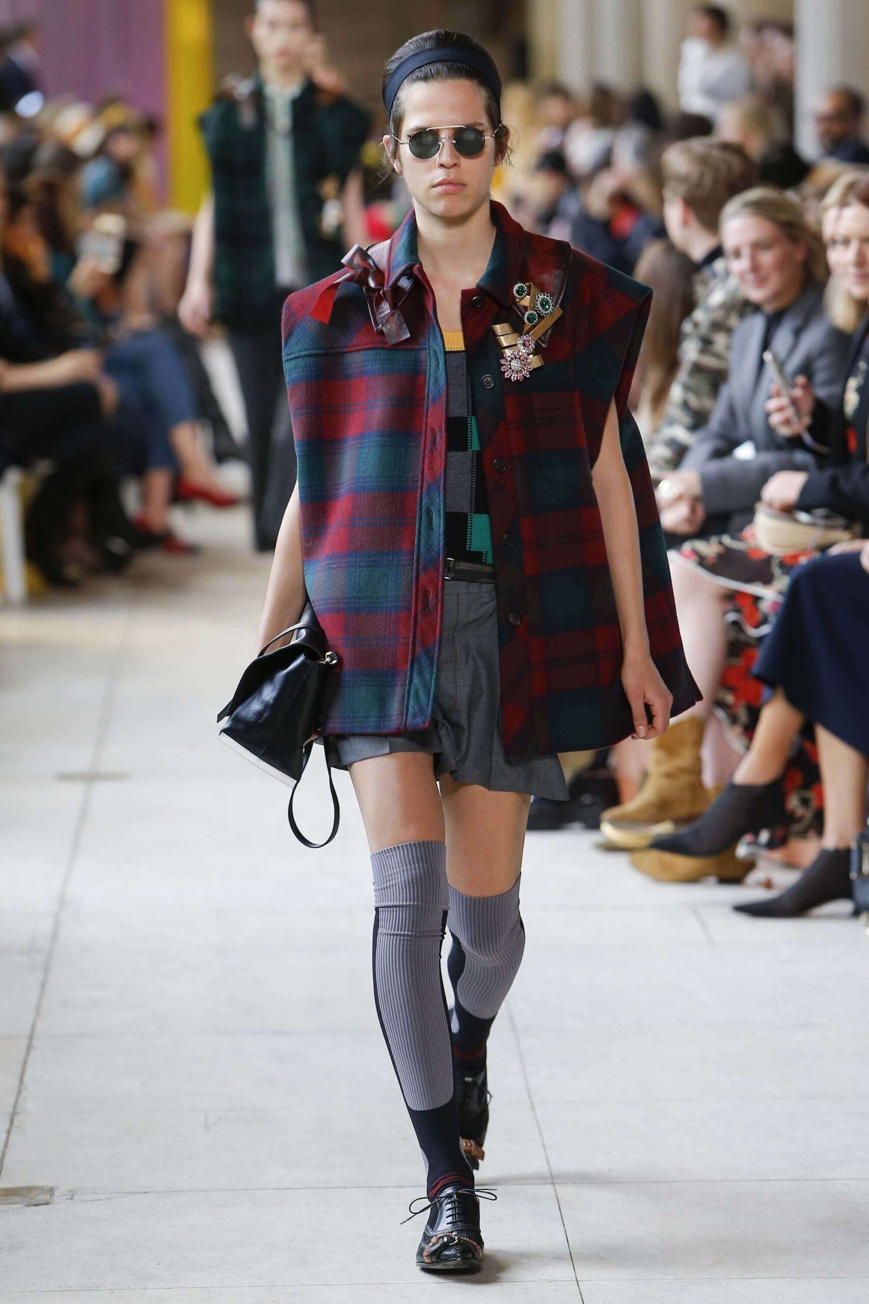 Her best friend was waiting for her in her brother’s grey trousers and school blazer – she was the coolest girl in Miu Miu’s gang. And then that girl they didn’t really like but she passed for 21 and could buy them beers came bearing Buds in a granny’s sofa print house coat, brown tights, three-strap buckle open toe flats sandals and an Alice band hair do number. All smart, all savvy, all dressed to the nines. If things got cold Miu Miu would pull on her boyfriend the biker’s sleeveless leather gilet. He’s sooooo hot! Now where’s that bottle of Bud?