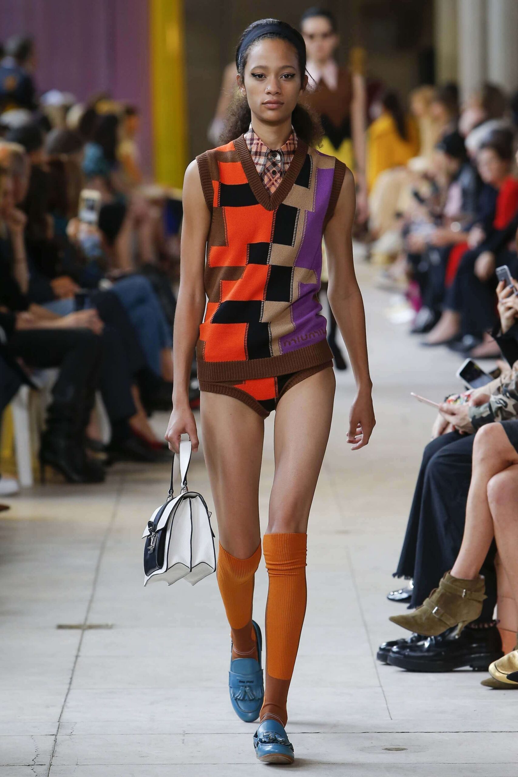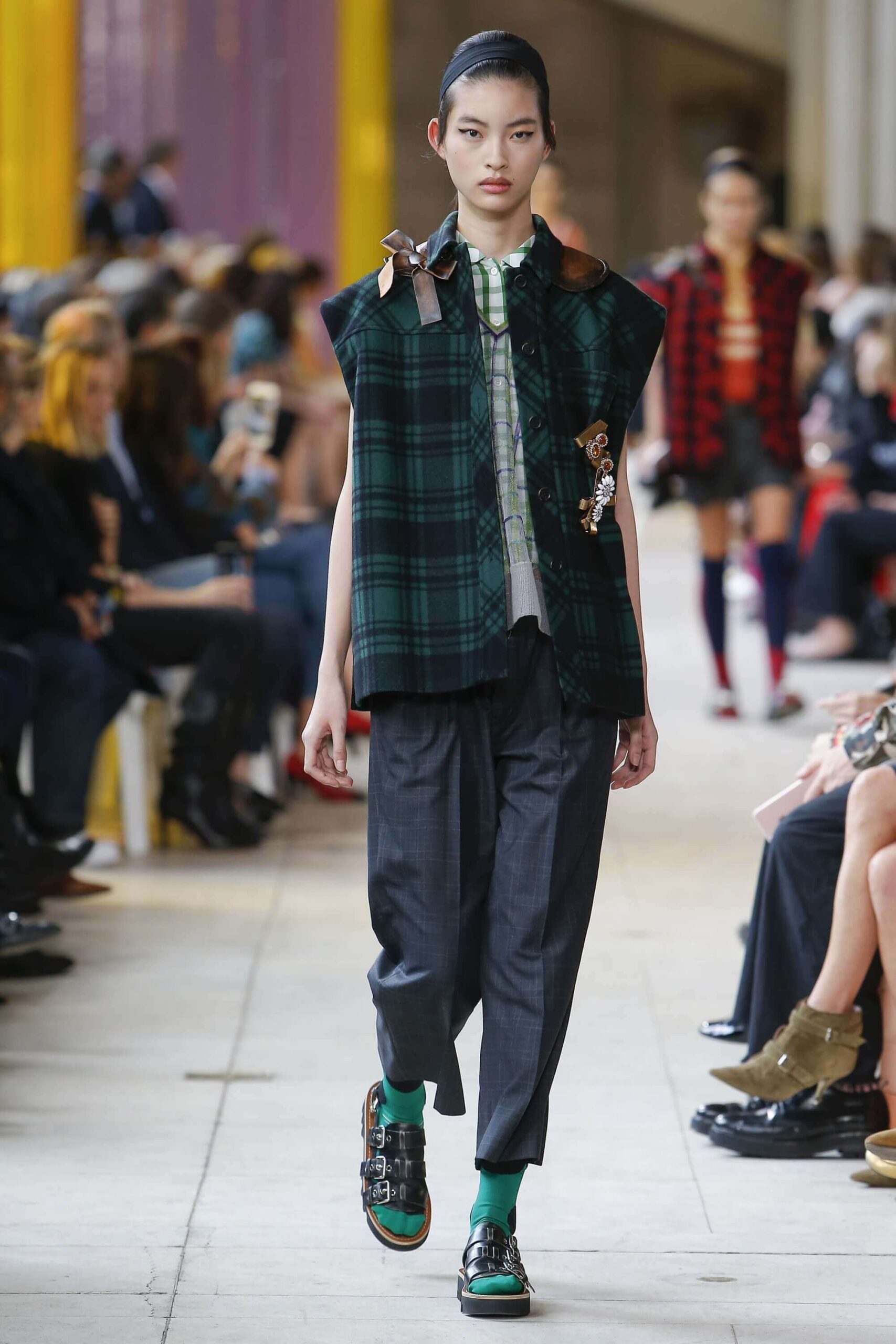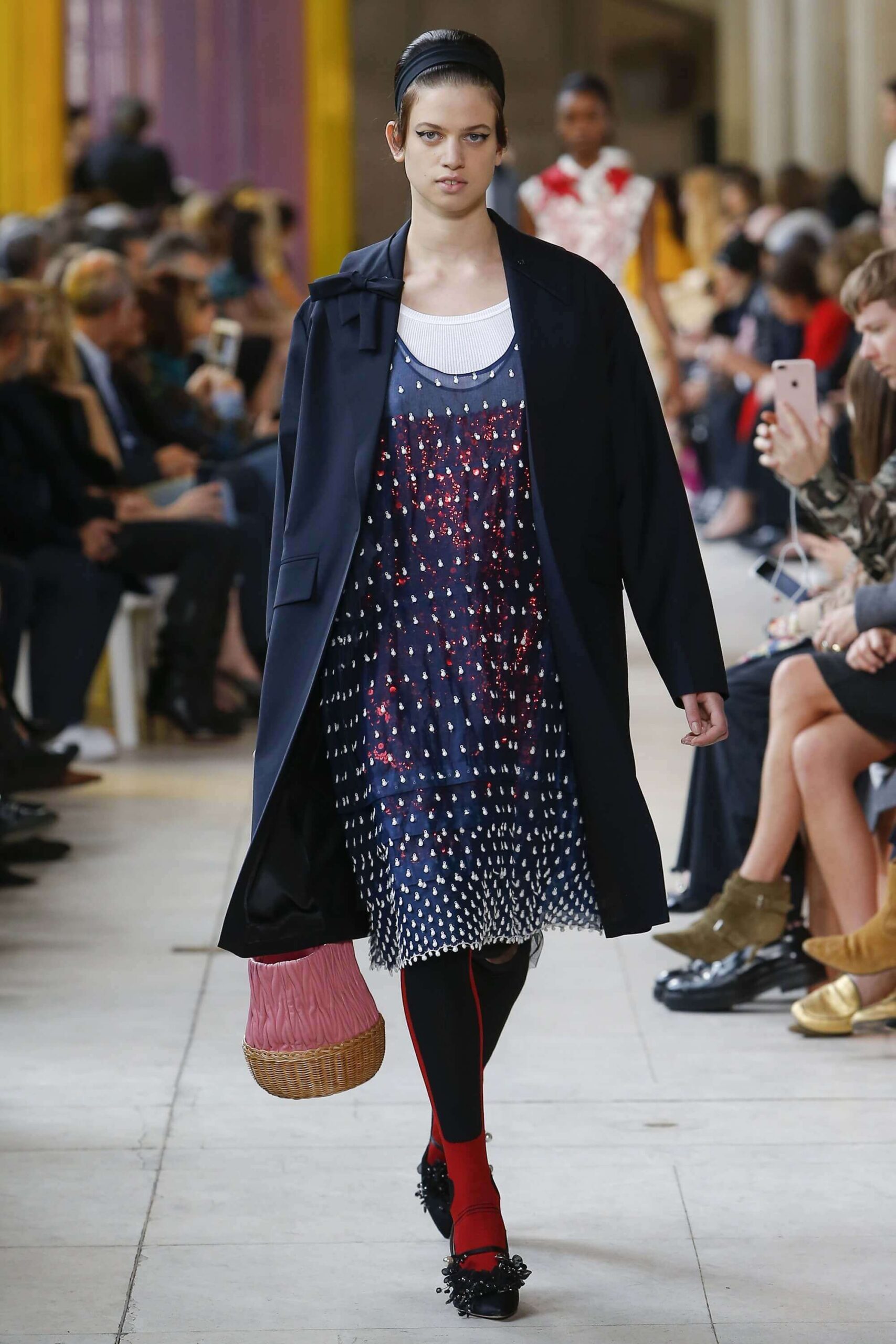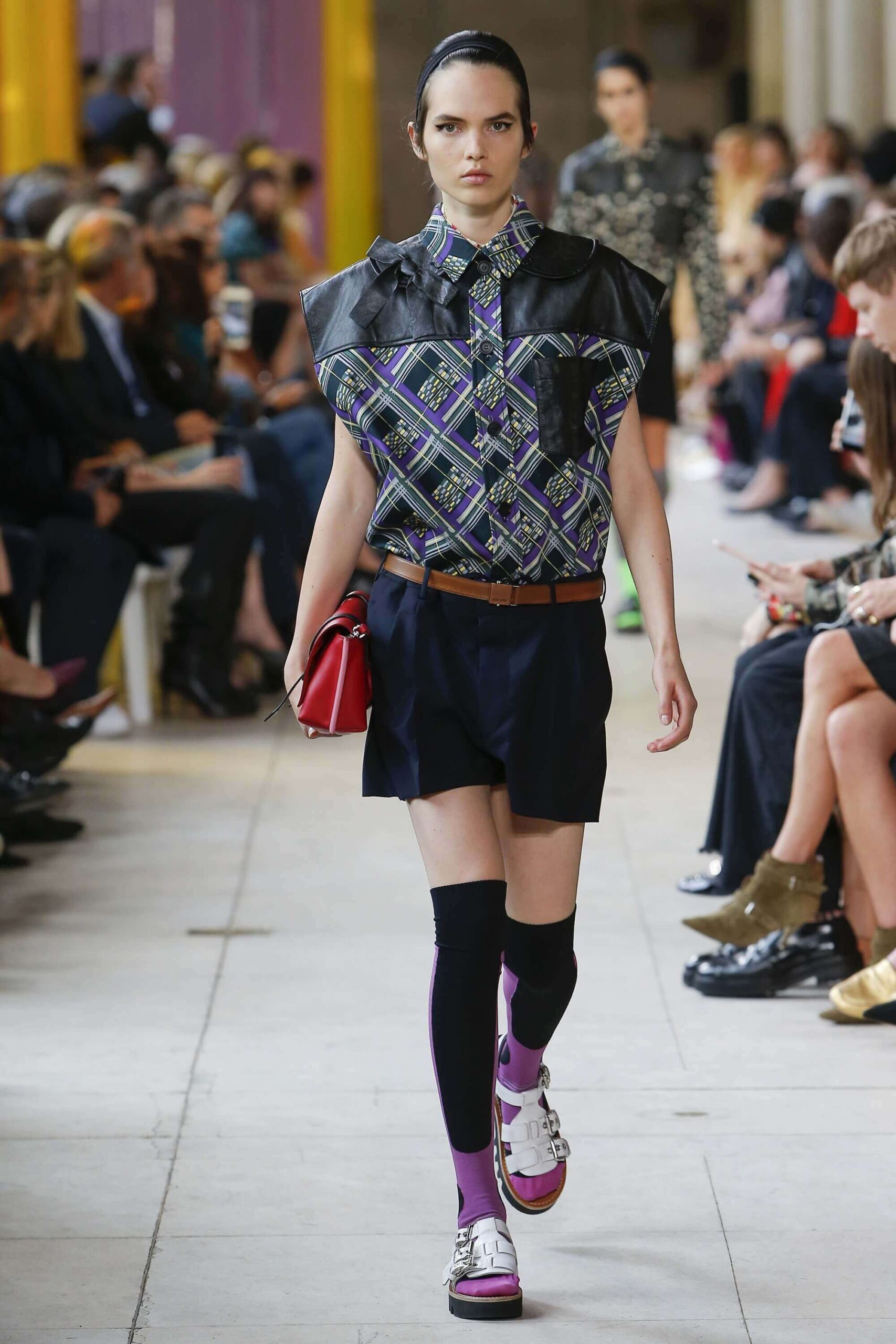 Her best friend was waiting for her in her brother’s grey trousers and school blazer – she was the coolest girl in Miu Miu’s gang. And then that girl they didn’t really like but she passed for 21 and could buy them beers came bearing Buds in a granny’s sofa print house coat, brown tights, three-strap buckle open toe flats sandals and an Alice band hair do number. All smart, all savvy, all dressed to the nines. If things got cold Miu Miu would pull on her boyfriend the biker’s sleeveless leather gilet. He’s sooooo hot! Now where’s that bottle of Bud?