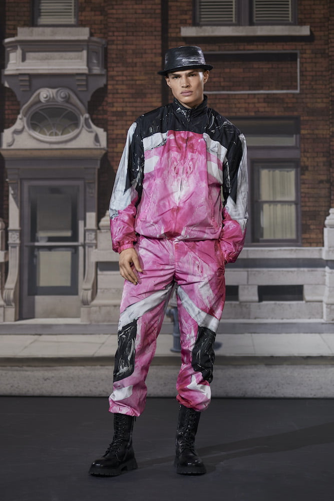 Jeremy Scott unveiled his Fall 2021 men’s collection in typical, playful style. Using the trope of a painter, he fashioned wardrobe essentials – from formal coats to motorcycle jackets and blazers – in painterly prints that had been engineered to look like expressive brush strokes. It was trompe l’oeil on steroids.