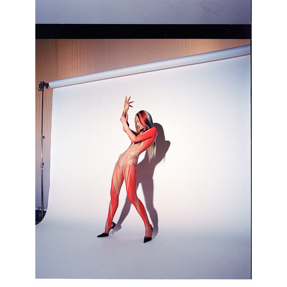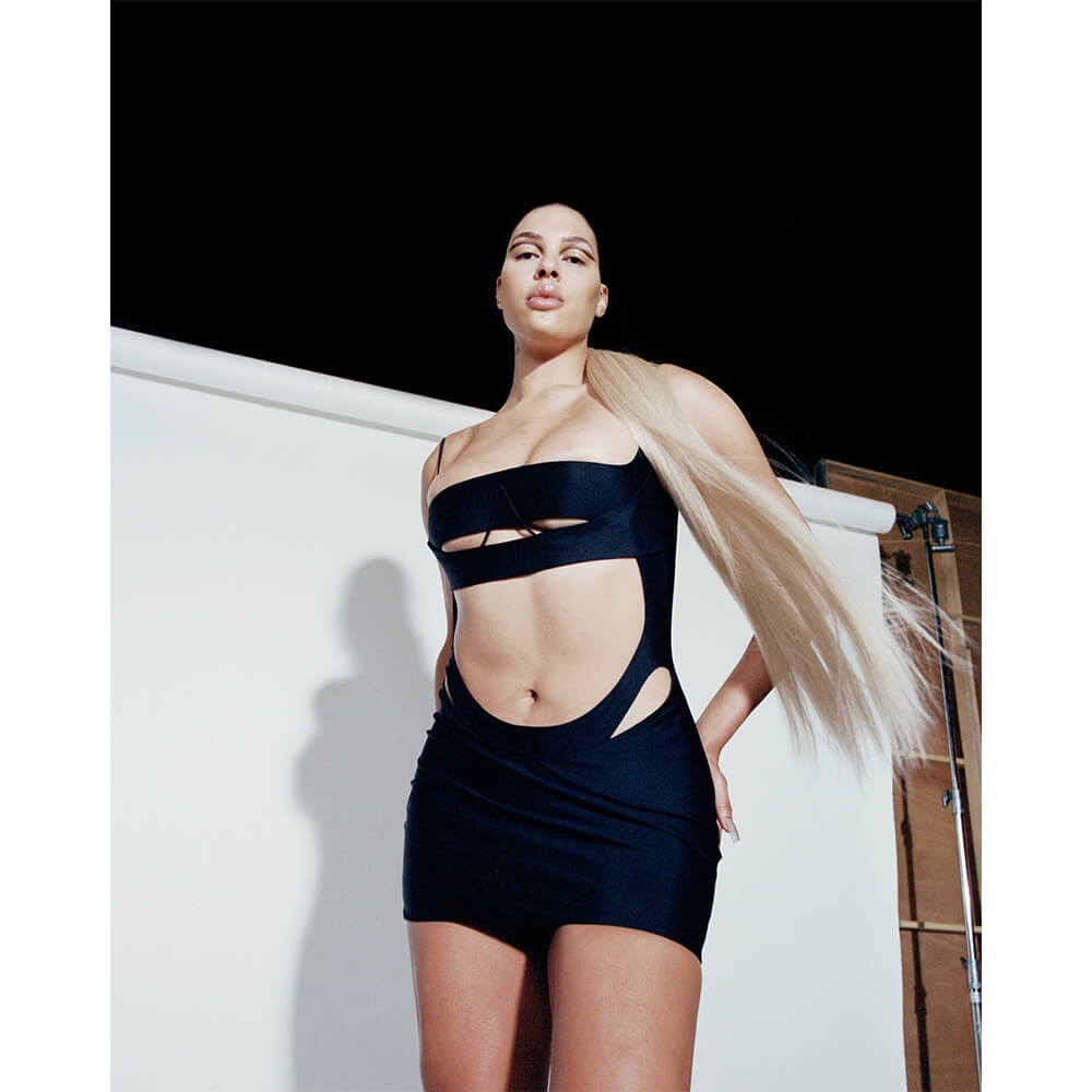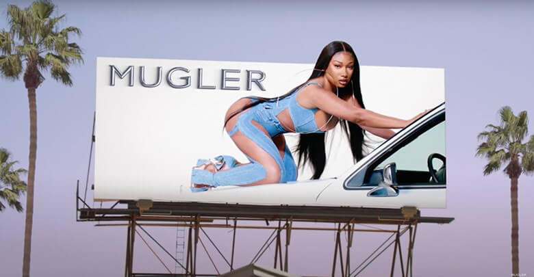 Though this season’s flick comes with an extra dollop of Tinseltown magic. Working again with director Torso, the duo headed to Paramount Studios, where Mugler’s courageous women kicked, dipped and hair-flipped their way through film set backlots. Joining Mugler’s on-going cast of warriors – which includes everyone from Bella Hadid and Lourdes Leon, to Dominique Jackson and experimental musician Eartheater – is Megan Thee Stallion. Cadwallader recently co-directed the video for Stallion’s single “Plan B”, reuniting once more as the globally-adored rapper appears as a billboard starlet – clad in an ass-baring Mugler bodysuit fashioned from denim.