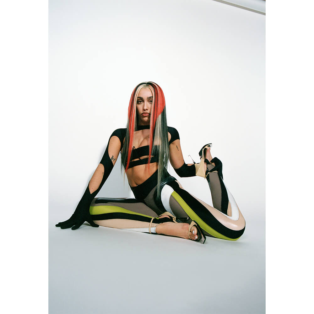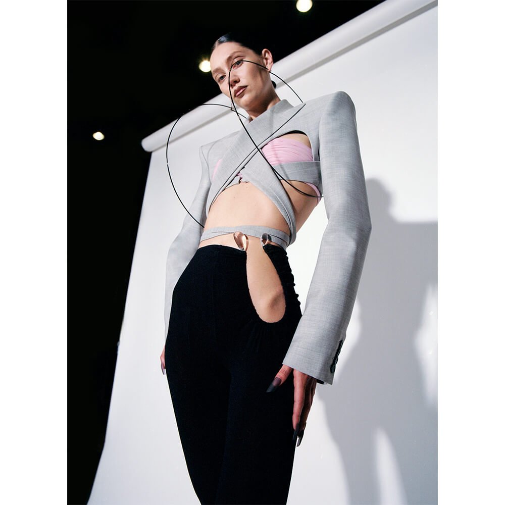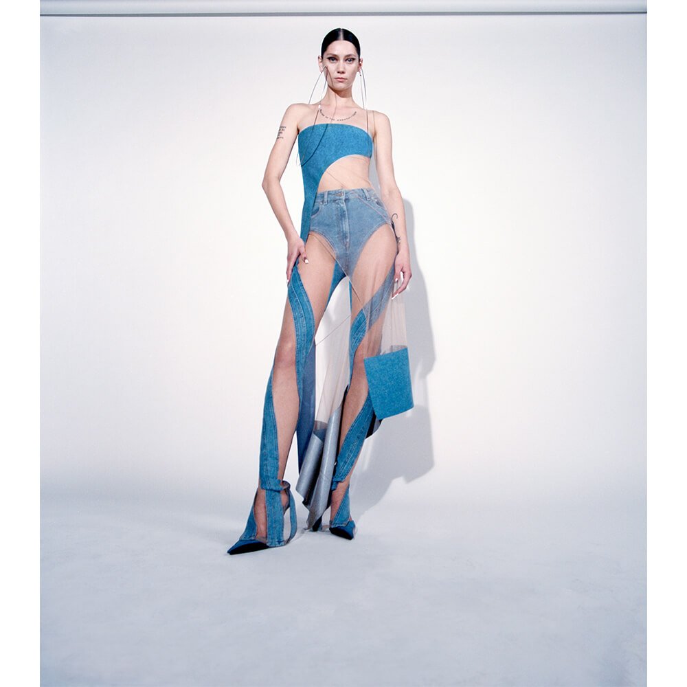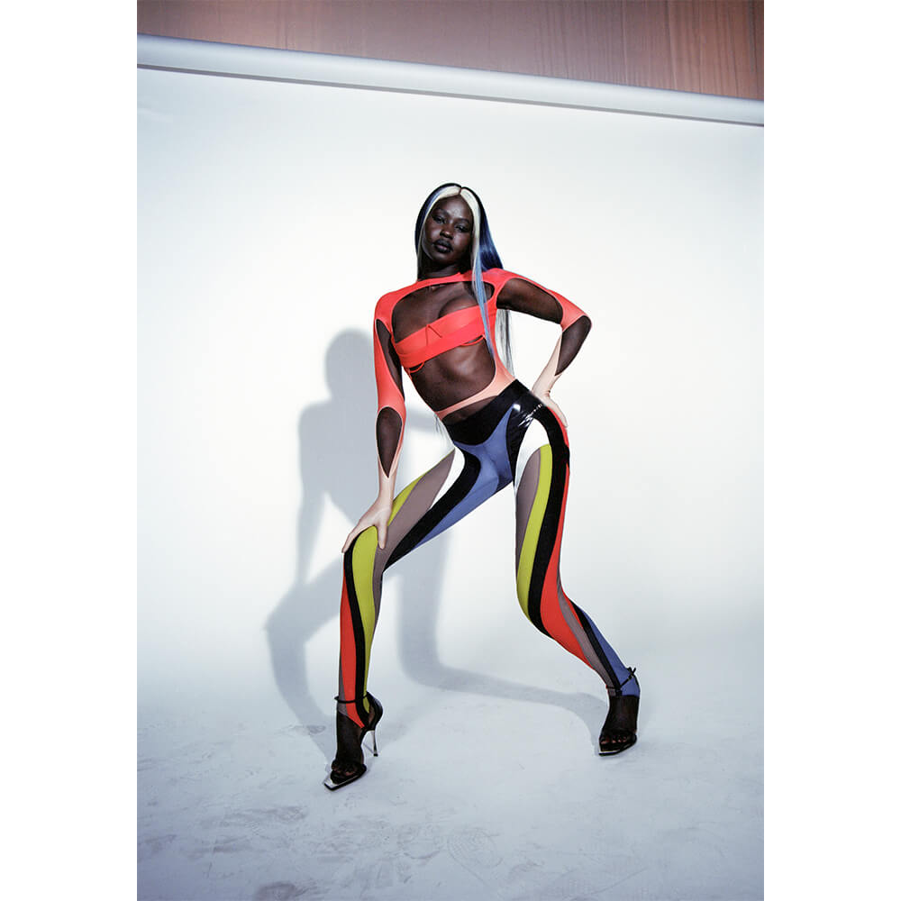 Throughout, both Mugler and Cadwallader signatures get a touch up. The brand’s hit illusion bodysuits now come in rave-ready hues: flashes of orchid pinks and purples, vermillion, and coral, spread across razor-sharp cuts. Perspex hardware – a Manfred Mugler classic – also features across sculpted shirts and trousers, paired alongside XXL hoop earrings and Cadwallader’s newest creation: the Hoochie dress, a gloved, asymmetric frock with plenty of cut-outs – offering glimpses of erogenous zones. No one does sexy dressing quite like Mugler.