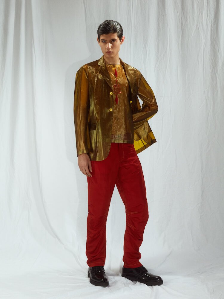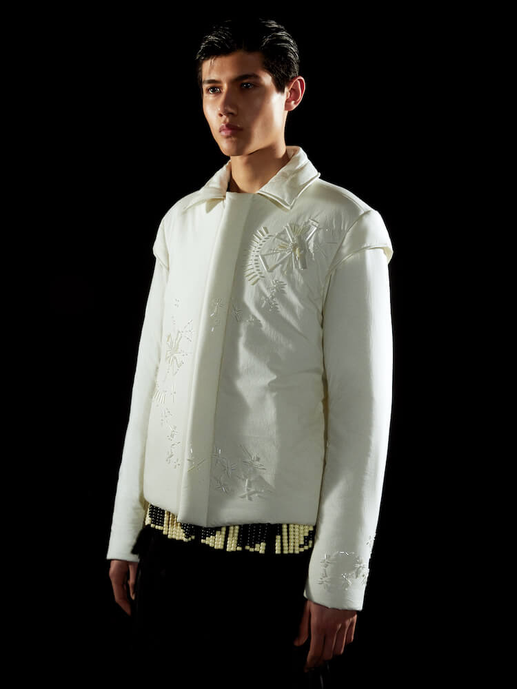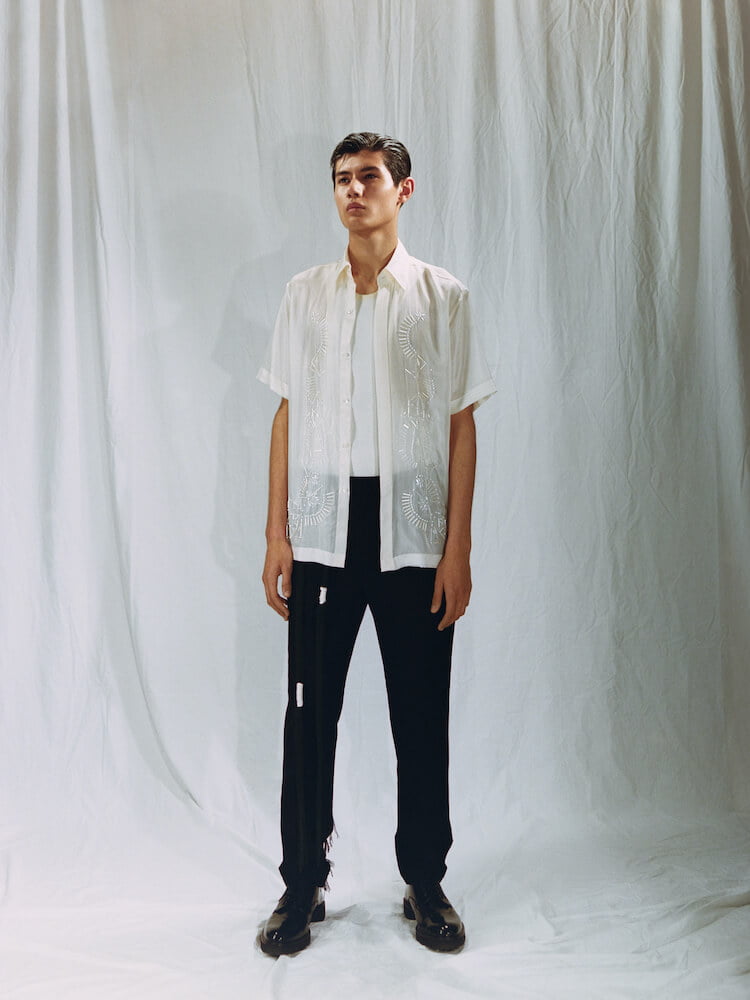 The collection allowed Talavera to translate his Filipino heritage into his work for the first time, too. Barong Tagalog shirts – usually made from pineapple fabric but here fashioned from silk – come hand-embroidered with beads in abstract florals that look to Philippines’ national Sampaguita flower and his father’s love of gardening.