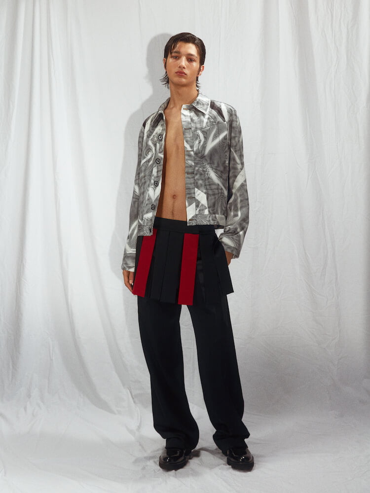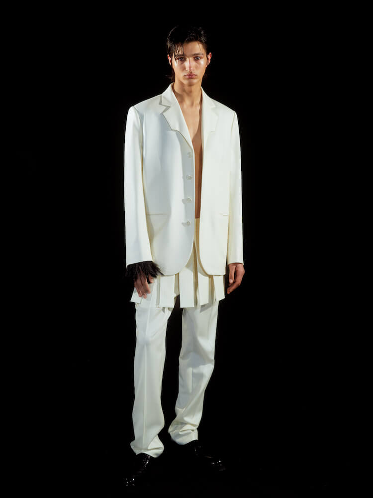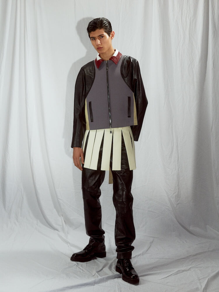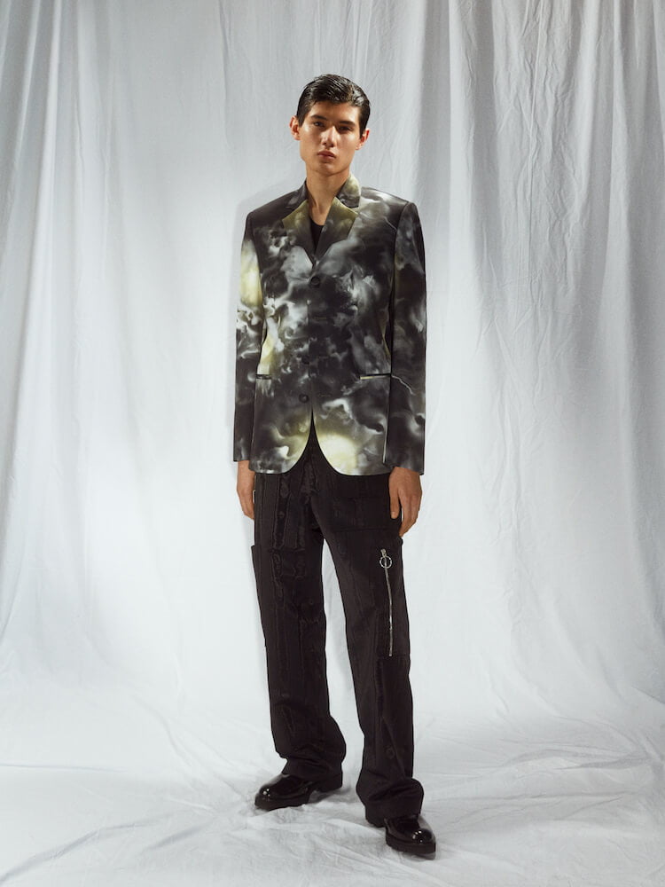 The pain of losing the man who shaped him awakened the British-Filipino talent to “follow the right path” to where he wants to be as a designer. “This is really a new starting point for me.” While grieving, Talavera set about reinterpreting his father’s clothes to envision a “wardrobe for him to take to paradise”. Starting with the leather jacket he always wore – “he had about 20 different ones. It was his uniform” – the designer cut his rendition tight and sculptural, with a dolman sleeve inspired by how a leather glove hugs the hand. Nicomede’s ballooning bombers prove a strong point, as does the brand’s tailoring. Suit jackets come equipped with Japanese jet pockets and the designer’s signature architectural lapel, now doused in an inky, bespoke cloud print that represents his father’s ascent into heaven.