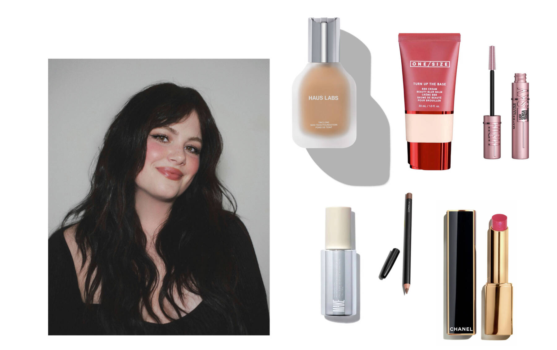 clockwise from top left: Triclone Skin Tech Medium Coverage Foundation with Fermented Arnica by Haus Labs by Lady Gaga, Turn Up The Base Blurring Foundation by One/Size, Lash Sensational Sky High Mascara by Maybelline New York, Rouge Allure Laque Lip Colour by Chanel Beauty, Lip Pencil in stone/greige by MAC Cosmetics, Hydrascape Moisturizing Reverse Emulsion by Make Beauty. Portrait courtesy of Alexandra French, photography courtesy of Chanel Beauty and Mac Cosmetics.