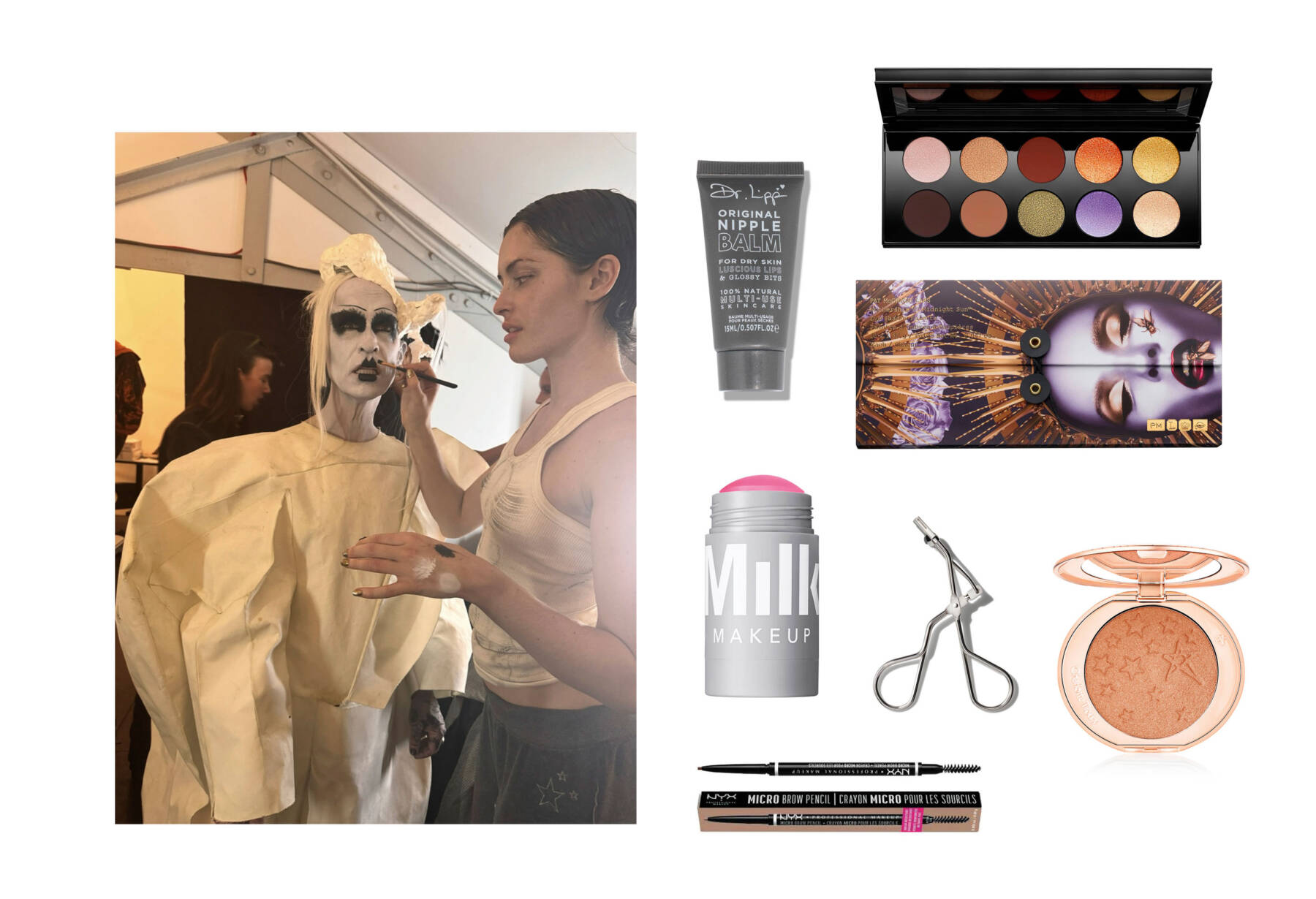 Portrait courtesy of Tilda Mace, photography courtesy of Pat McGrath labs, Charlotte Tilbury, Mac Cosmetic and Boots. Clockwise from top left: Original Nipple Balm by Dr. Lipp, Mothership VI: Midnight Sun Eyeshadow Palette by Pat McGrath Labs, Hollywood Glow Glide Face Architect Highlighter by Charlotte Tilbury, Demi Half Lash Curler by MAC Cosmetics, Micro Brow Pencil by NYX Professional Makeup, Multi-Use Lip + Cheek Cream Stick in Muse by Milk Makeup