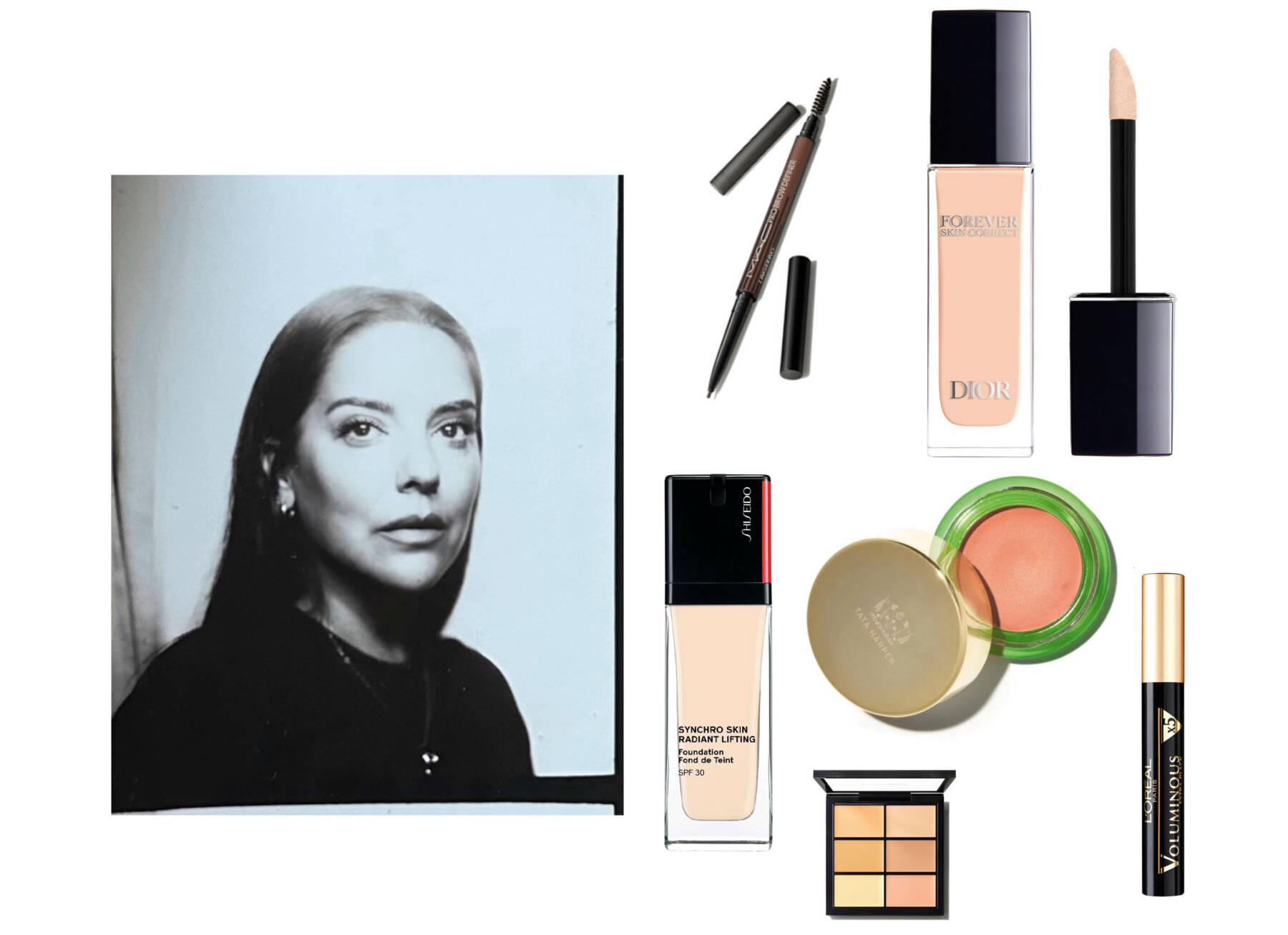 clockwise from top left: Pro Brow Definer 1mm Tip Brow Pencil by MAC Cosmetics, Forever Skin Correct by Dior Beauty, Vitamin-Infused Cream Blush by Tata Harper, Voluminous Mascara Carbon Black by L’Oréal Paris, Studio Fix Conceal and Correct Palette by MAC Cosmetics, Synchro Skin Radiant Lifting Foundation by Shiseido. Portrait courtesy of Jezz Hill, photography courtesy of Mac Cosmetics, Chanel Beauty and Boots