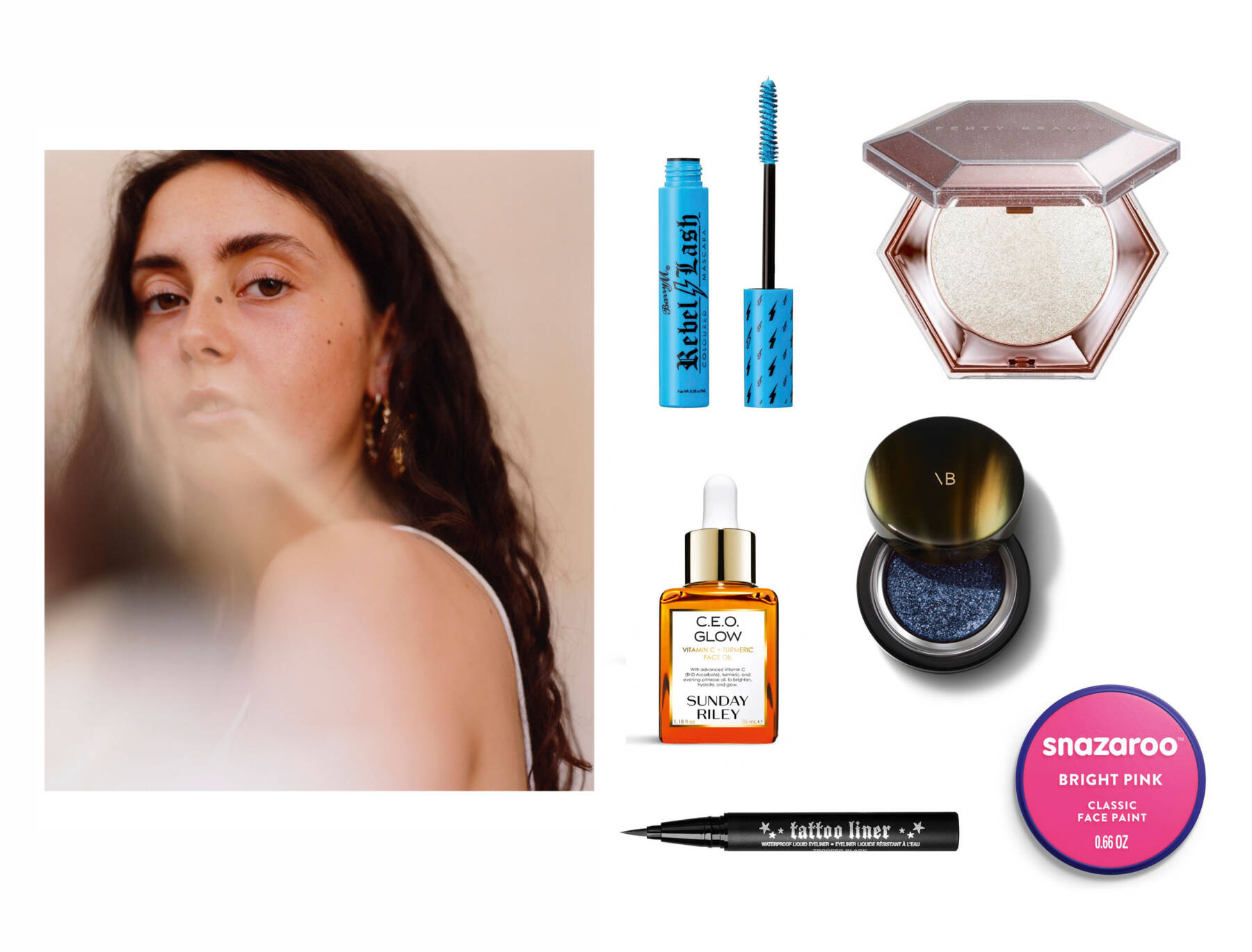 clockwise from top left: Rebel Lash Coloured Mascara in Babein’ Blue by Barry M, Diamond Bomb All-Over Diamond Veil by Fenty Beauty by Rihanna, Lid Lustre in Midnight by Victoria Beckham,Classic Face Paint in bright pink by Snazaroo, Beauty Tattoo Liner in trooper black by KVD Beauty, C.E.O. Glow Vitamin C and Turmeric Face Oil by Sunday Riley. Portrait courtesy of Chloe Le Drezen, photography courtesy of Boots, Victoria Beckham Beauty and Selfridges