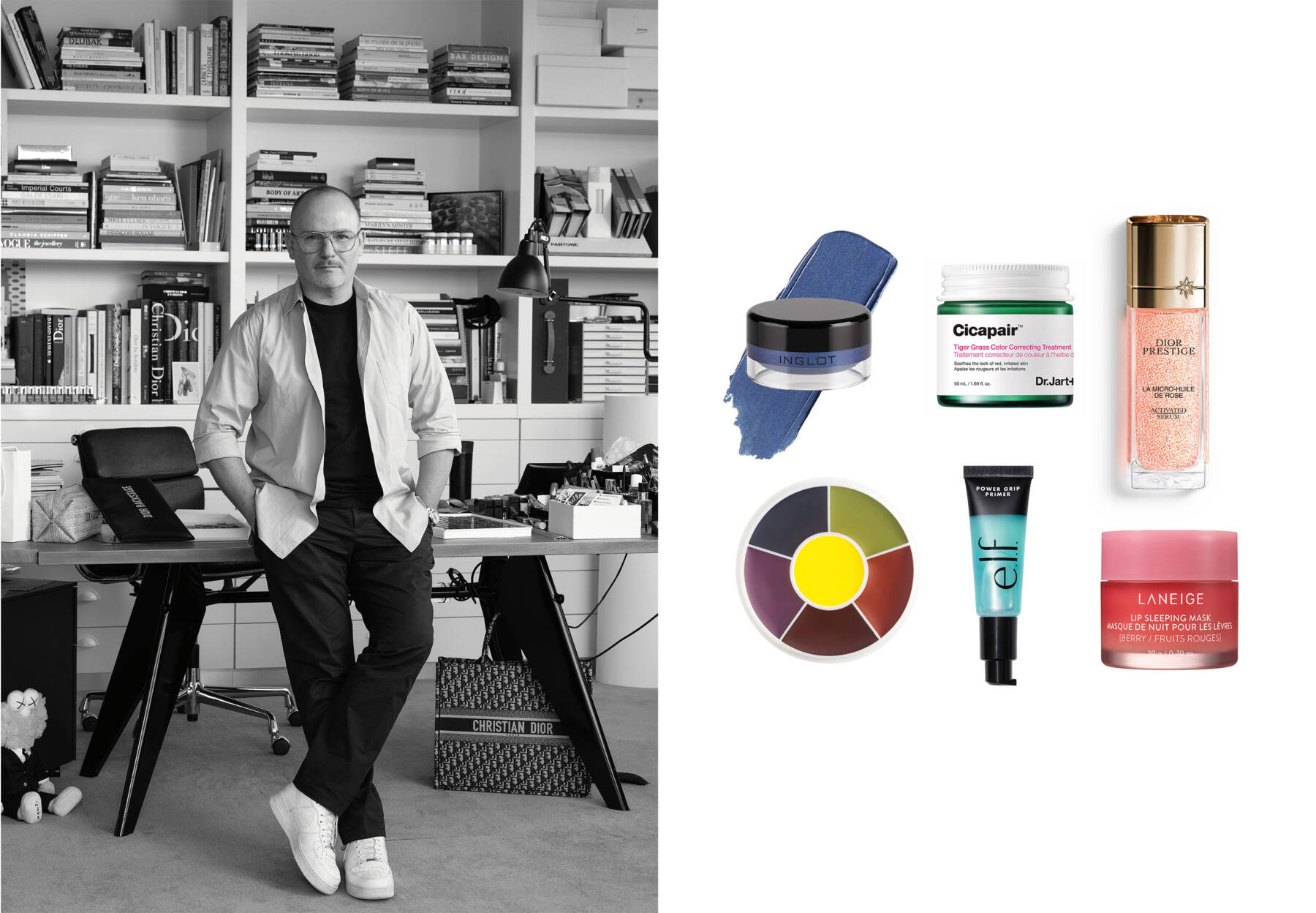 clockwise from top left: AMC Eyeliner Gel by Inglot, Cicapair Tiger Grass Color Correcting Treatment by Dr. Jart+, Dior Prestige La Micro-Huile de Rose Activated Serum by Dior Beauty, Lip Sleeping Mask by Laneige, Power Grip Primer by e.l.f., Professional Wheels by Ben Nye. Portrait courtesy of Brigitte Lacombe for Christian Dior Pafums