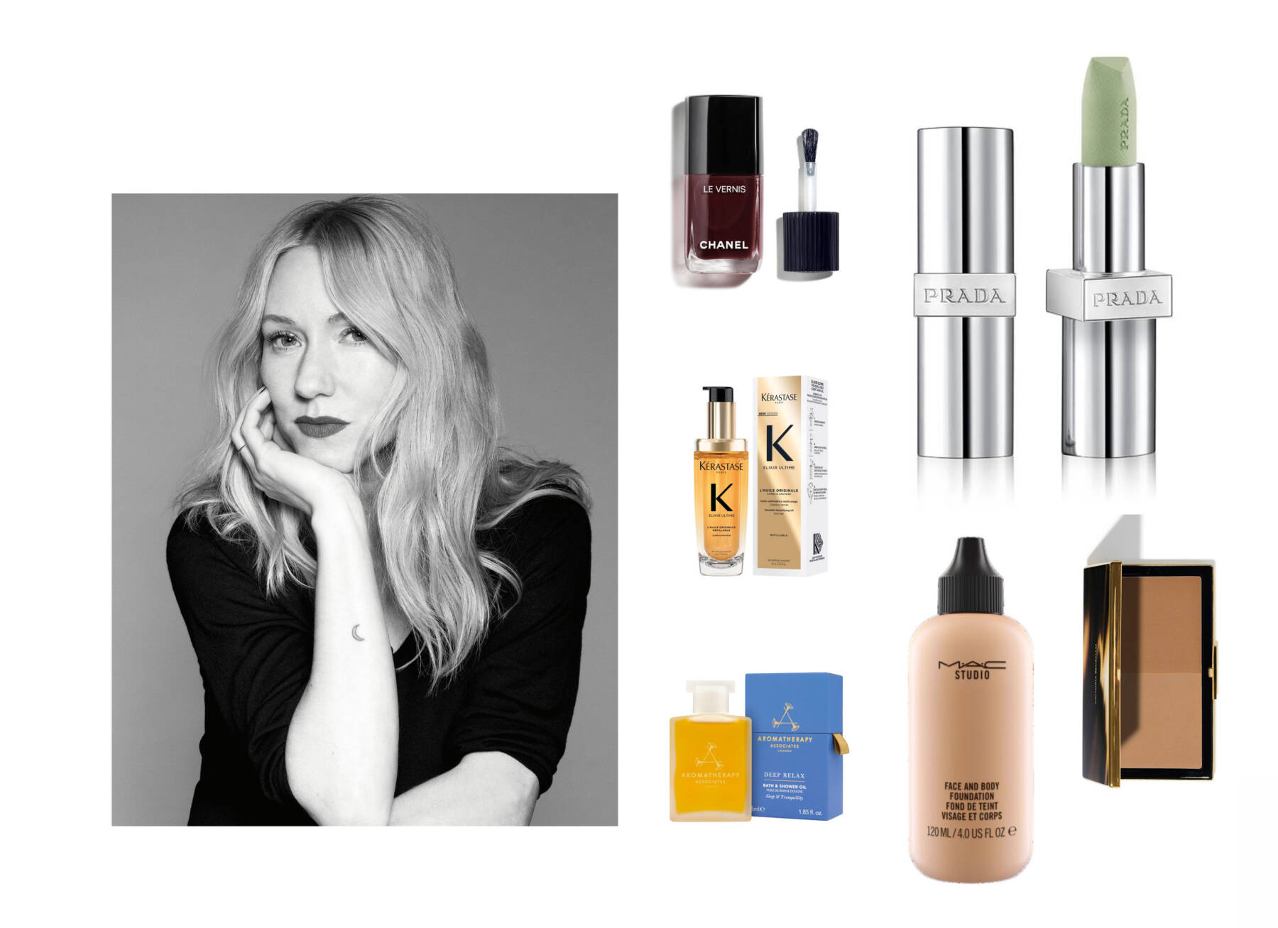 clockwise from top left: Le Vernis in rouge noir by Chanel Beauty, Universal Lip Care by Prada Beauty, Matte Bronzing Brick by Victoria Beckham, Face and Body Foundation by MAC Studio, Deep Relax Bath & Shower Oil by Aromatherapy Associates, Elixir Ultime Hair Oil L’Huile Originale Refillable by Kérastase. Portrait courtesy of TM Elkam, photography courtesy of Chanel, Victoria Beckham Beauty, Prada Beauty and Mac Cosmetics.