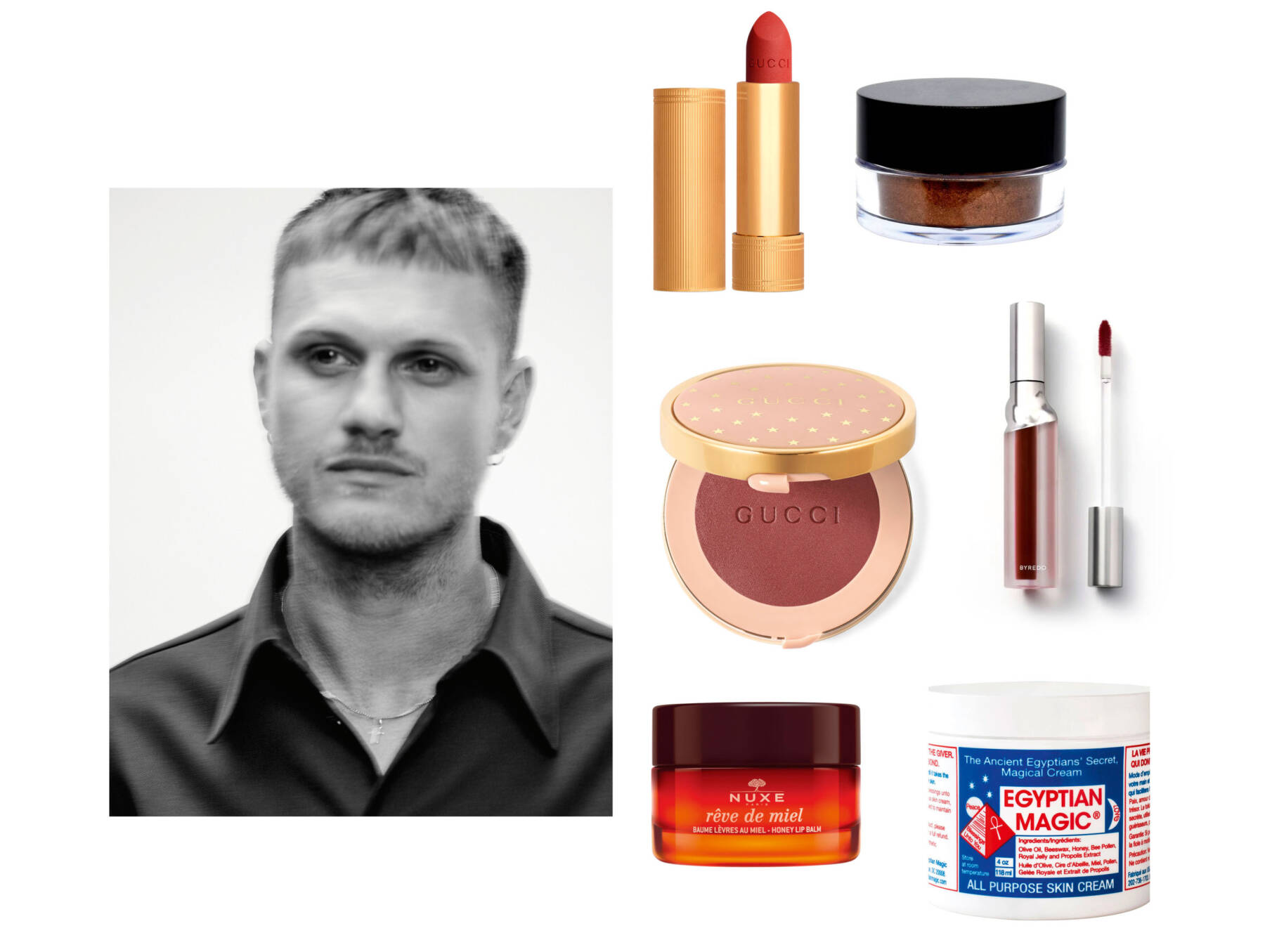 clockwise from top left: Rouge à Lèvres Mat Lipstick by Gucci Beauty, Eyeshadow Pearl in 26 bronze by Mitsuyoshi, Liquid Lipstick Matte in marriage by Byredo, Skin Cream Egyptian Magic, Reve de Miel Honey Lip Balm by Nuxe, Blush de Beauté by Gucci Beauty. Portrait courtesy of Lea Colombo, photography courtesy of Selfridges, Coty and Boots.
