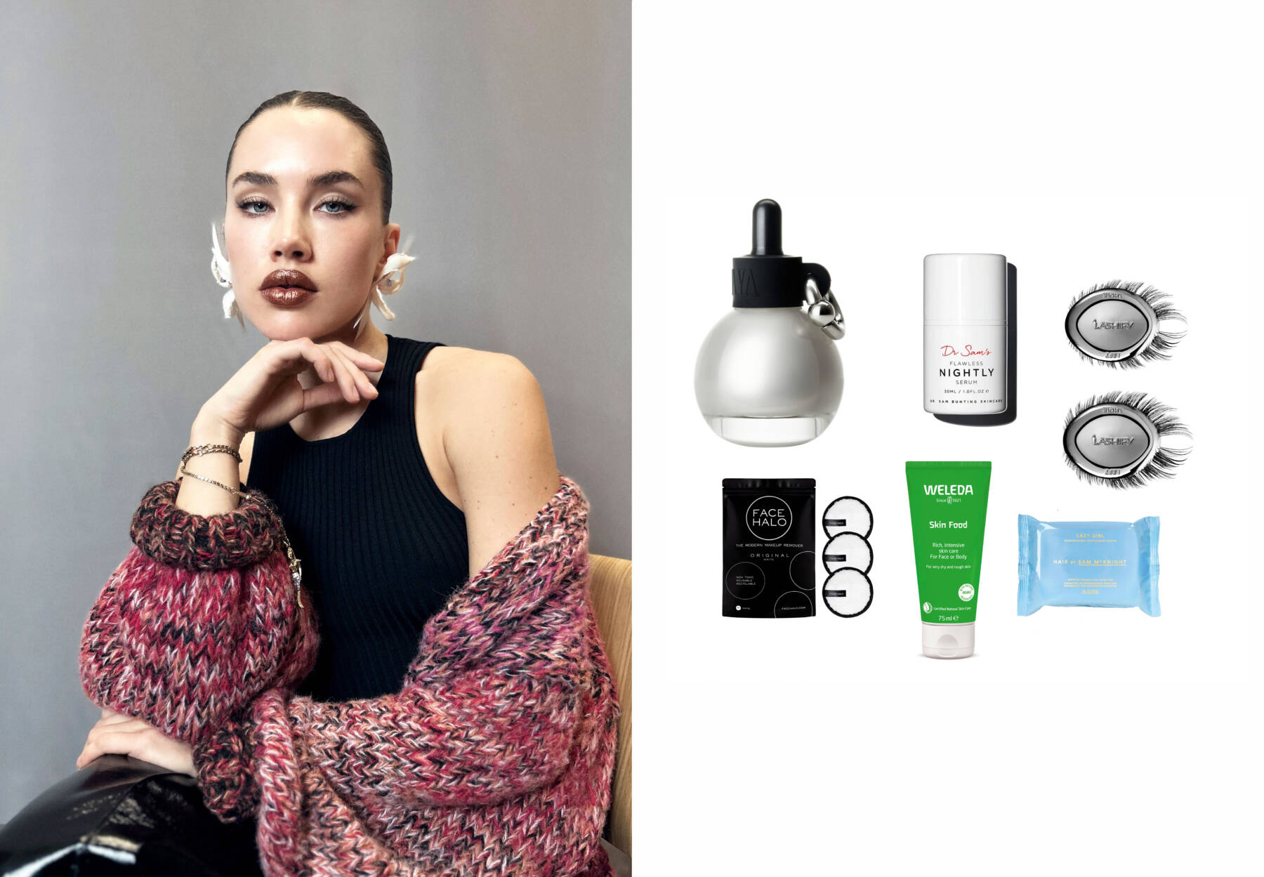 clockwise from top left: Skinlacq Triple Hyaluronic Glow Serum by Isamaya Beauty, Flawless Nightly Serum by Dr Sam’s, Edge Lash Control Kit by Isamaya x Lashify, Lazy Girl Hair Cleanse Cloths by Hair by Sam McKnight, Skin Food by Weleda, Make-up Remover Pad by Face Halo Portrait courtesy of Isamaya Ffrench, photography courtesy of Isamaya Beauty and Boots.