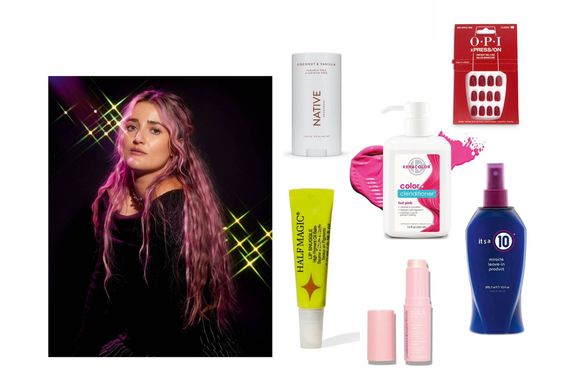 clockwise from top left: Cocoa & Vanilla by Native Deodorant, Color + Clenditioner in pink by Keracolor, xPress/On Artificial Nails by OPI, Miracle Leave-in Product by It’s a 10, Rose Glow & Get it Cooling and Brightening Eye Balm by Tula Skincare, Lip Snuggle High Pigment Oil-Balm by Half Magic. Portrait courtesy of Doniella Davy, photography courtesy of John Lewis & Partners