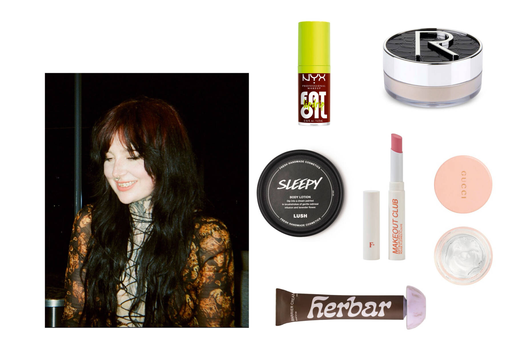 clockwise from top left: Fat Lip Oil Drip in brown by NYX Professional Makeup, Glass Powder by Rodial, Makeout Club Lipstick by Freck Beauty, Éclat De Beauté Effet Lumière Multi-Use Gel Face Gloss by Gucci Beauty, The Barrier Cream by Herbar, Sleepy Body Lotion by Lush. Portrait courtesy of Lauren Reynolds, photography courtesy of Selfridges, Coty and Lush