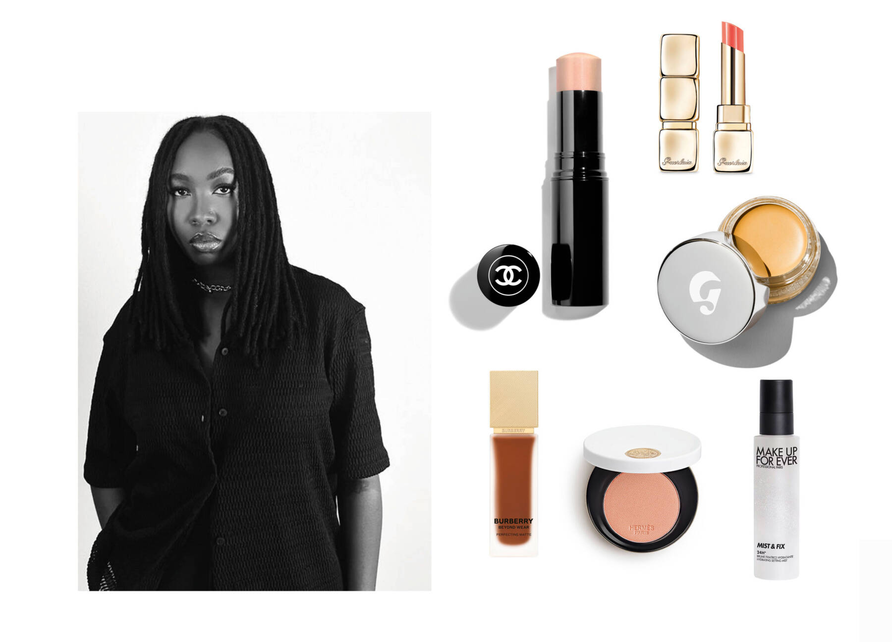 clockwise from top left: Baume Essential (Transparent) by Chanel Beauty, Kiss Kiss Shine Bloom (309 Fresh Coral) by Guerlain, Stretch Balm Concealer by Glossier, Mist & Fix by Make Up For Ever, Silky Blush Rose Ambré by Rose Hermès, Beyond Wear Perfecting Matte Foundation by Burberry. Portrait courtesy of Aurore Gabriel, photography courtesy of Chanel, John Lewis & Partners, Glossier, Hermes and Coty.