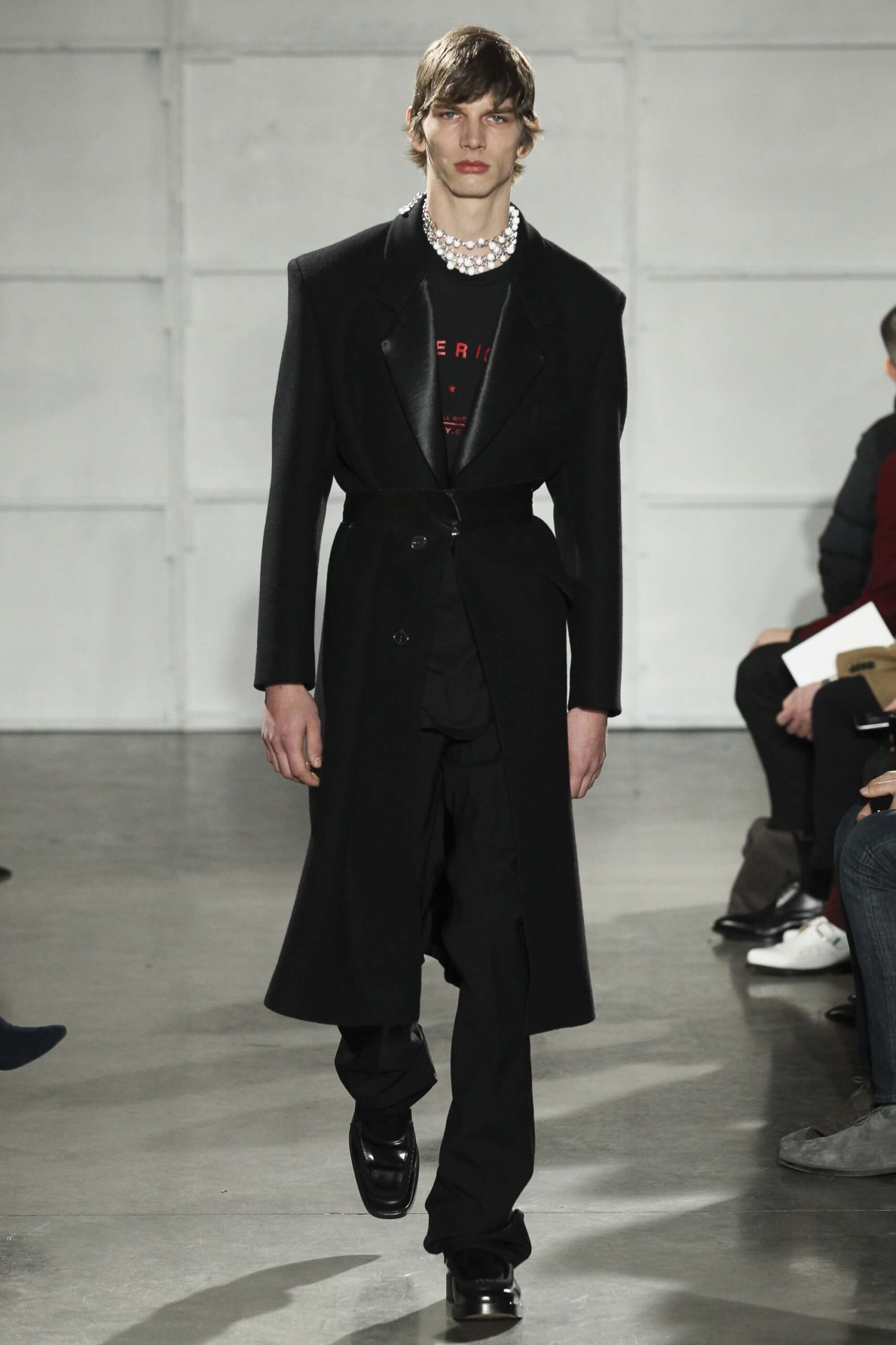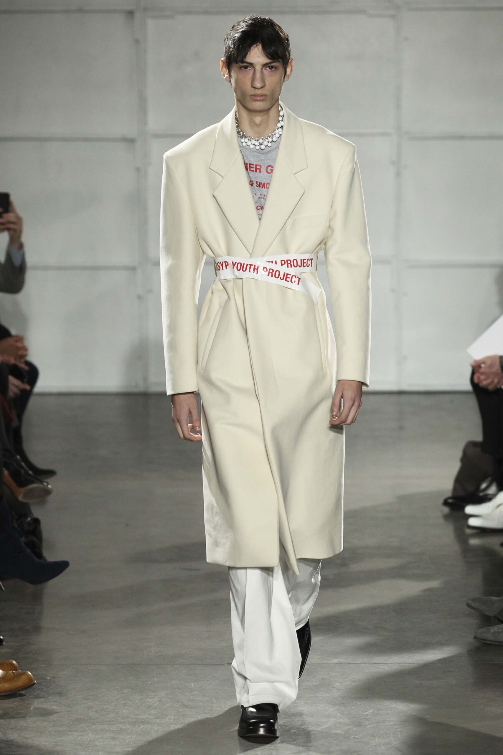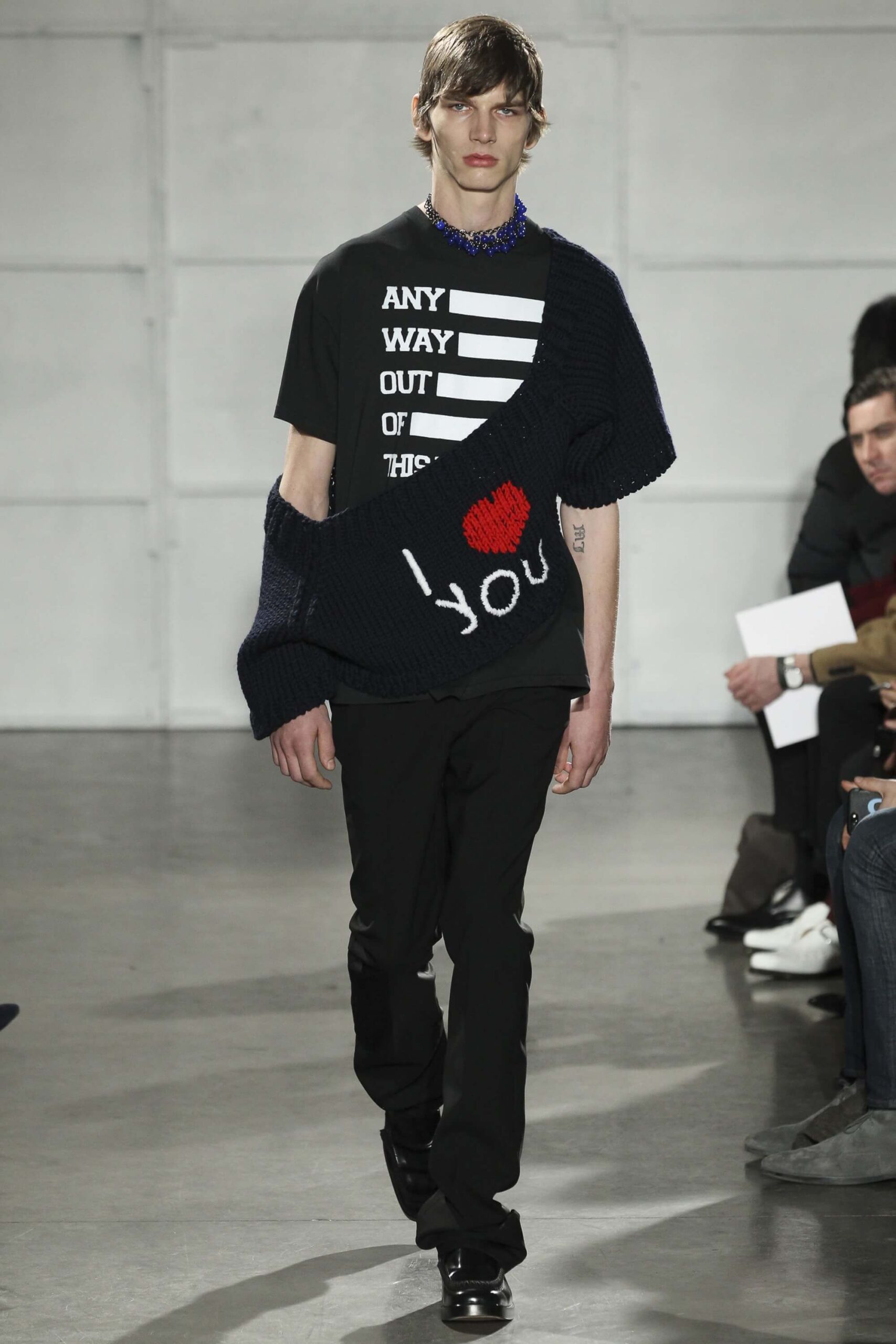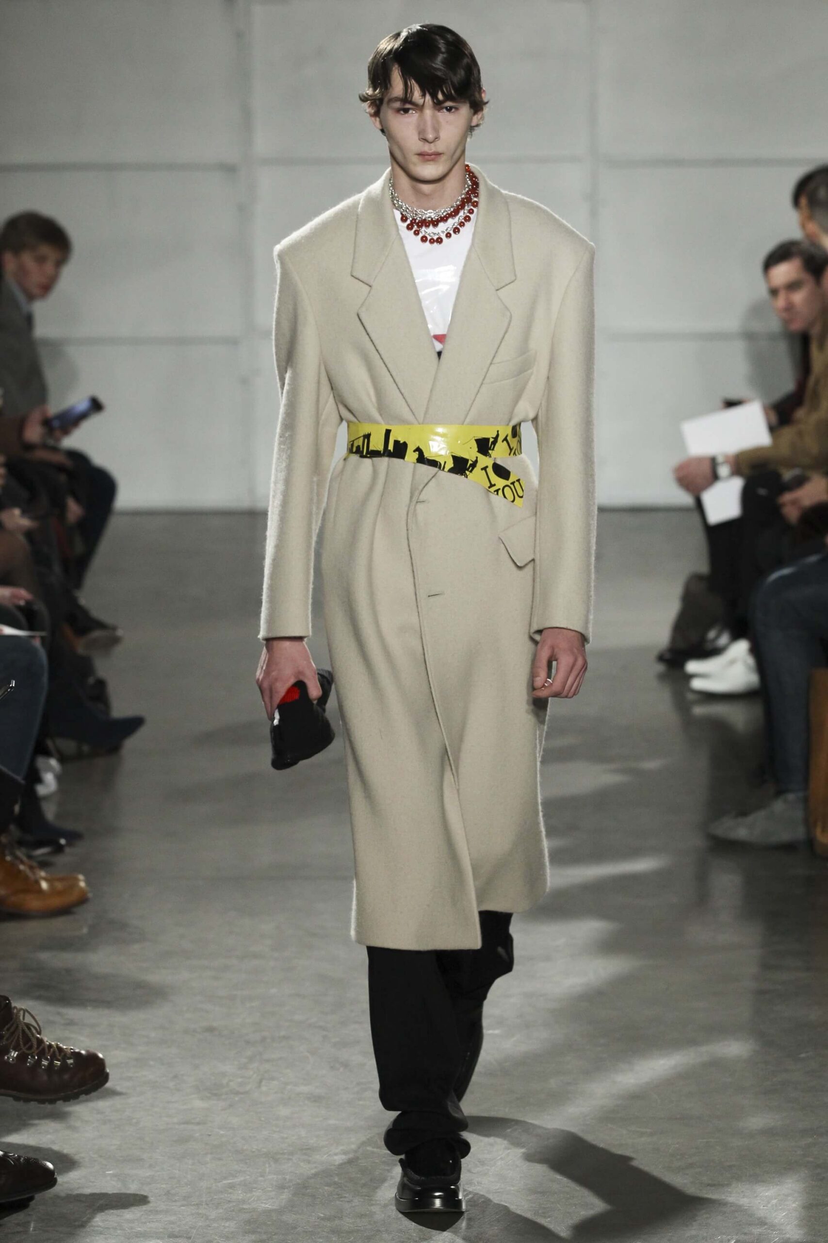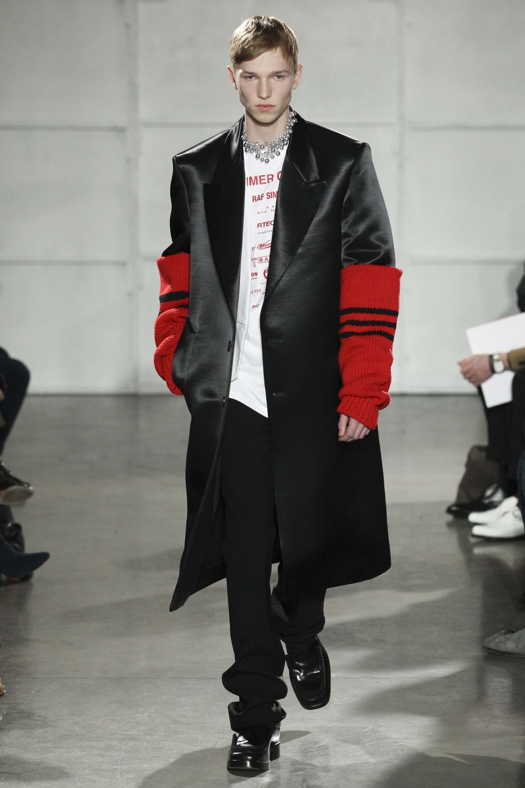 As you probably know, Mr Simons has taken over the Calvin Klein, showing next week. How appropriate, then, that last night he showed his men’s collection in the city of New York. Exploring his new life and new world. The masculine collection was grown up yet not mature. Cropped stretched knits with I HEART NY seemed worn in, adored by its former owners. Maybe from a different time or with a former president. Utilitarian military shirts were oversized, creating a kind of naive army of boys. Mr Simons is never shy to create an architectural silhouette but in New York this college boy of a former season had come of age. He had taken his dads crombie coat and moms Dior beaded necklace and left Paris for good. Coming to America to be a man. And got through that US border before the laws of old ideas changed the world again.