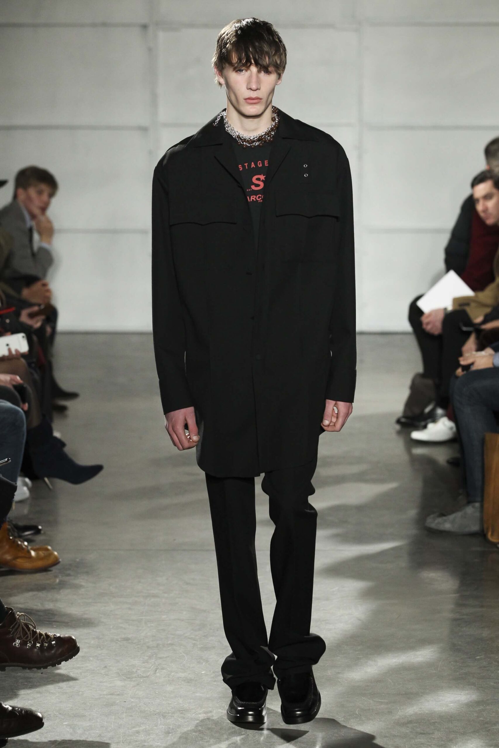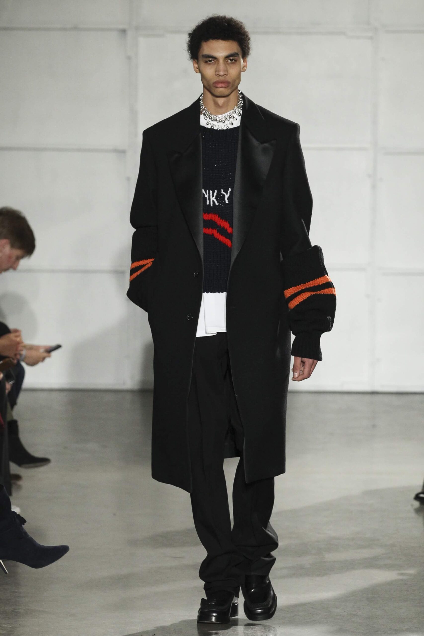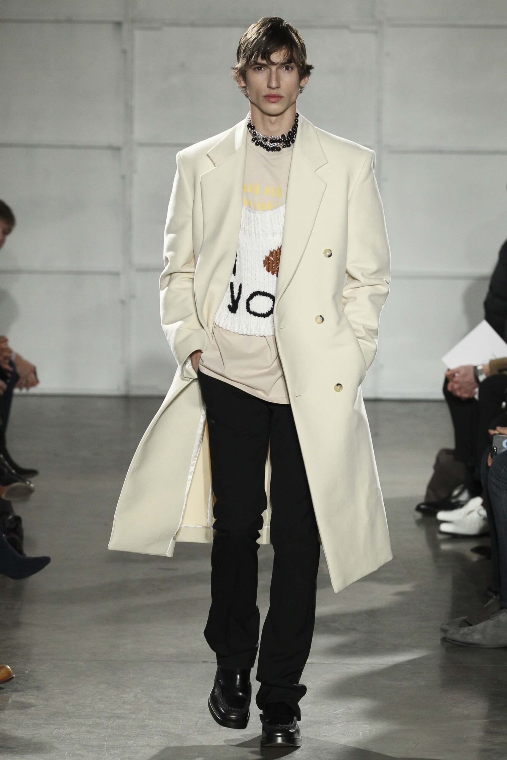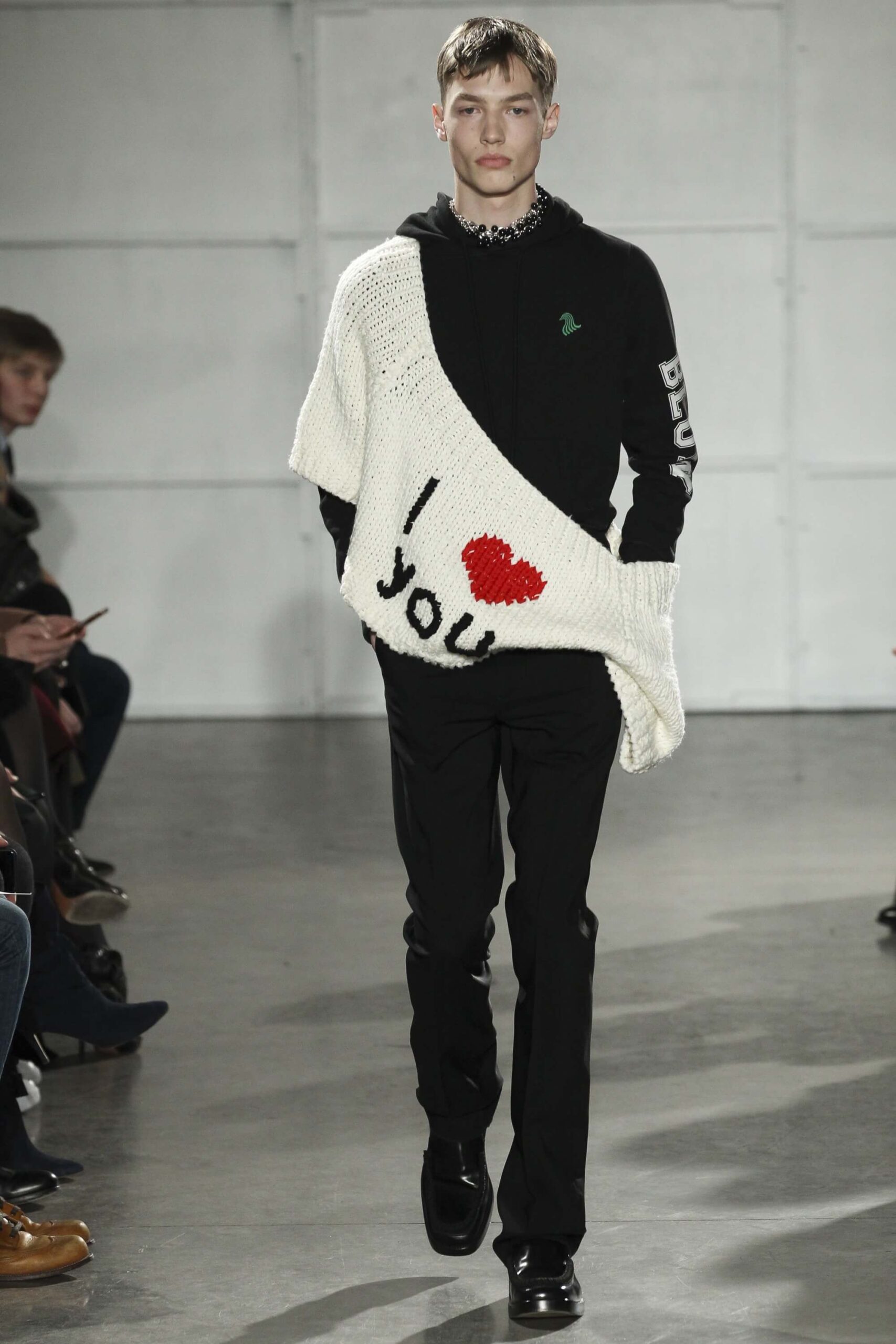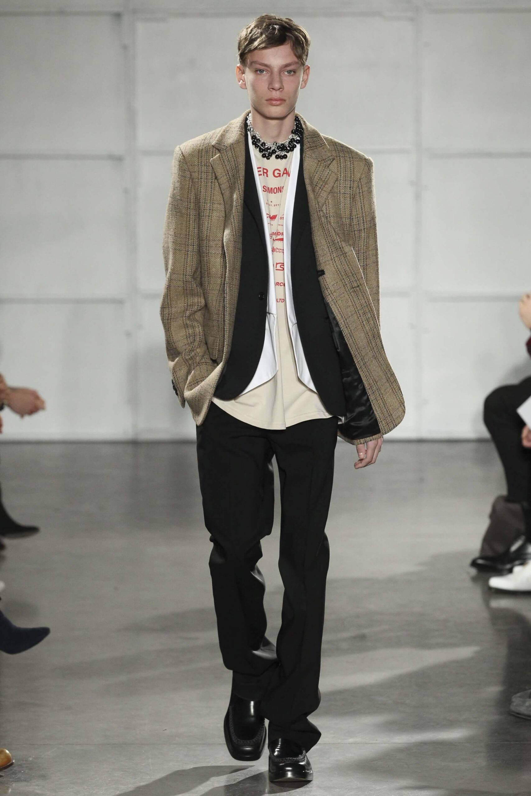 As you probably know, Mr Simons has taken over the Calvin Klein, showing next week. How appropriate, then, that last night he showed his men’s collection in the city of New York. Exploring his new life and new world. The masculine collection was grown up yet not mature. Cropped stretched knits with I HEART NY seemed worn in, adored by its former owners. Maybe from a different time or with a former president. Utilitarian military shirts were oversized, creating a kind of naive army of boys. Mr Simons is never shy to create an architectural silhouette but in New York this college boy of a former season had come of age. He had taken his dads crombie coat and moms Dior beaded necklace and left Paris for good. Coming to America to be a man. And got through that US border before the laws of old ideas changed the world again.