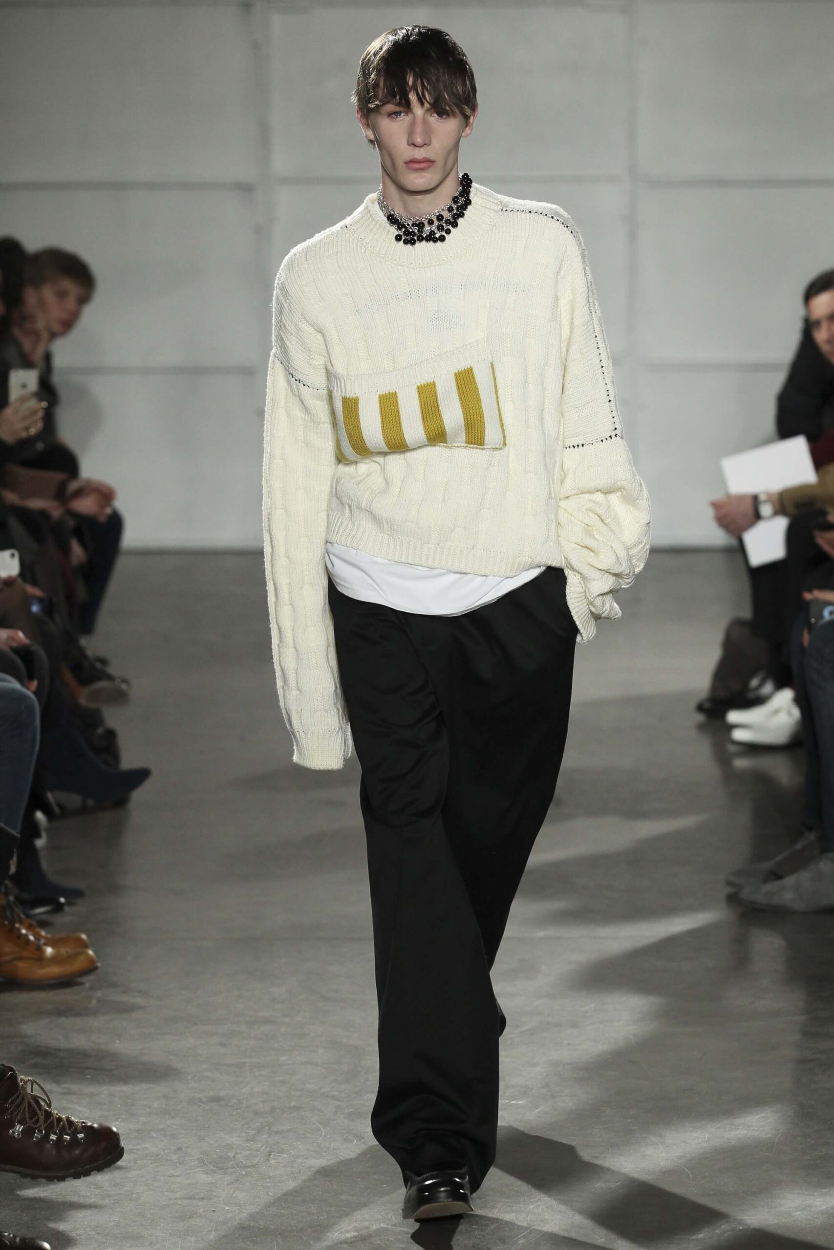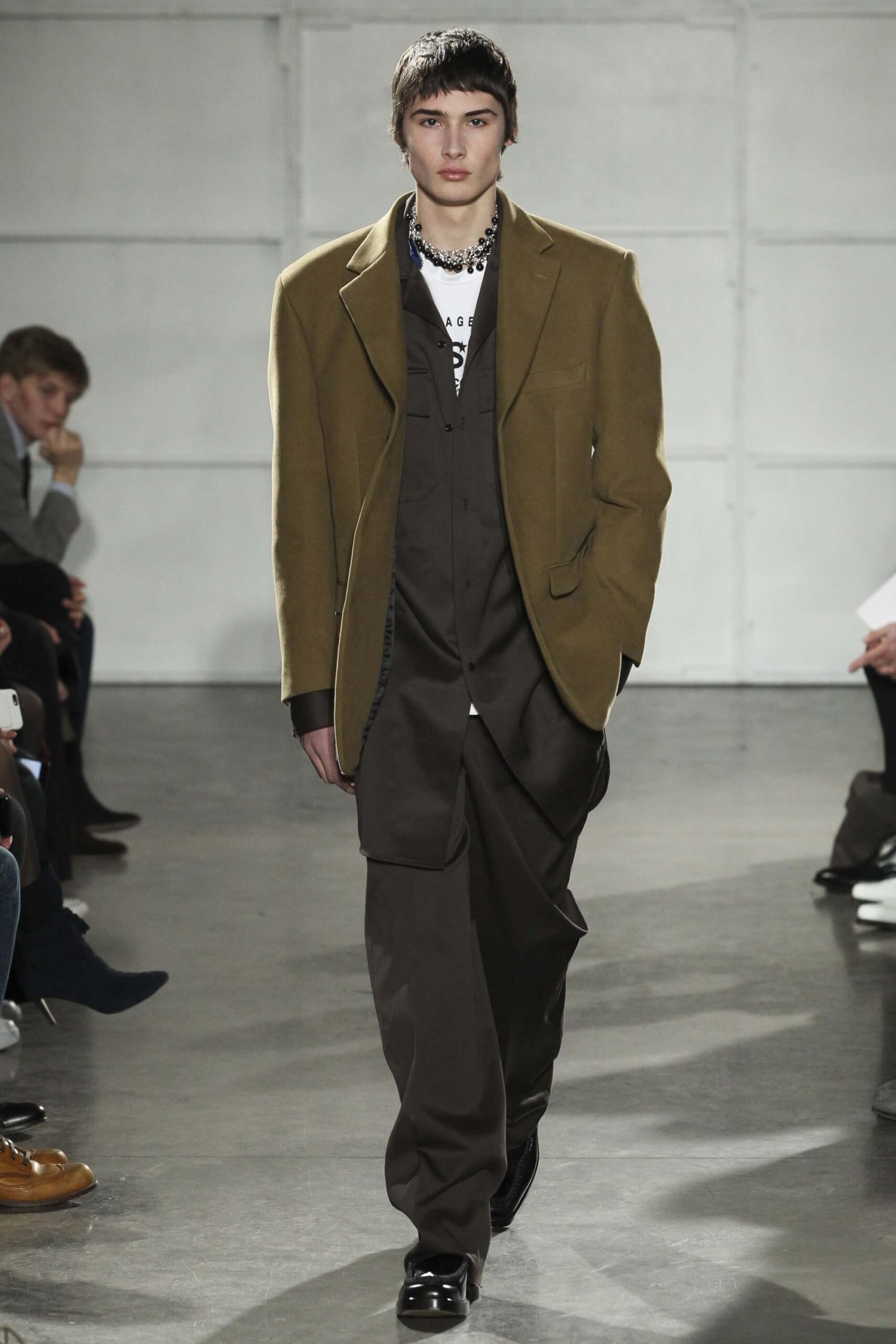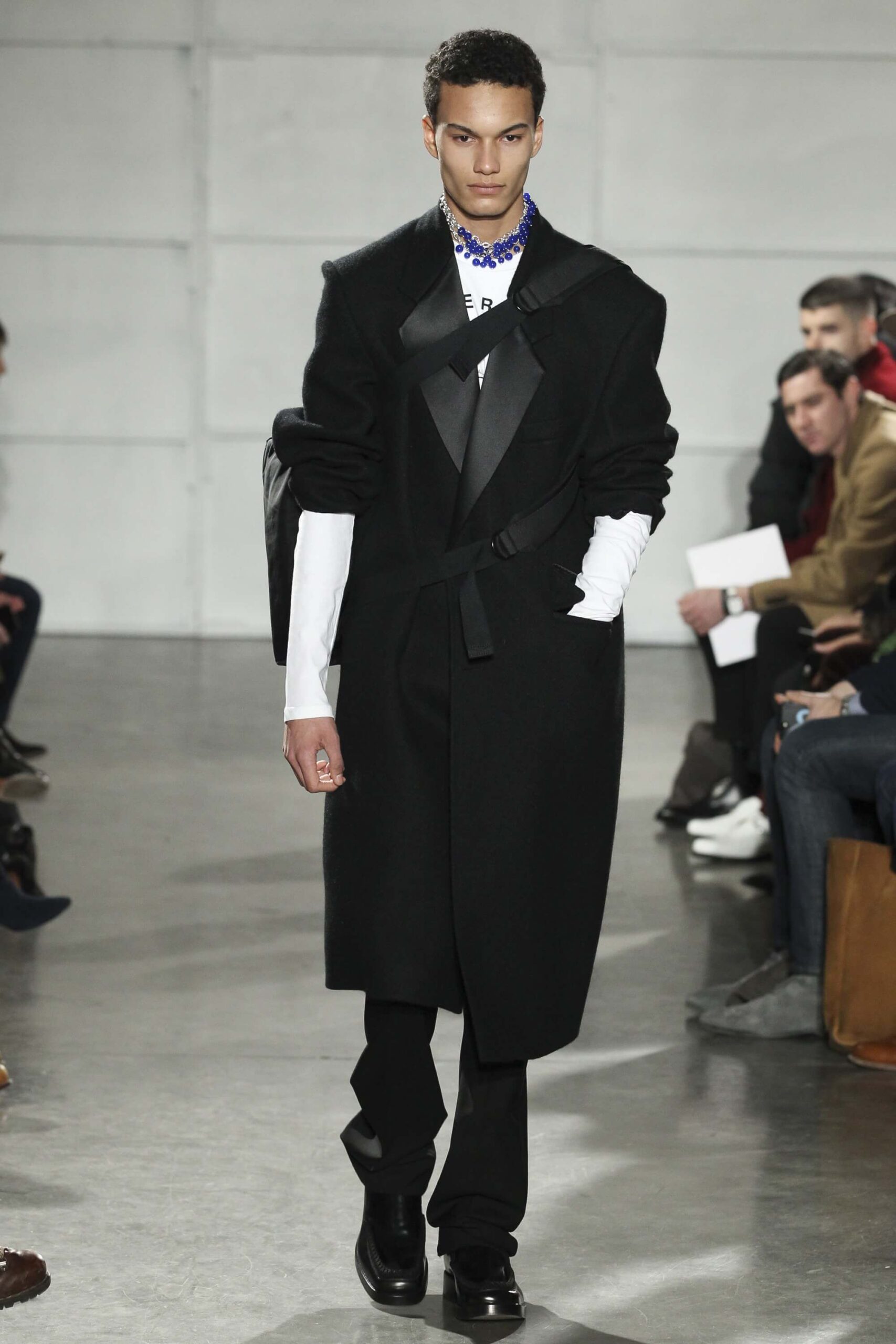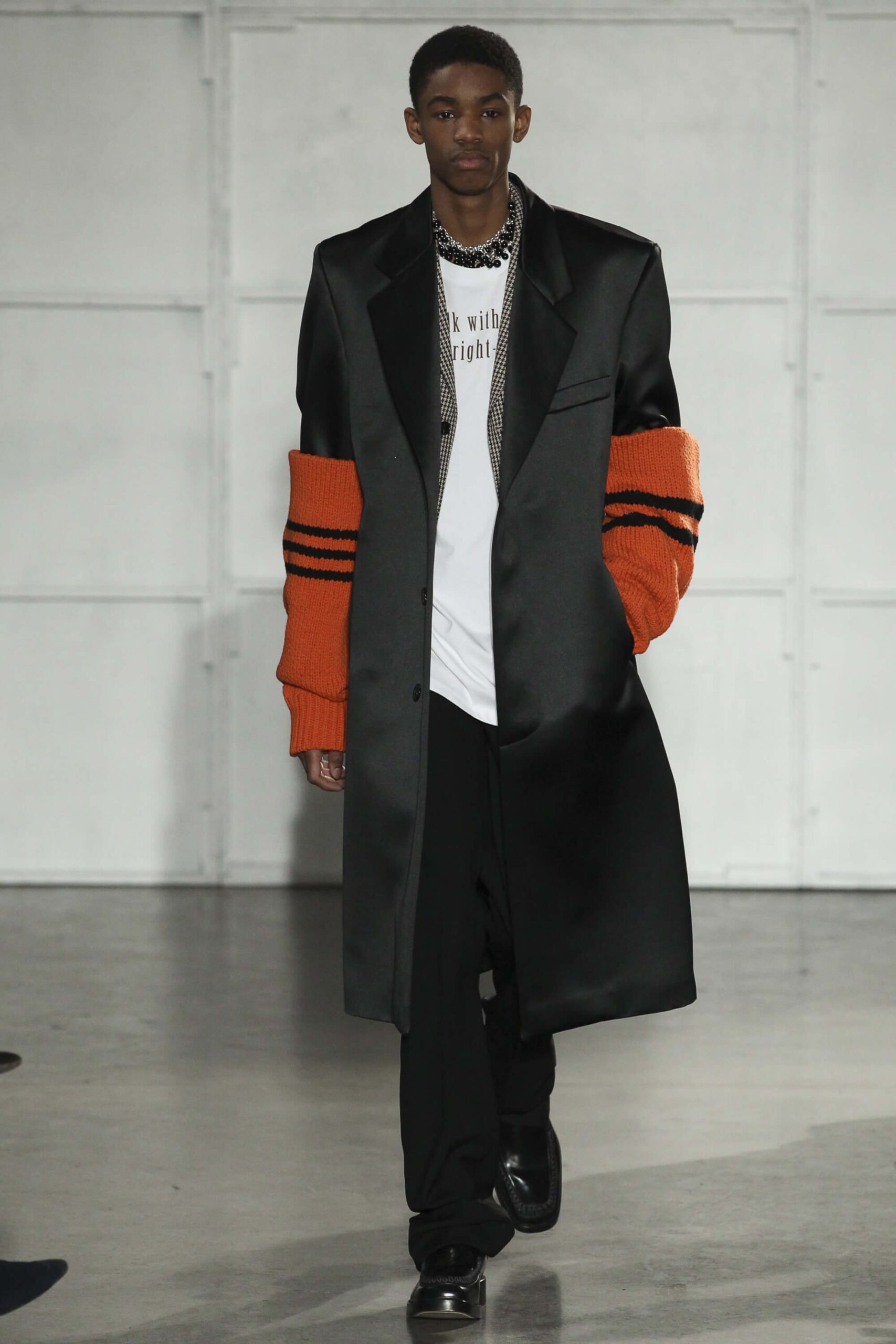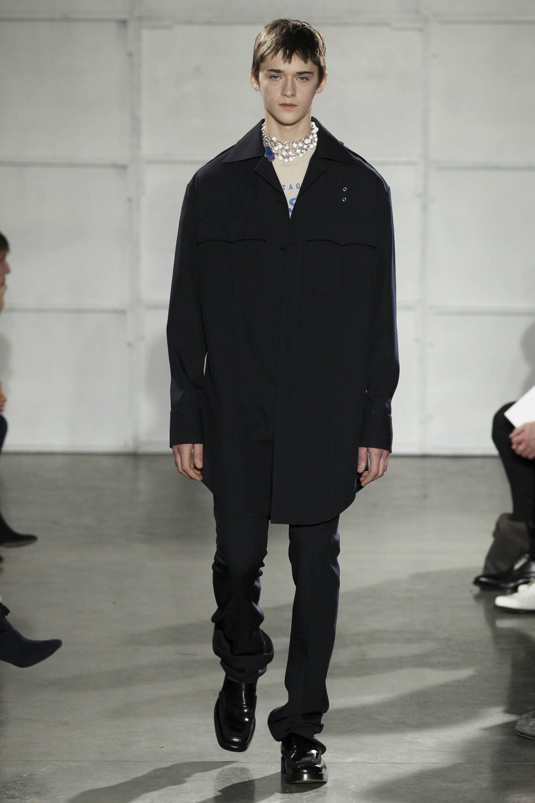 As you probably know, Mr Simons has taken over the Calvin Klein, showing next week. How appropriate, then, that last night he showed his men’s collection in the city of New York. Exploring his new life and new world. The masculine collection was grown up yet not mature. Cropped stretched knits with I HEART NY seemed worn in, adored by its former owners. Maybe from a different time or with a former president. Utilitarian military shirts were oversized, creating a kind of naive army of boys. Mr Simons is never shy to create an architectural silhouette but in New York this college boy of a former season had come of age. He had taken his dads crombie coat and moms Dior beaded necklace and left Paris for good. Coming to America to be a man. And got through that US border before the laws of old ideas changed the world again.