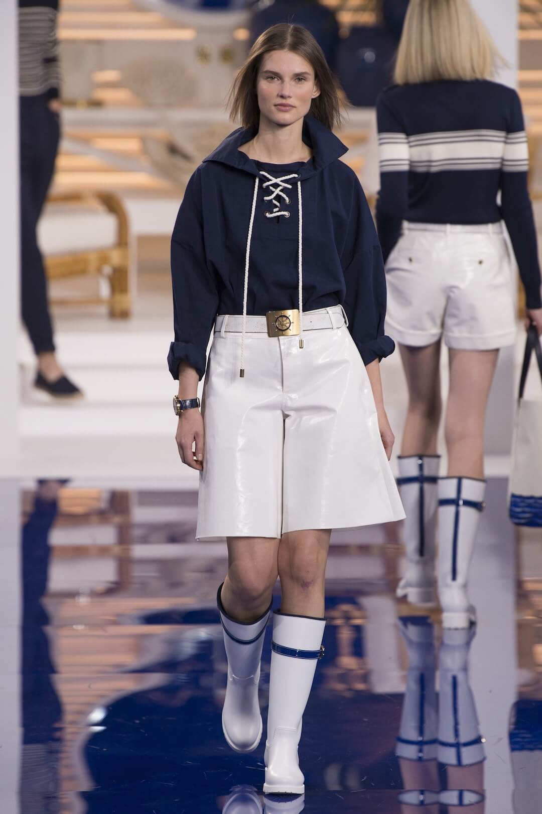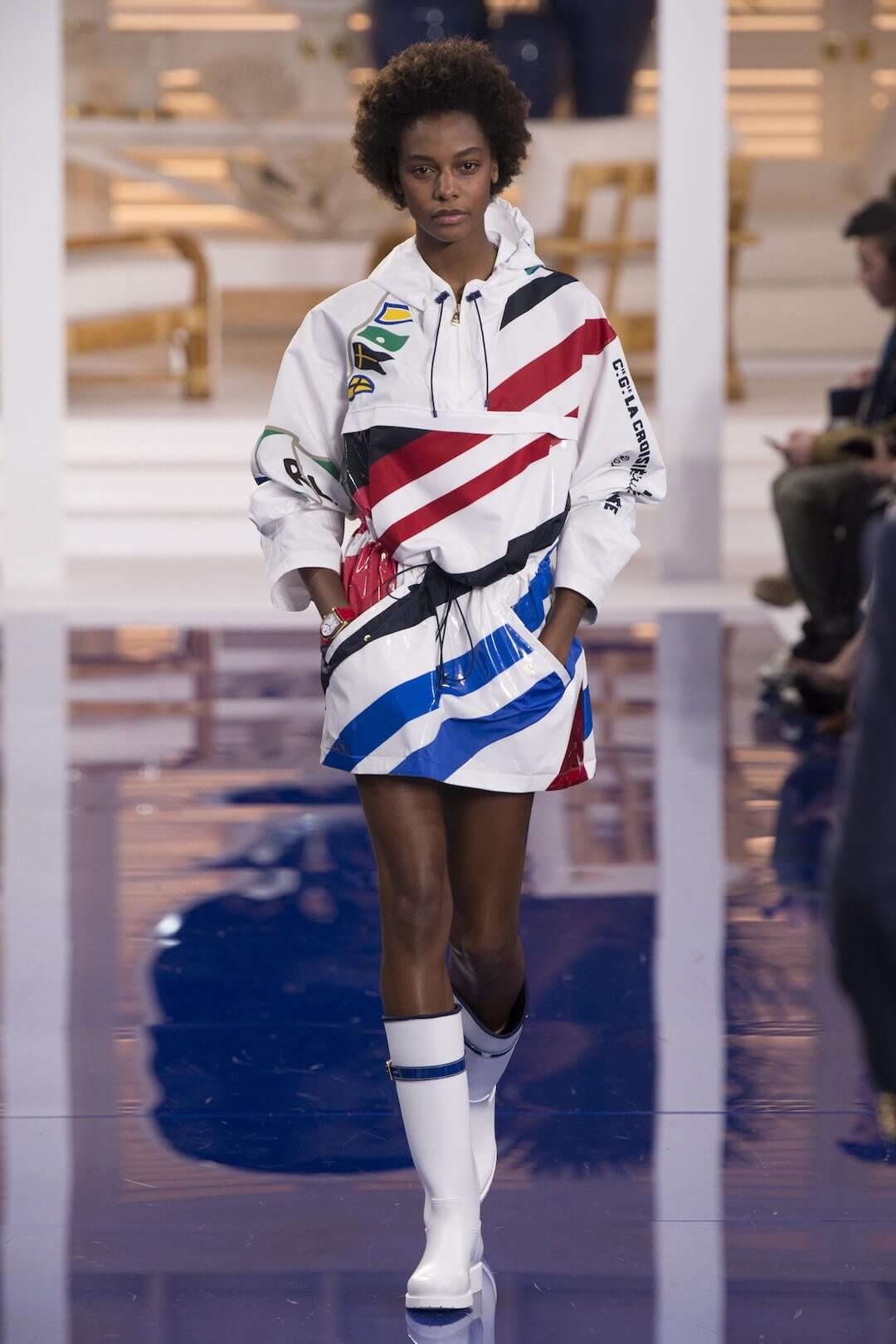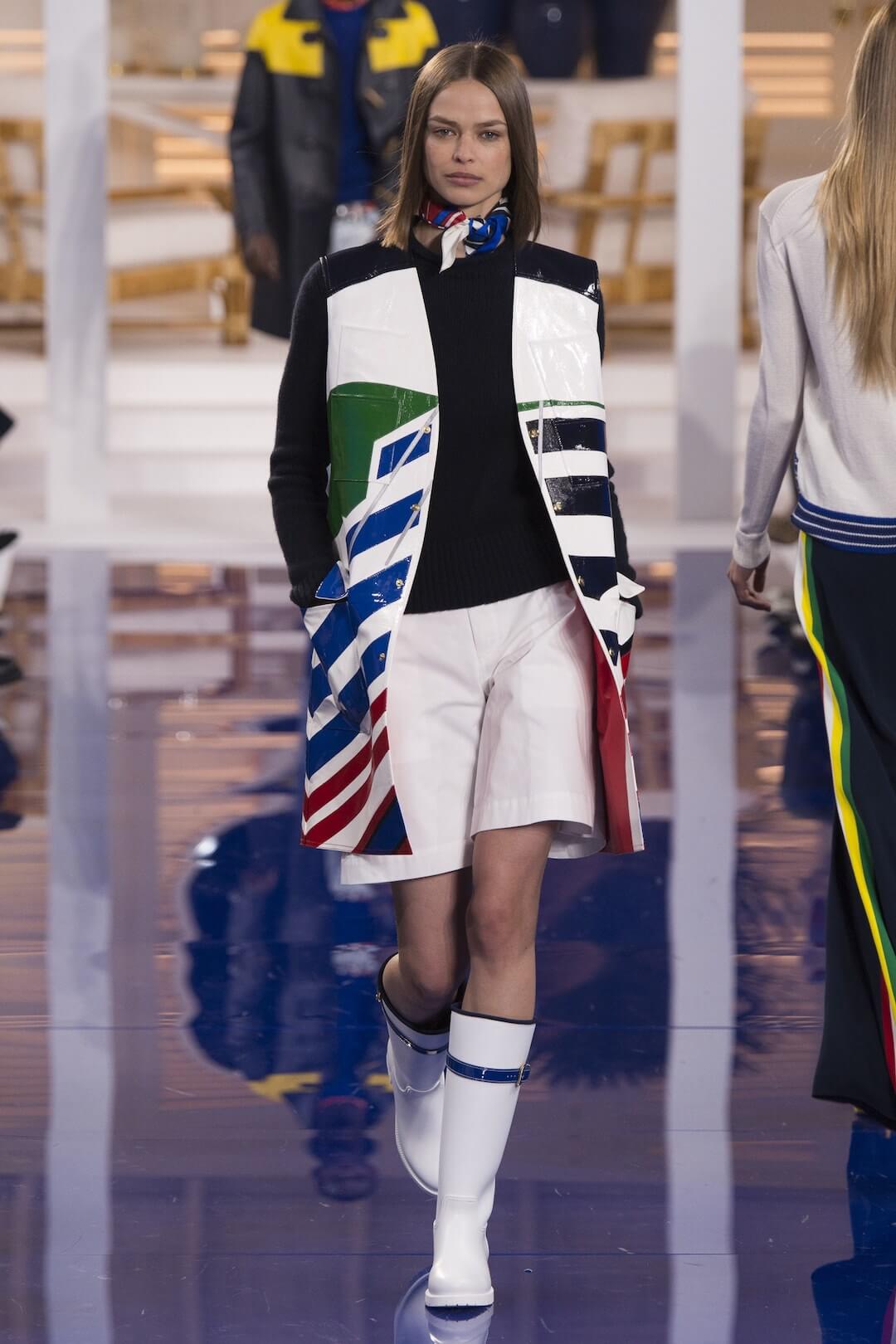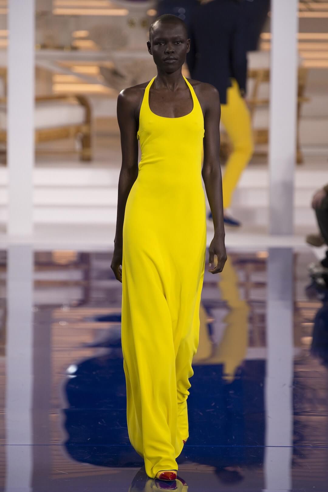 And so, back in New York for the Spring 2018 show, the girls were barefoot, reggae vibing, setting the tone for a day by the sea in swishy summer cotton dresses, bandanas tied round the waist, island life. Soothing. Girls got practical, changing into gumboots, shorts and shiny cotton canvas jackets, going fishing. And then they were off to Ralph’s royal motor yacht club, members only, like an episode of Revenge – were they secretly planning to kill each other? It was preppy too, like a good all American Ralph Lauren collection should be, impeccable ivory pant suits, dressed for dinner in deck shoes and flattering evening gowns in Jamaican yellow and green that skimmed the body. This was the good life, not for mere mortals.