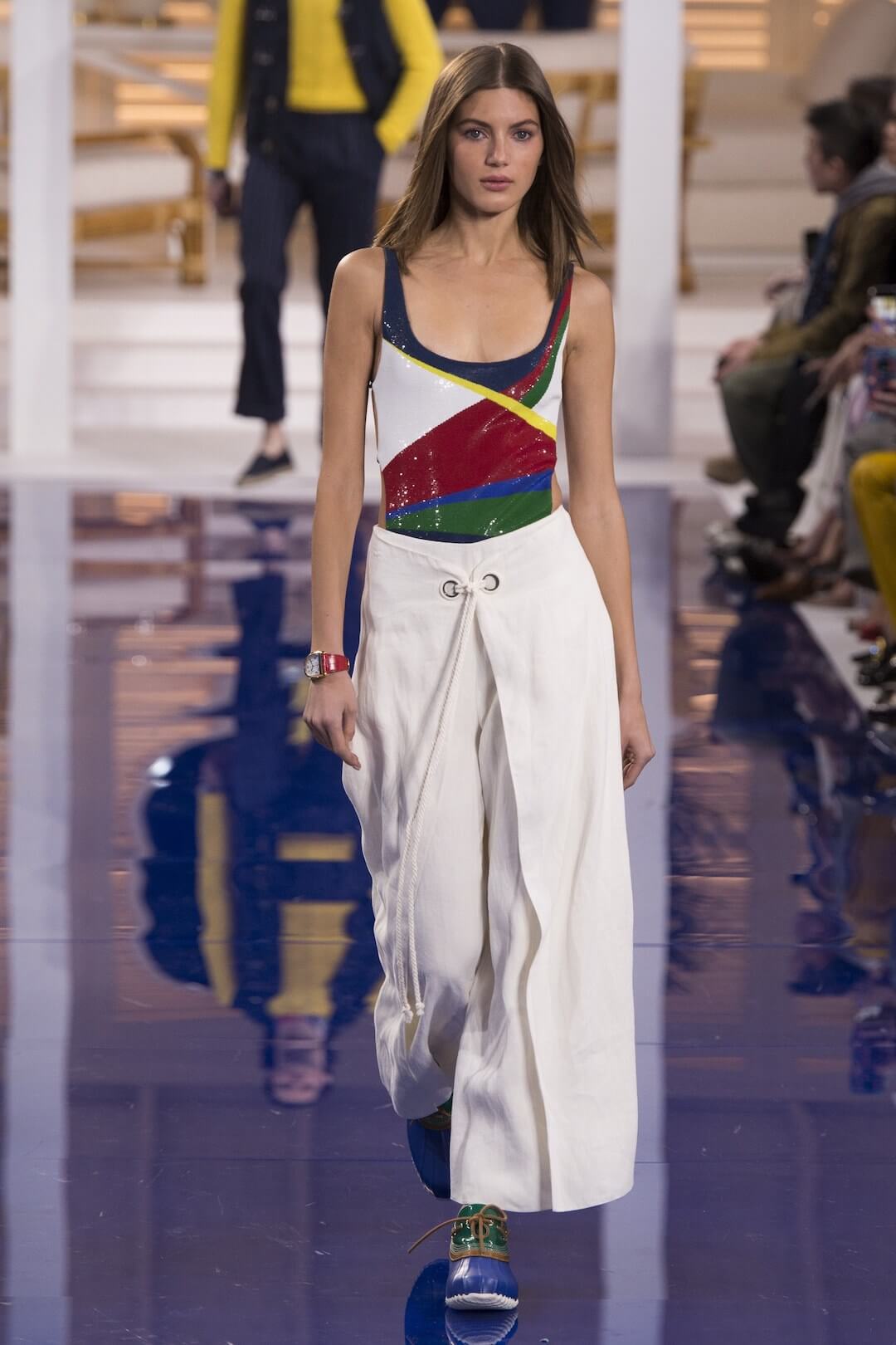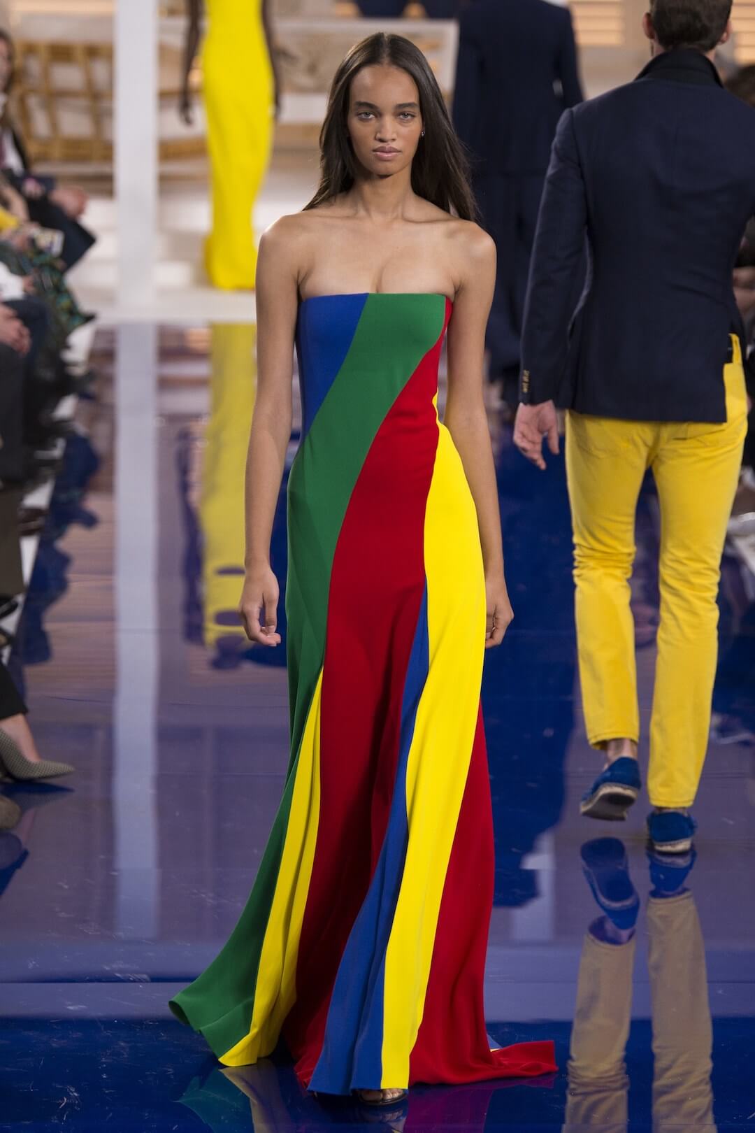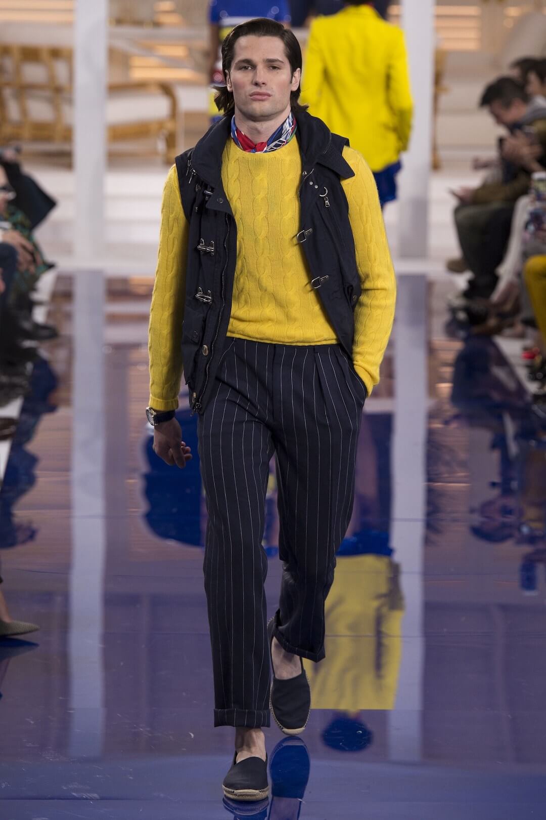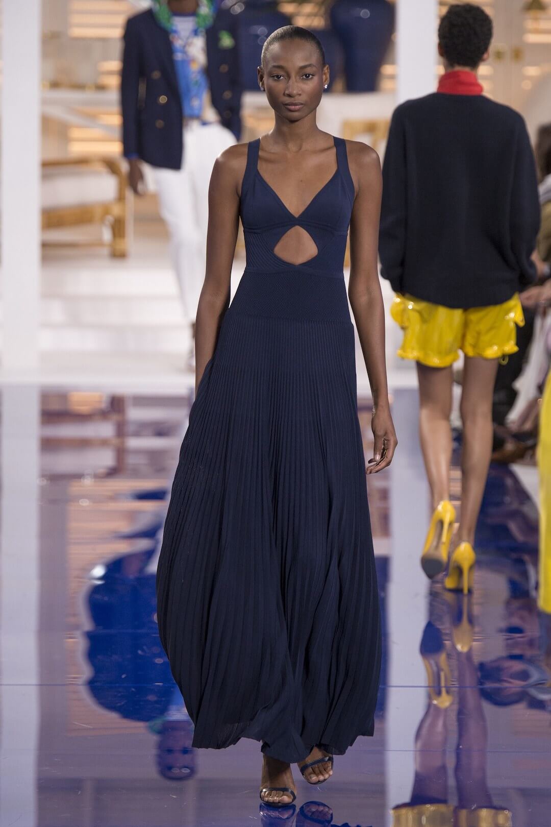 And so, back in New York for the Spring 2018 show, the girls were barefoot, reggae vibing, setting the tone for a day by the sea in swishy summer cotton dresses, bandanas tied round the waist, island life. Soothing. Girls got practical, changing into gumboots, shorts and shiny cotton canvas jackets, going fishing. And then they were off to Ralph’s royal motor yacht club, members only, like an episode of Revenge – were they secretly planning to kill each other? It was preppy too, like a good all American Ralph Lauren collection should be, impeccable ivory pant suits, dressed for dinner in deck shoes and flattering evening gowns in Jamaican yellow and green that skimmed the body. This was the good life, not for mere mortals.