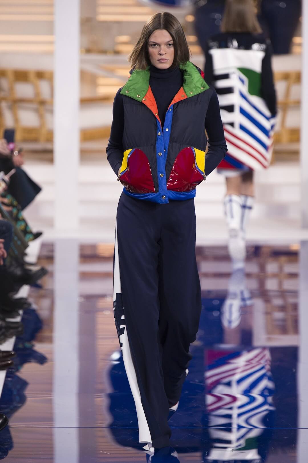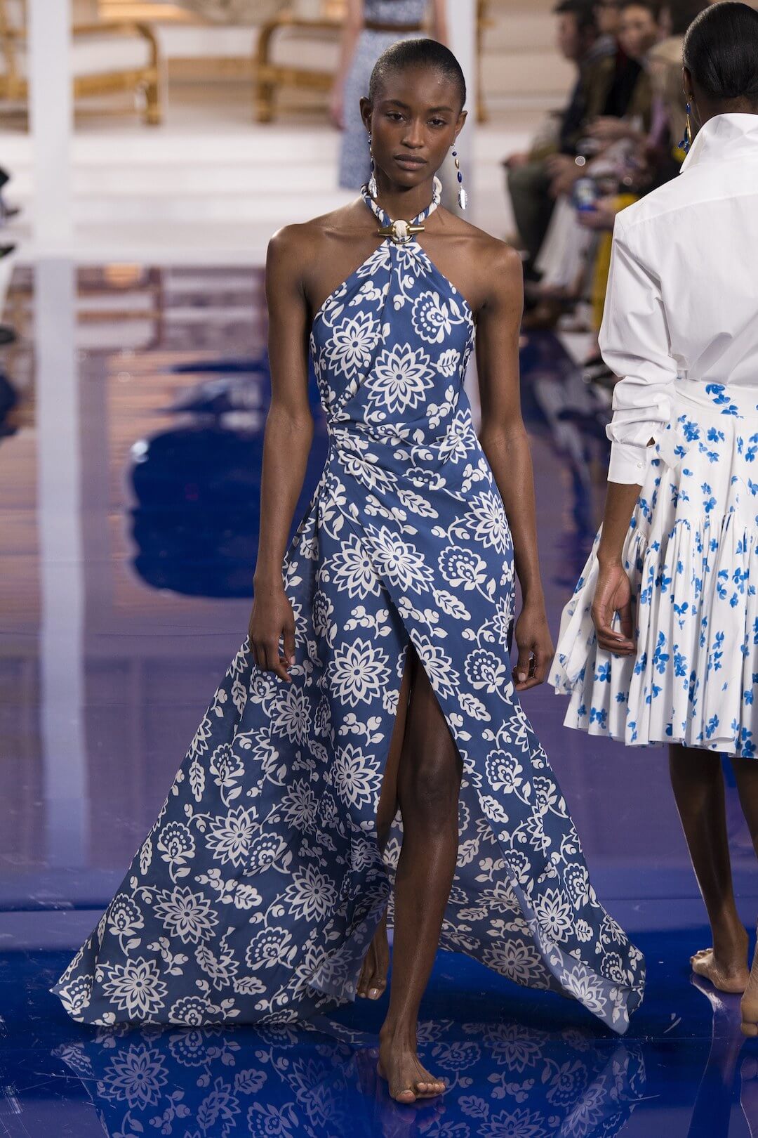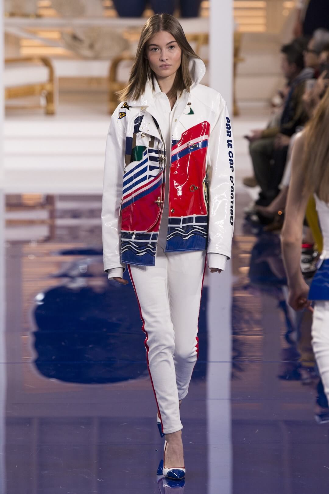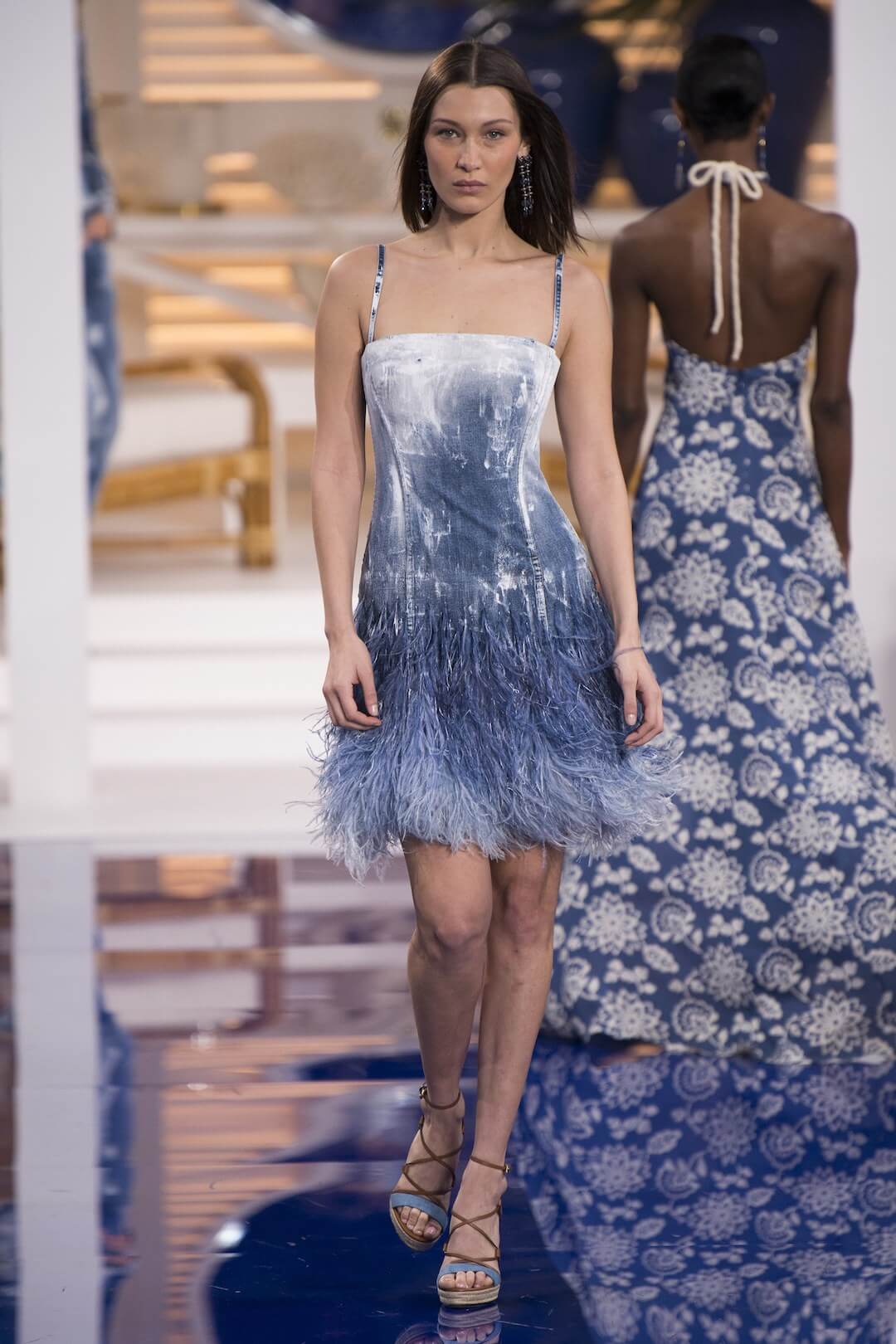 And so, back in New York for the Spring 2018 show, the girls were barefoot, reggae vibing, setting the tone for a day by the sea in swishy summer cotton dresses, bandanas tied round the waist, island life. Soothing. Girls got practical, changing into gumboots, shorts and shiny cotton canvas jackets, going fishing. And then they were off to Ralph’s royal motor yacht club, members only, like an episode of Revenge – were they secretly planning to kill each other? It was preppy too, like a good all American Ralph Lauren collection should be, impeccable ivory pant suits, dressed for dinner in deck shoes and flattering evening gowns in Jamaican yellow and green that skimmed the body. This was the good life, not for mere mortals.
