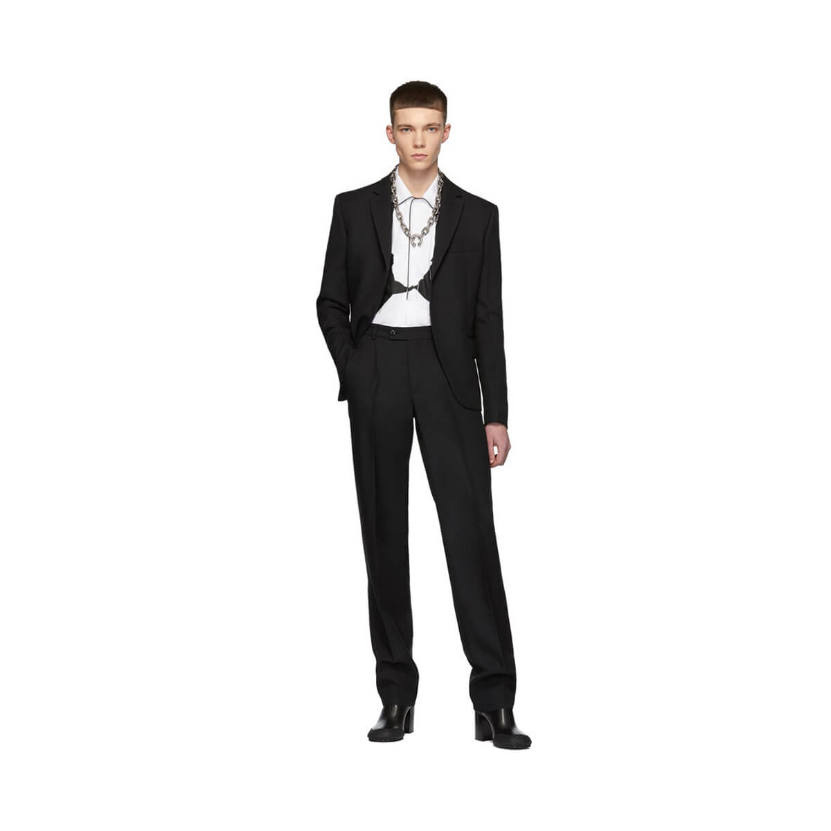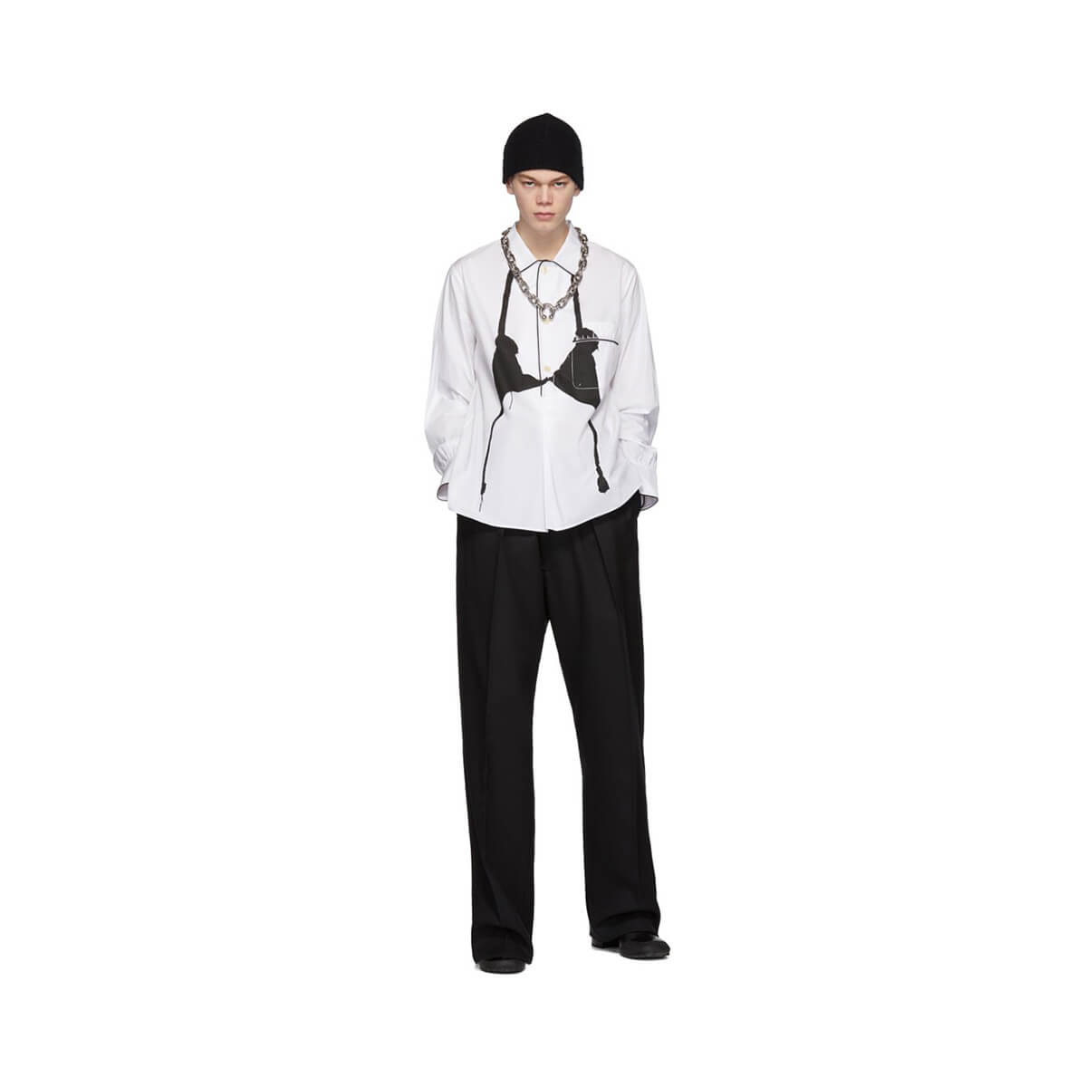 The just-dropped, third instalment of Random Identities was made for the ardent Pilato fans who were in awe of his pristine Zegna tailoring skills, though now at a more accessible price-point. Titled Tailoring, it’s formalwear, cut with precision and carrying classic suiting sensibilities. Revere-collared, white PJ shirts, printed with a graphic of a bra sell for £150, whilst wide-legged trousers, cut low at the crotch, respectively stand at £205. Tailored staples from Pilati’s own archive are refracted through a Berlin-tinged lens. A stand-out blazer, shoulders padded to 80s volumes, is as Berghain-ready as it is for the board room. This multi-purpose outlook on designing filters through to a six button, double breasted suit. A personal favourite of Pilati for its “inter-seasonal chic look when combined with flat front pants”.