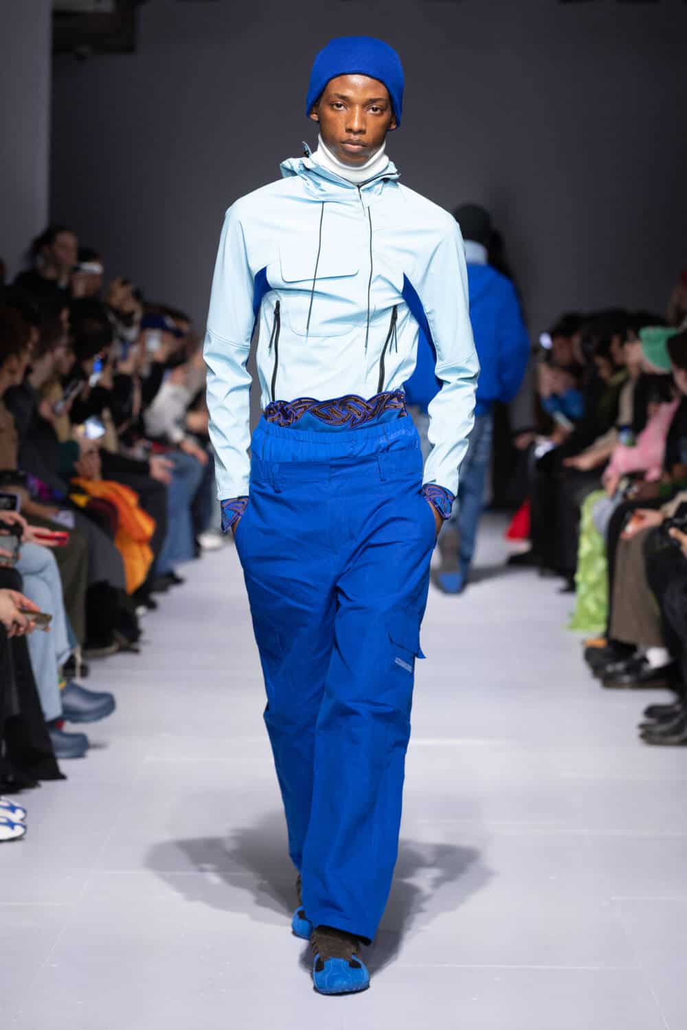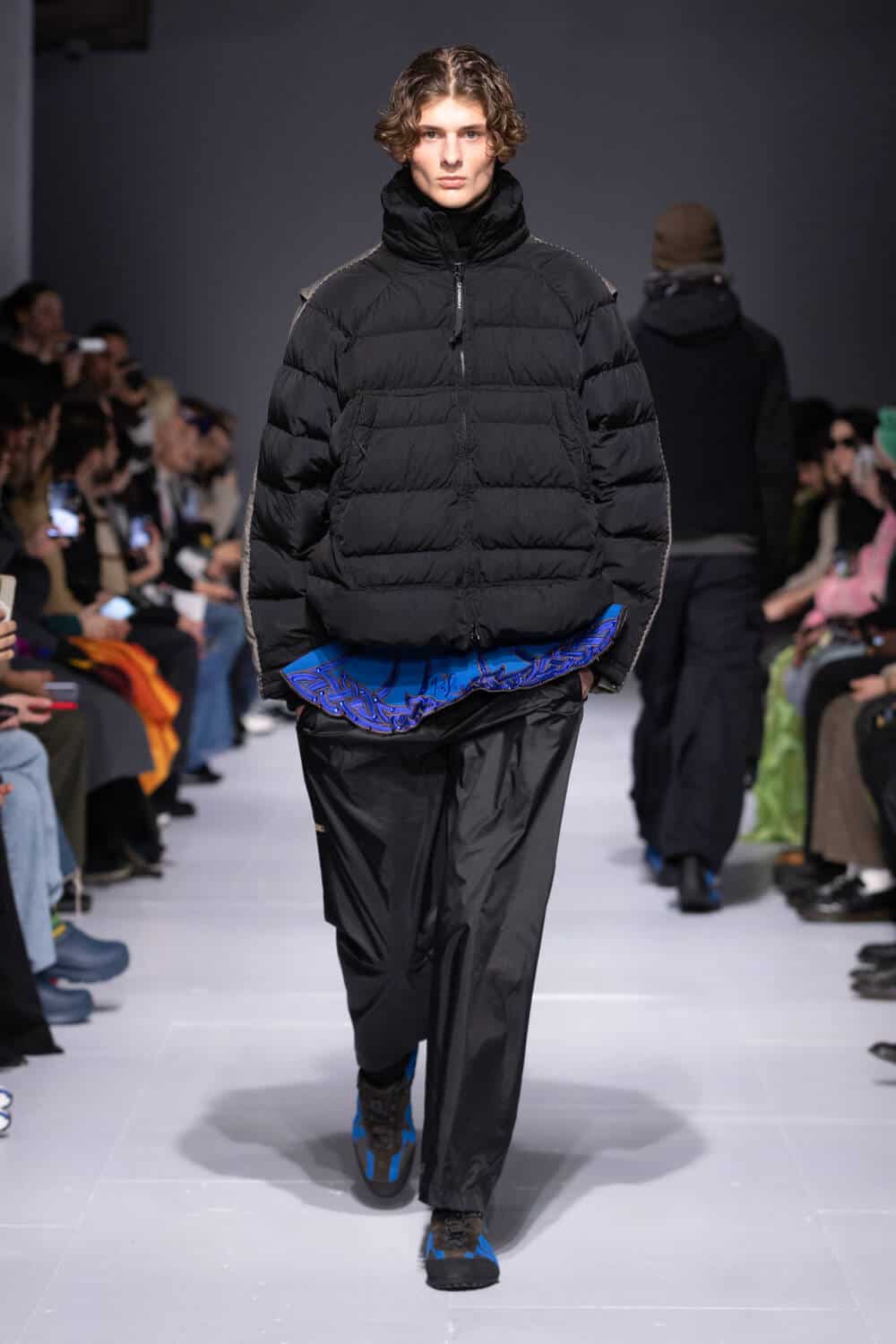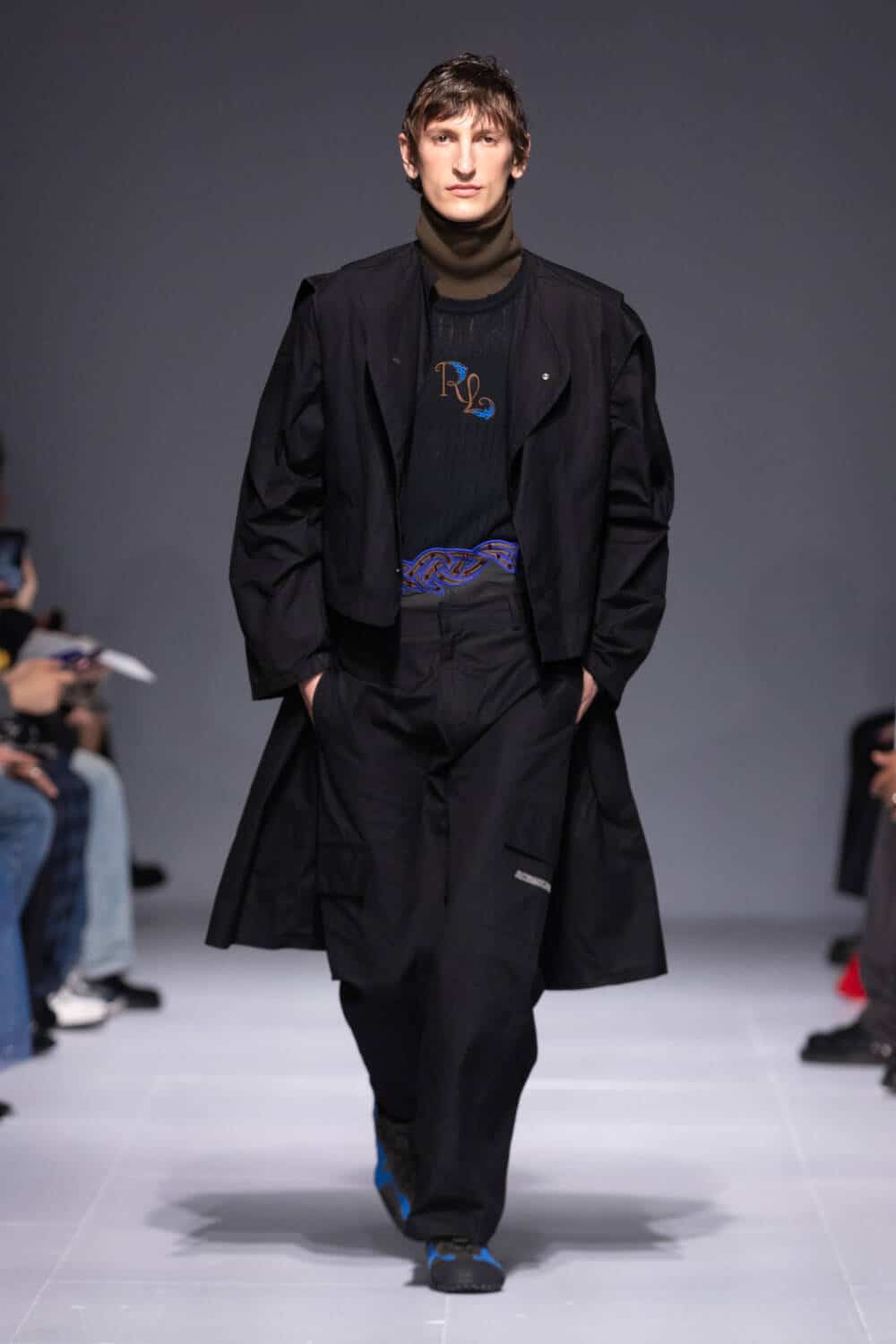 Nostalgia for her formative years growing up in Ireland has always been at the heart of Robyn Lynch’s namesake label. Everything from her dad’s old denim to holiday keepsakes from her mum, and the sportswear Lynch and her mates religiously wore in their school days has seeped into the menswear designer’s collections. This season, she turned to the competing uniform of her younger sister Adrianna, who’s a professional Irish dancer. “I vividly remember all these weekends spent in sports halls at competitions, seeing the glitz and the drama that happened on and offstage,” said Lynch, who brought an extra dash of sparkle to her signature hybrid sportswear via dancing skirts worn over technical trousers – each embroidered with Celtic knots by John Carey Design, a legend in the Irish dance scene.