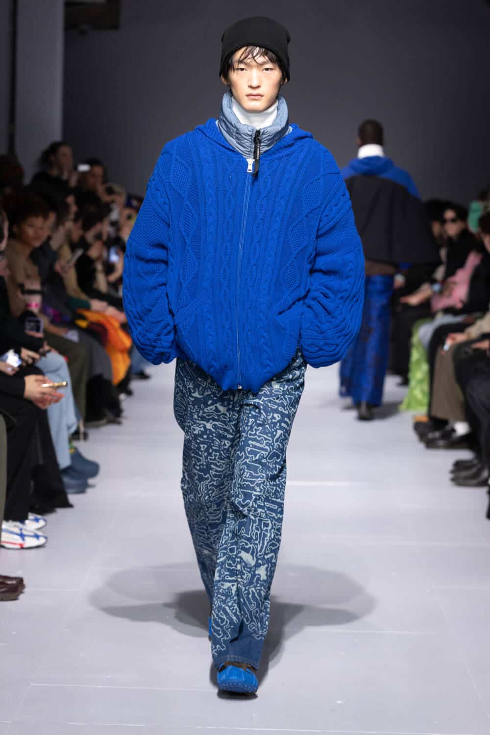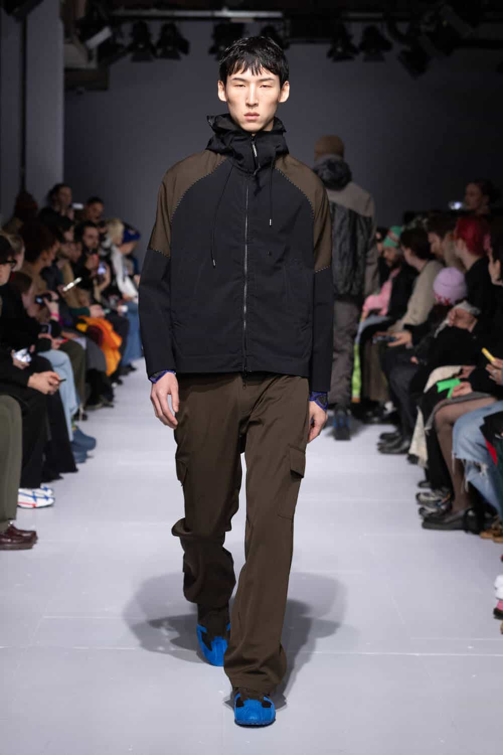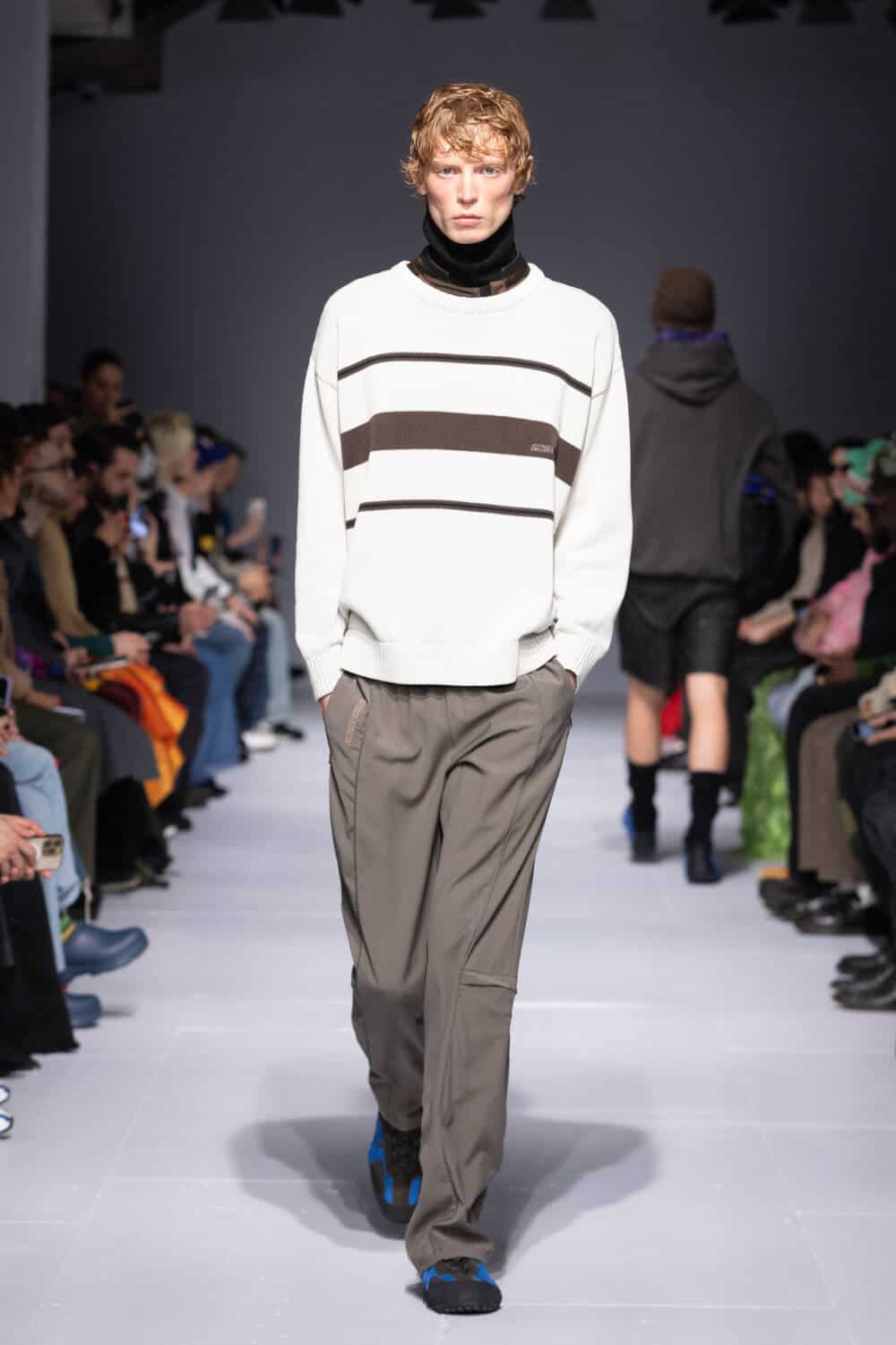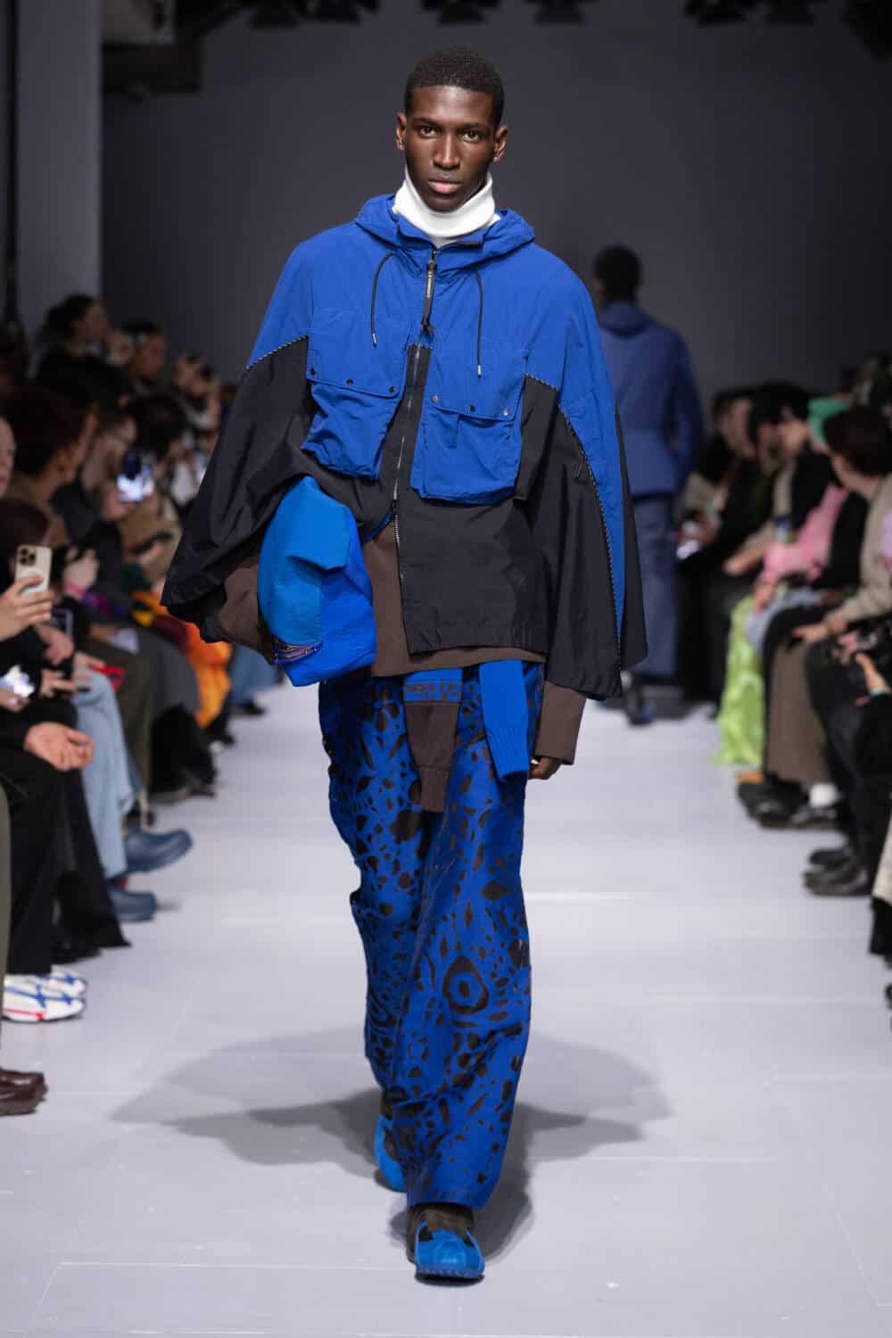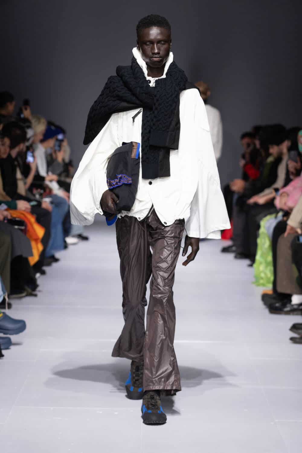 Designers like Carey will create custom uniforms for dancers which will be completely unique to what other competitors are wearing. This notion sparked a dialogue for Lynch, who wanted to explore the similarities between different forms of performance wear. Having previously collaborated with Columbia and Rapha, this season she turned to Italo sports giant C.P. Company, upcycling 10 jackets from its archive to create a series of one-of-one outerwear delights. Standouts included nylon zip-ups that came spliced with Lynch’s go-to Aran knits and a crisp white jacket that was reimagined as a cape. Lynch also linked up with Geox too, envisioning her very first footwear collab that drew on her dad’s favourite trainers from the brand. Lynch’s silhouette collides suede and leather with breathable fabrics, prepped and primed to kit out her loyal fanbase.