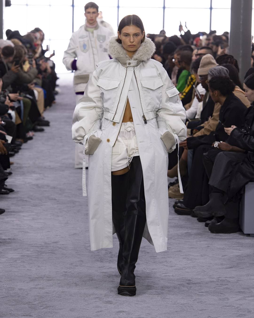 Sacai has long had a penchant for tapping into the unique expertise of others, and its AW24 collection was no different. In fact, it was rife with crossover-collaborations. Skateboard pioneer Mark Gonzales created graphic badges – reminiscent of wilderness Americana – which were applied to Spiewak G8 jackets, reimagined by Sacai, while J.M. Weston’s quintessential Golf Derbies and Worker boots were remade with Sacai’s signature sneaker sole. Chitose Abe’s Sacai is the master when it comes to skewing conventions and reconfiguring uniformity.