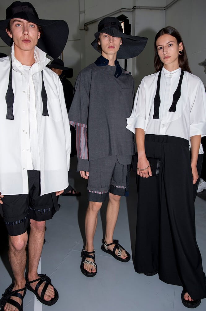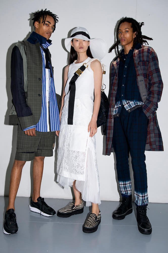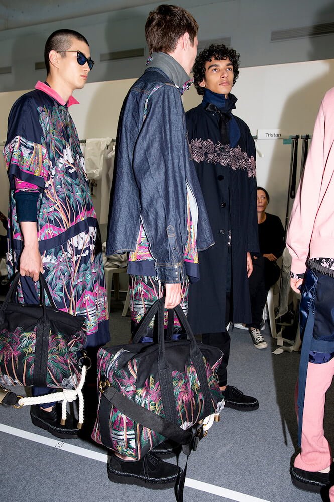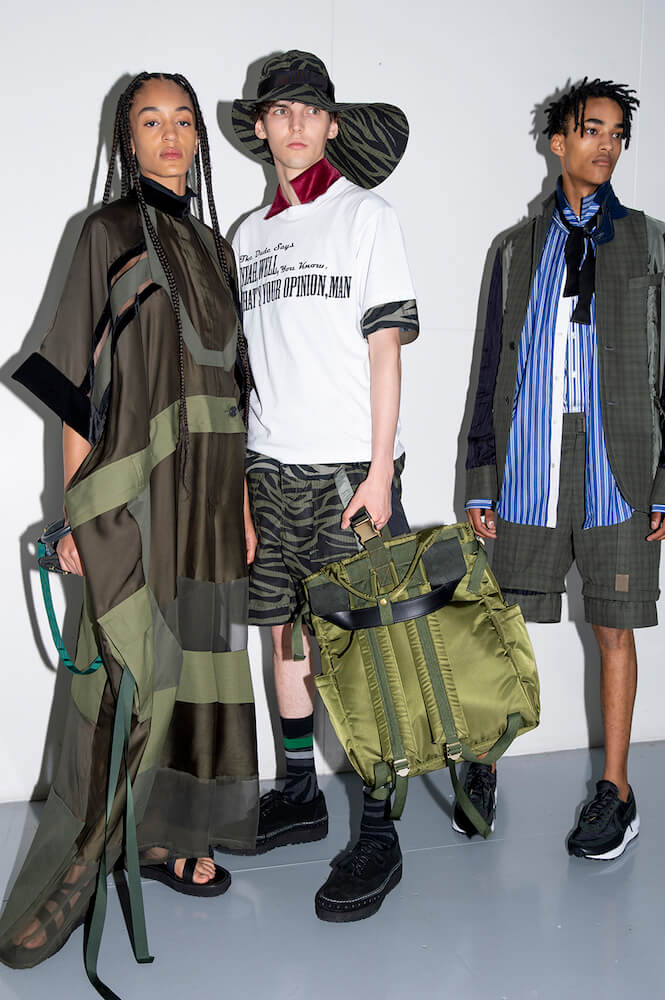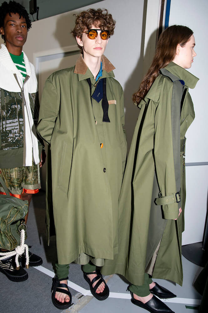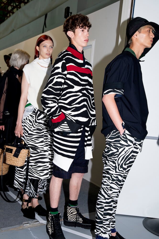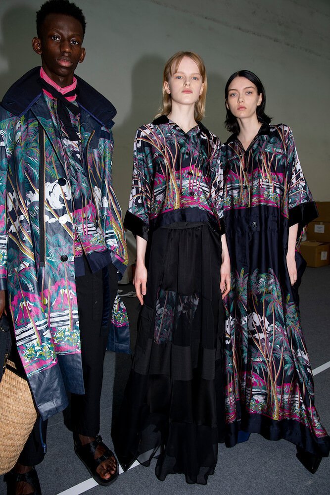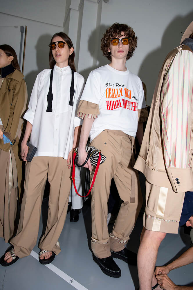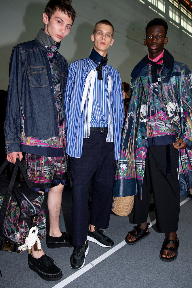 Story 2: the army and panels of different army-khaki fabric were brought together to create jackets and trousers. One MA1 jacket – a house favourite – came with zips at the sides not seams. Then it turned black and goth or goth via rock ‘n’ roll with zebra stripe shirts and trousers. Desert island and palm-trees-prints even pineapples: all the summer getaway clichés motifs then came over-dyed in black. Sometimes pink; as if looking at the world through those cheapo-looking sunglasses tourists buy. A gingham print shirt with ombré bleed was exceptional. Trainers? After this summer’s Sacai x Nike collab-explosion a return to sandals and built-up shoes. Incredible shopping as usual.