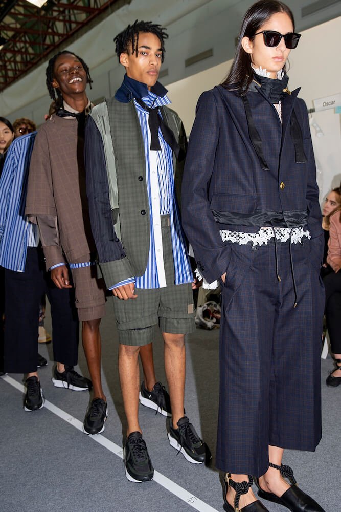 In an exercise of considered dishevelment the Sacai designer Chitose Abe turned the suit inside and out and layered it at her SS20 show this morning in Paris. The normally unseen was now exposed to show its hidden beauty: striped silk linings and the folded back seams all on display. The inner-workings; the essential pipes and fittings of a suit were celebrated. And layered.