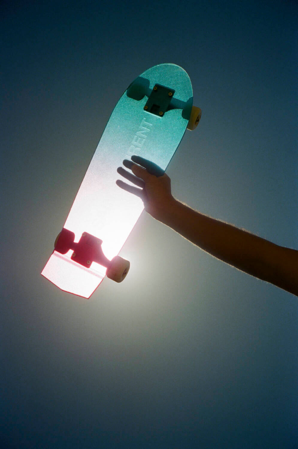 Throughout the collection, sunset hues appear across gradient heart-shaped padlocks, skateboards, and speedboat pool floaties – vroom vroom!