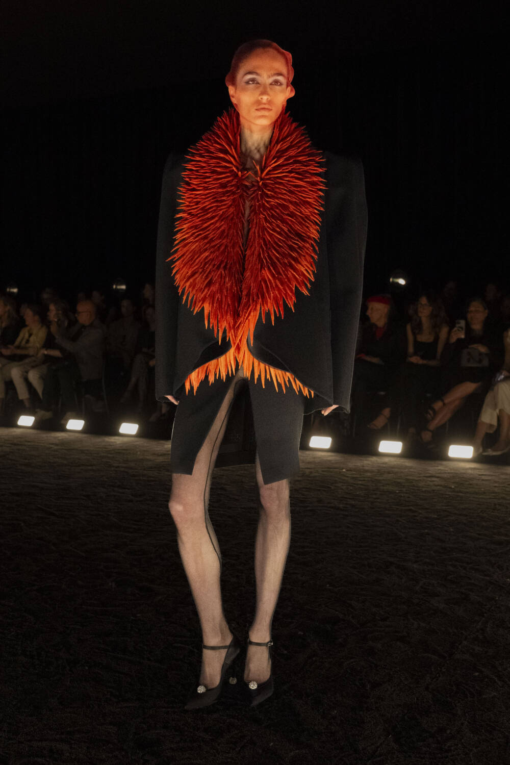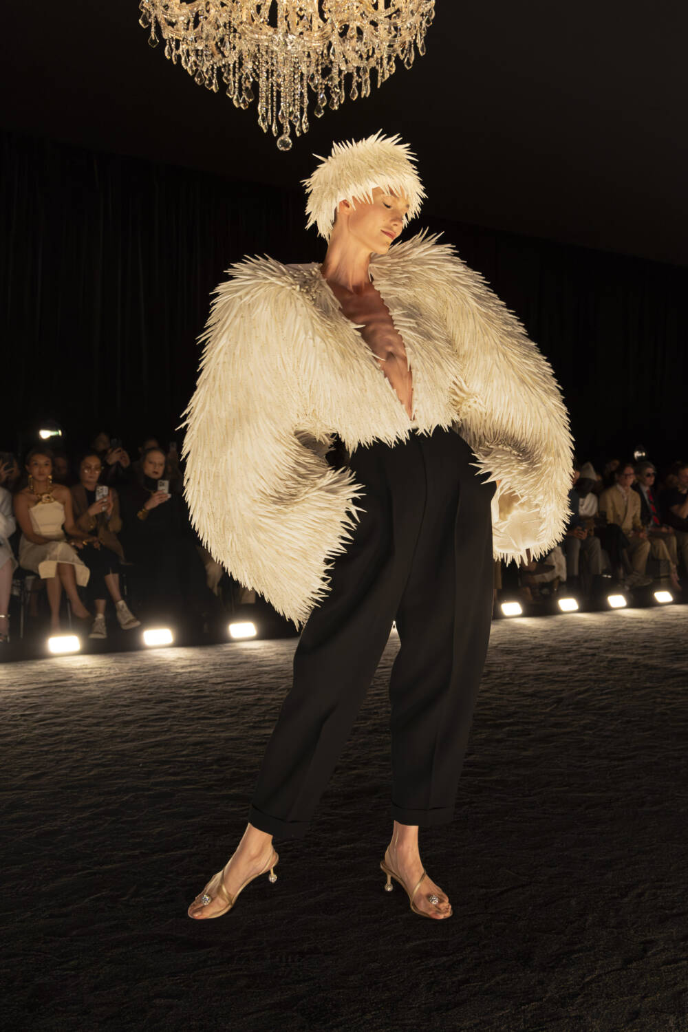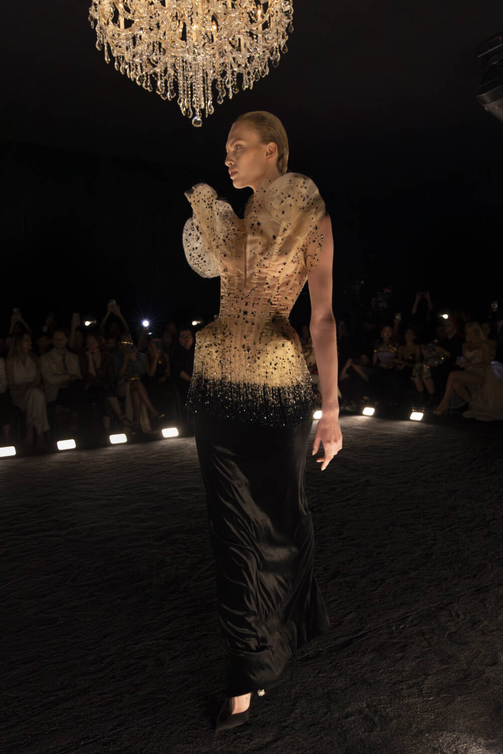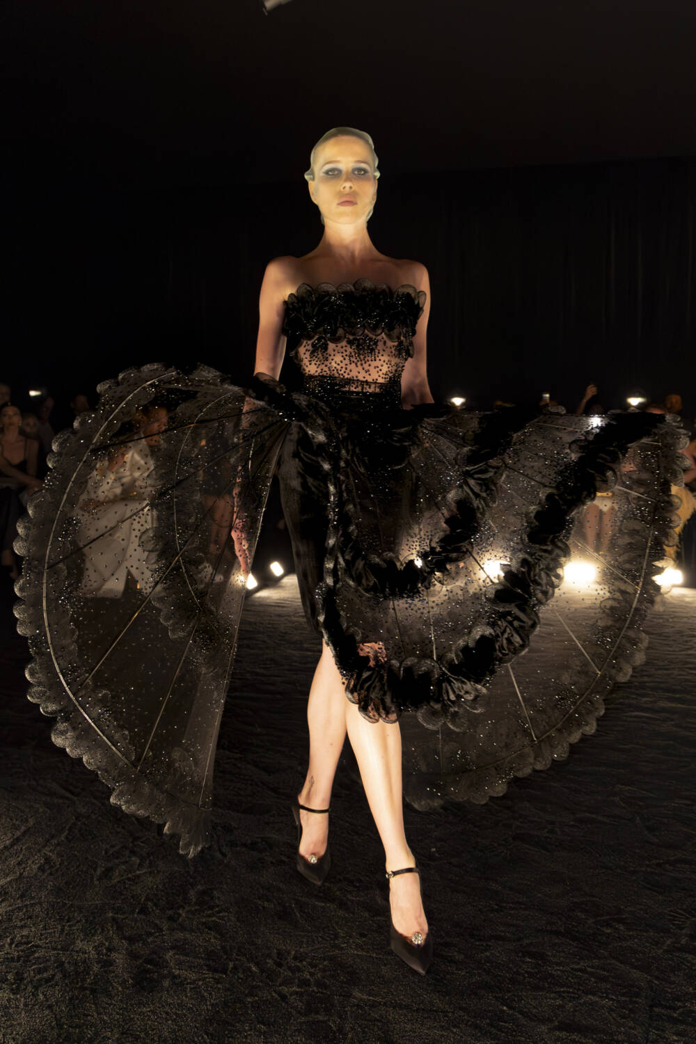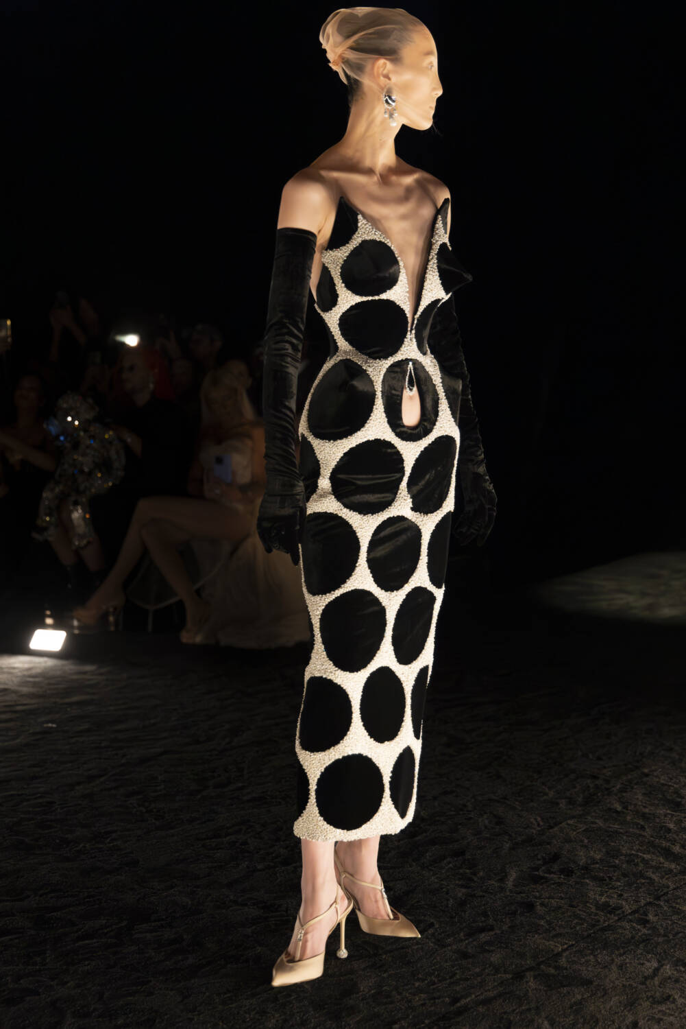 Roseberry has ushered in its most successful era since the 1920s and 1930s but he says the satisfaction of his many break-the-internet fashion moments, is increasingly fleeting, so for AW24, he said “I wanted to “do something that felt more timeless.” He rooted this collection in classic couture, hourglass silhouettes, loaded with craft. The show opened with a spectacular cape, made with silver embroidery arranged to look like gleaming feathered (Phoenix?) wings. Net Circle skirts lifted in provocative arabesques to show what was beneath (glittering gilded bugle bead embroidery). One gown was decorated with hammered brass polkadots each hand applied. Another was worn with a nude body suit decorated with 3D rose thorns. One satin corset dress had high heeled shoes for corset cups – a reference to a famous hat designed by Elsa Schiaparelli. Masterful, witty and oh-so-haute, even when he dials the drama, Roseberry’s clothes are head turners.