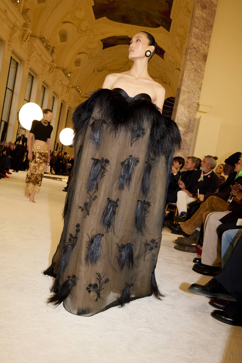 Roseberry took inspiration from great couturiers of the past: Worth to Madame Gres Saint Laurent, Alaia and of course Schiaparelli. “I wanted to learn from them,” he said, cherry picking then evolved my historic silhouettes as varied as an extreme S-bend corseted redingote to an dramatic empire line gown falling from a clam shell shaped bustier. Couture corsetry skills were on full display, with Roseberry creating what he described as “shockingly sharp” padding on the hips and bust. His also atelier went to town on head-to-toe embellishment, embroidering house motifs – the keyhole, dove anatomy – into almost every look. There were many ingenious looks from a seamless frill-back jumpsuit crafted from one piece of fabric, to a gown dripping in quivering quartz droplets another trimmed with gleaming glycerine dipped feathers, and a dress made from in plisse polyamide (a modern fabric, stronger than silk). No shortage of imagination here.