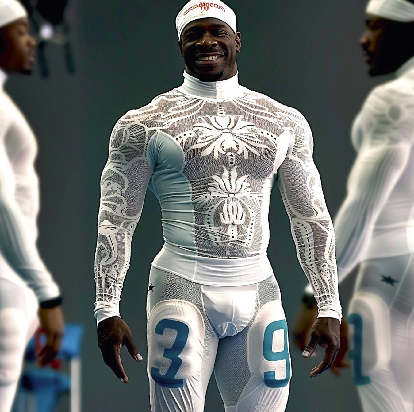 Introduced to the software by hairstylist Matt Mulhall, Foxton, now 63, was hooked, and for the past year has been sharing his results on Instagram. As is often the case with AI, it’s spookily attuned to instructions and, as a result, the very aesthetic Foxton built his name upon. Throughout the works, humorous juxtapositions play out: a beefcake American football player stands proud in broderie anglaise lycra, a young man with tribal markings wears a feathered ruff and a Latino gentleman with a skin fade smoulders in sparkly eyeshadow. You would be forgiven for thinking they are real fashion editorials – and many people do.