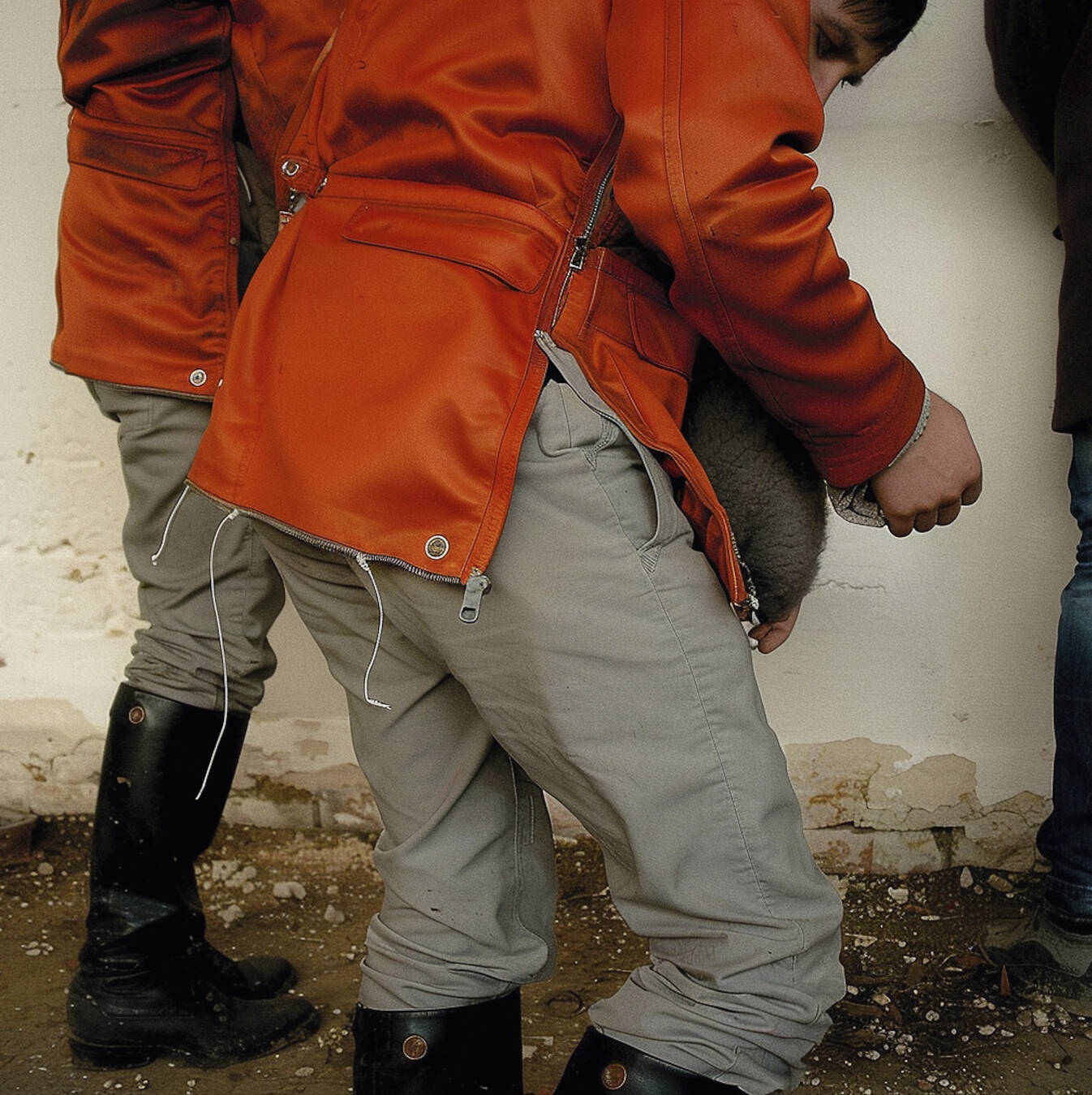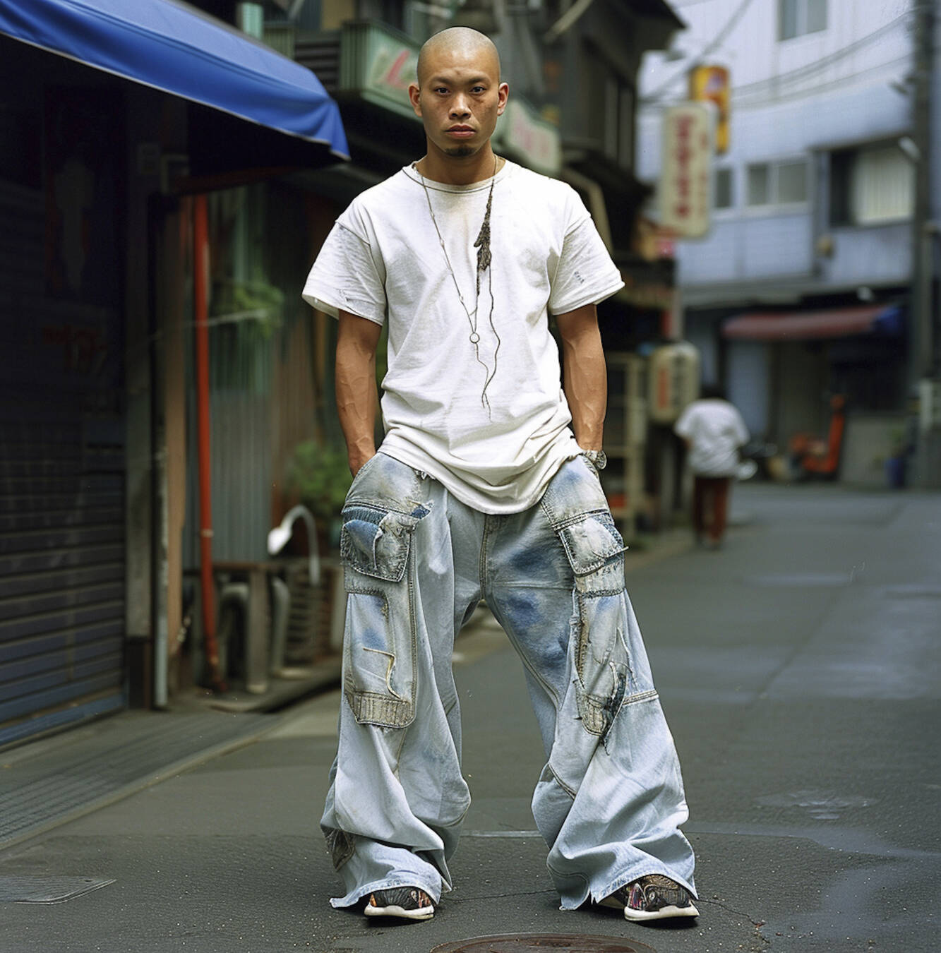 Coincidentally, Foxton has found it tricky to replicate designer fashion on Midjourney. However, themes or tropes, whether that’s vintage skiwear or 1970s punk, are often fruitful and surprisingly novel. “In a way, I’m going back to my roots, to when I first started with i-D in the mid-1980s,” he says. “We didn’t have access to designer clothes as much back then. We had to just use what we had, what you could get off markets or what our friends were designing.” Naturally, the staging of his AI photographs takes cues from the candid, street-style approach he pioneered. In one instance, that might mean a handsome twentysomething sporting biker boots, shredded denim shorts and a patchworked jean jacket, backdropped by a Los Angeles-coded street. In another, it’s three cadaverous beauties, shot in black and white, sporting mid-century denim workwear. “Helping a friend do some research on men’s historic trouser volumes,” Foxton captioned it.