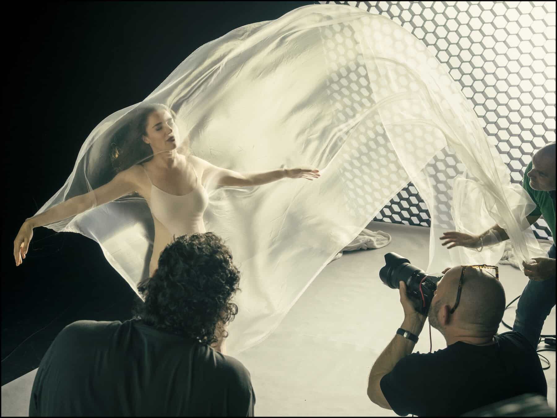 That underwater shoot, which I witnessed firsthand, was not for the faint of heart. Inside a large glass tank, Herzigová held her breath while Sundsbø and his team choreographed light, fabric and movement. Sundsbø understood the assignment: “People underwater don’t usually look good – gravity works differently. You can’t light from the front, and there’s an element of trust. But Eva’s fearless,” he says.