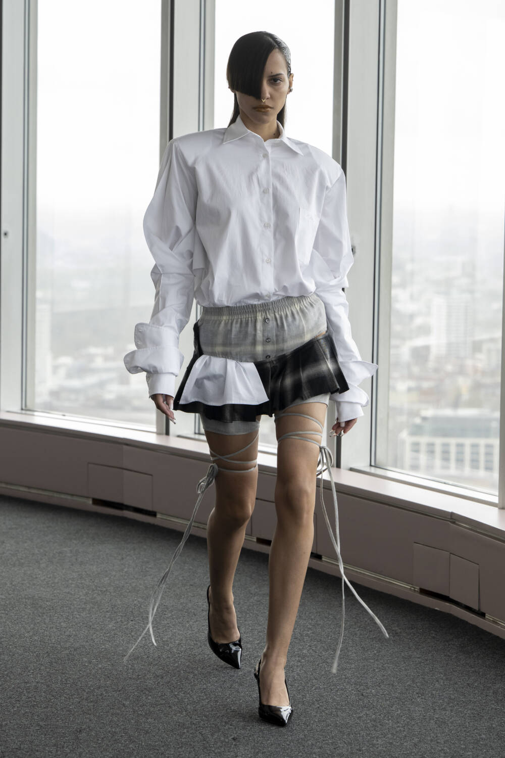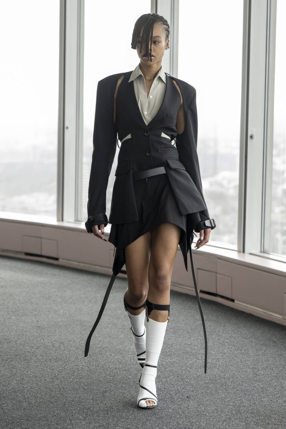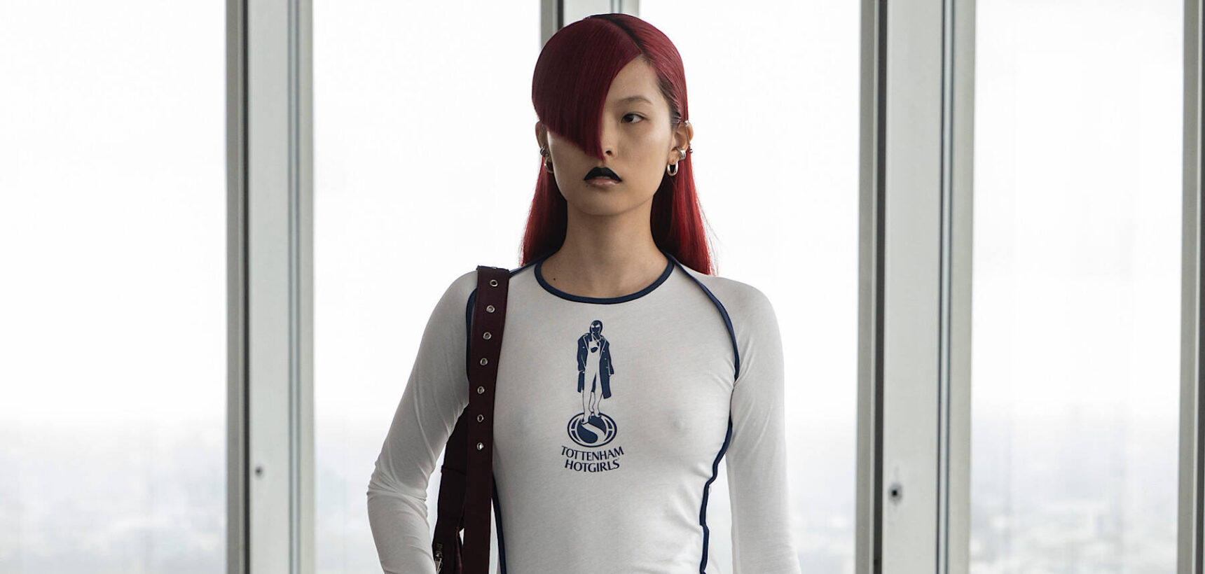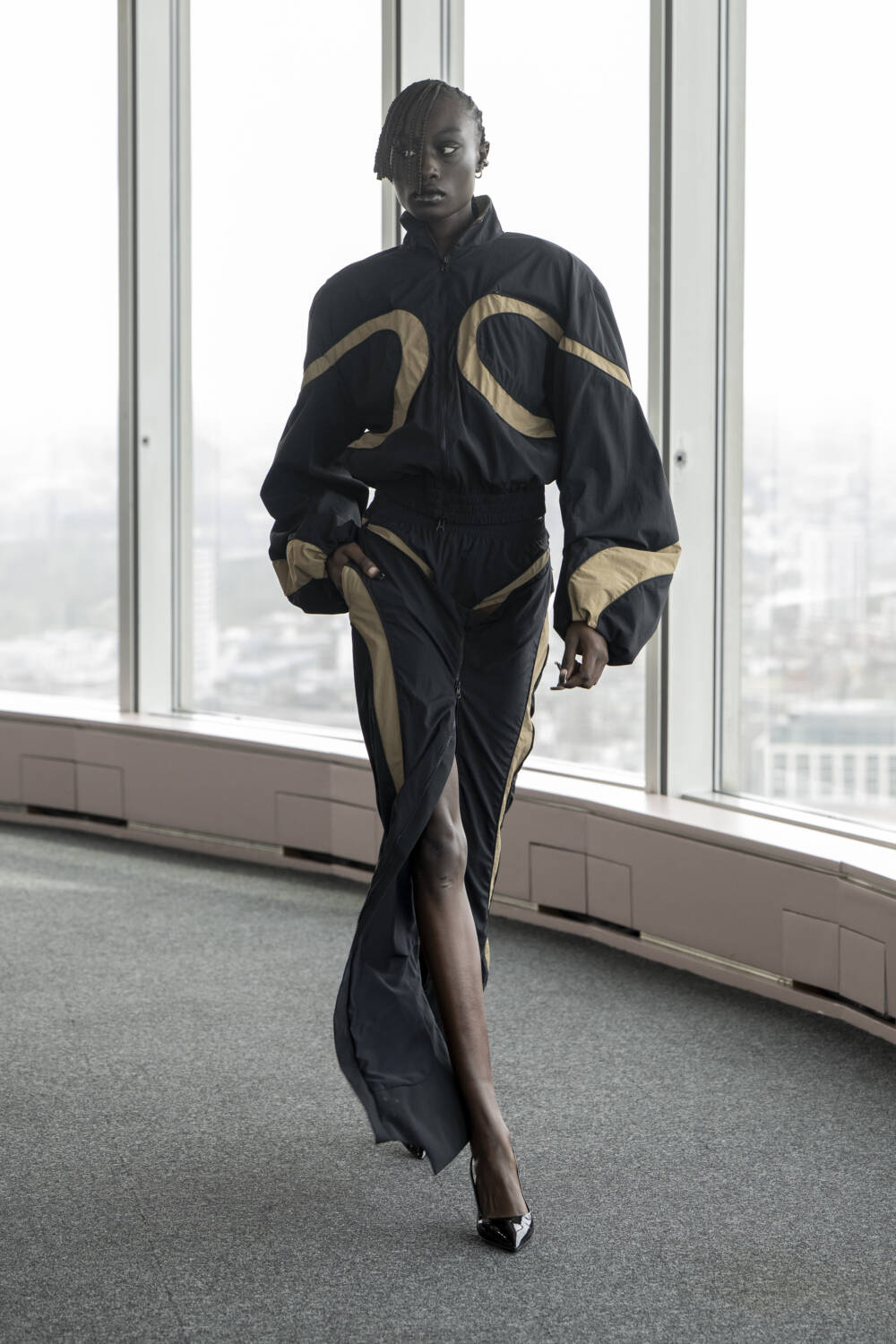 Themed on the idea of clothes as armour, pieces were functional but subversive, encouraging challenge rather than blind acceptance. The cuts felt defiant, with the term “power suit” feeling very apt for the sharply sculpted blazers and trousers that peppered the womenswear. Shirts were constructed from upcycled boxers giving it a masculine edge too. Military knits were cut up and restructured, nodding to adaptability, whilst unexpected graphics like a reimagined Tottenham Hotspur insignia, which instead opted for the phrase “Tottenham Hotgirls”, embraced the idea of community and sisterhood. It was an expressive, powerful and a considered exploration of the power of clothes.