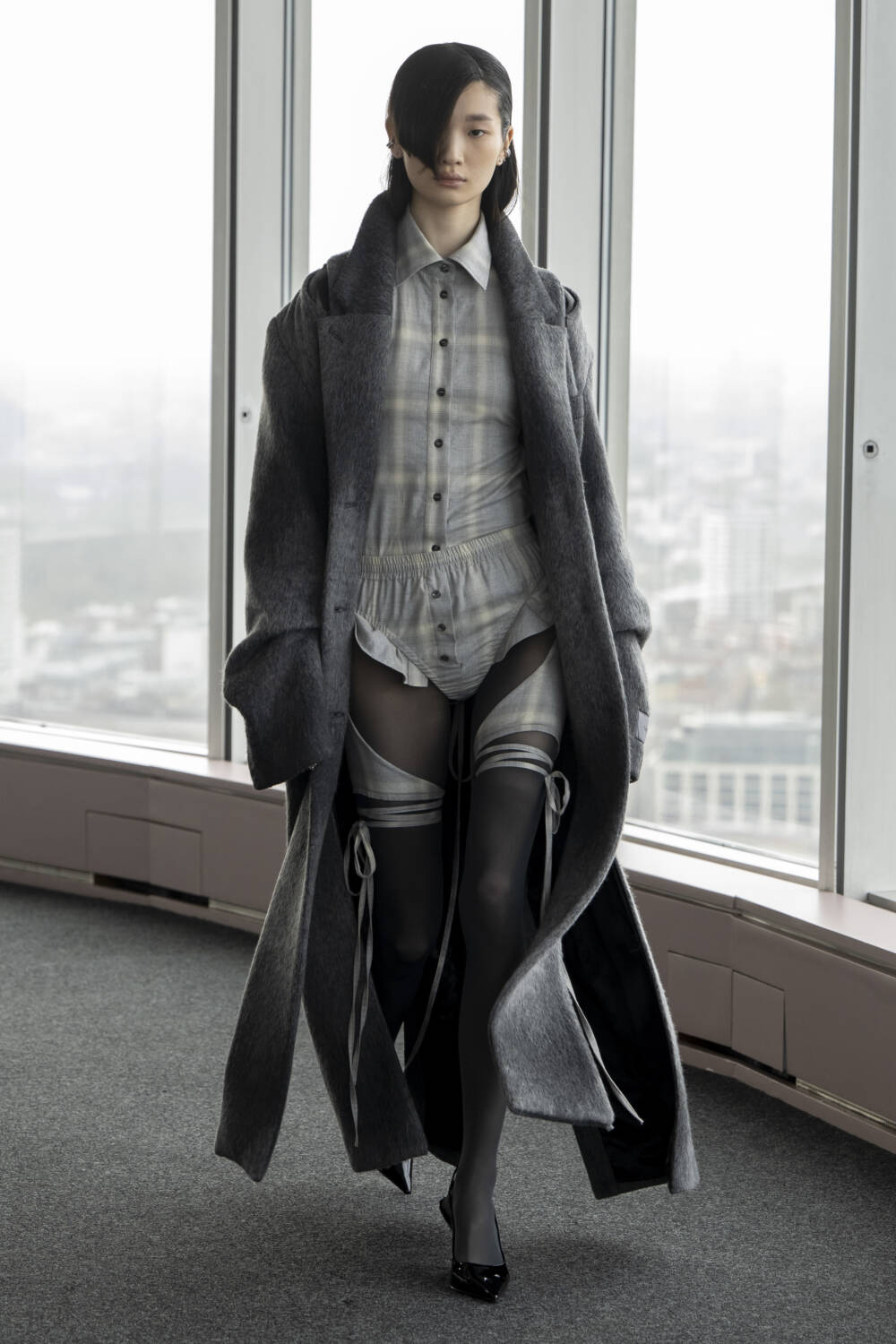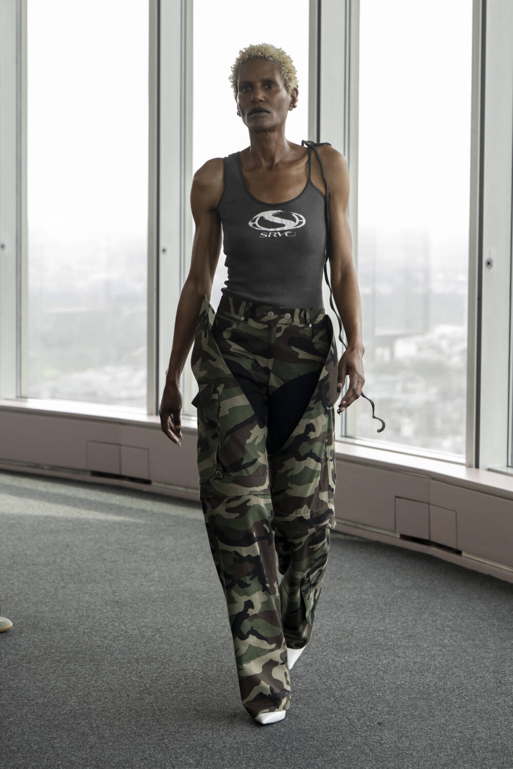 SRVC’s decided to take to the skies yesterday, opting for the dizzying heights of the 34th floor of London’s BT Tower for its AW25 catwalk – the first brand ever to do so. A considered choice to showcase the Ricky Wesley Harriott-helmed brand’s goal of communicating through clothes, what unfolded within the glass rotunda show space was an incisive investigation of how fashion can help you defend yourself against the relenting demands of everyday life.