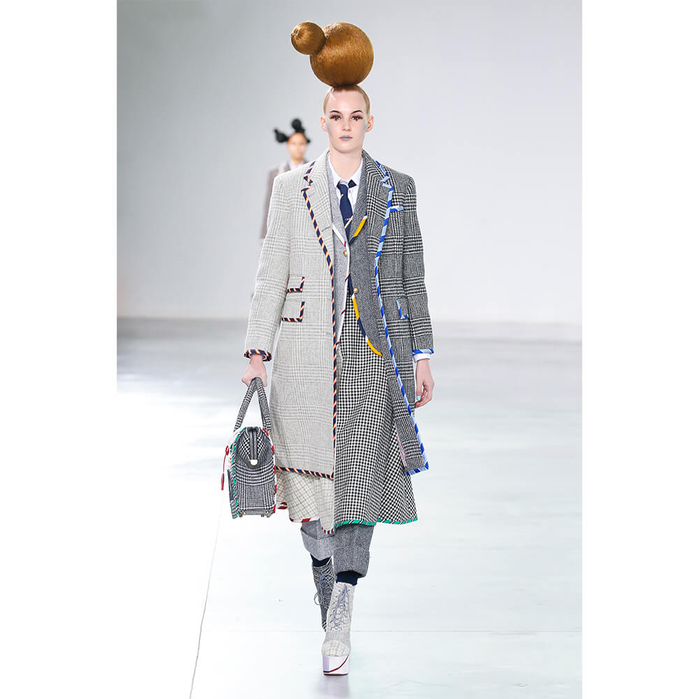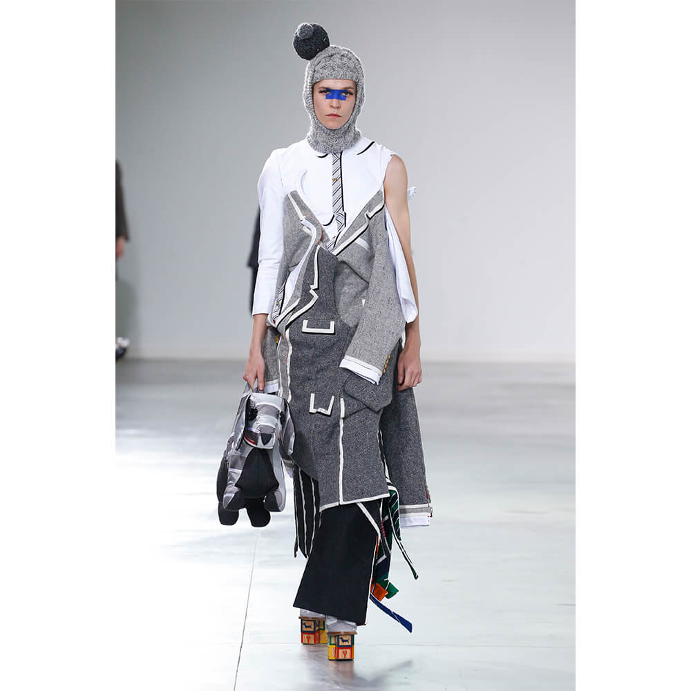 When the co-ed catwalk commenced, New York served as an island of misfit toys where adults were invited to venture in search of themselves; according to Browne, it was where they found themselves too. But while offering nods to the playthings of years past, it was no kitschy Barbie Fairytopia. In reality, this was a wack-ified edit, sartorially centred around the grey wool suit. By embracing the intricacies and miscellanies of deconstructed silhouettes, fantastical detailing, energetic silk mogador jacquards and traditional tweed tailoring, Browne worked to bring kiddish drama to a more mature place.