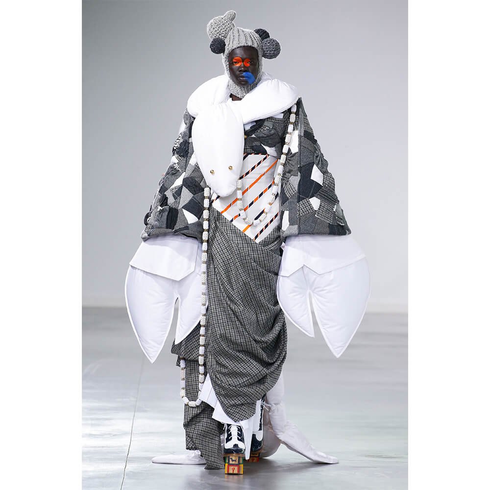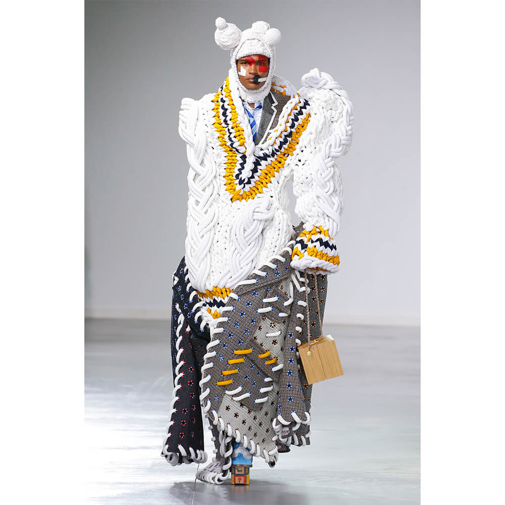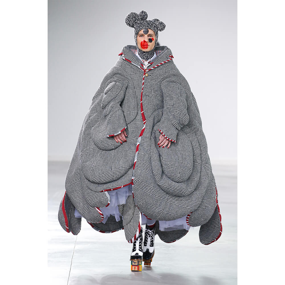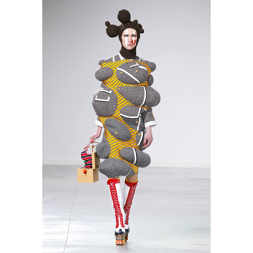 Coming in primary shades and collegiate colours, there’s a youthful sense of play to the avant garde asymmetrics; think balaclavas with spherical nodules protruding out like extra heads, a ball gown that’s reminiscent of a wooden soldier’s rectangular torso – sharp shoulders and all – and a life-sized knitted dachshund sewn onto a headpiece that’s named Hector after Browne’s own canine. But while the bulbous shapes of certain garments could pass for strange abscesses slowly swelling into benign tumours, the acutely youthful narrative continued to ring true. Especially when it came down to the accessories, children’s toys functioned as eccentric clutch bags in the form of cars and patchwork lobsters as well as signature Mr. and Mrs. Thom bags that imitated the ensembles they were carried beside.