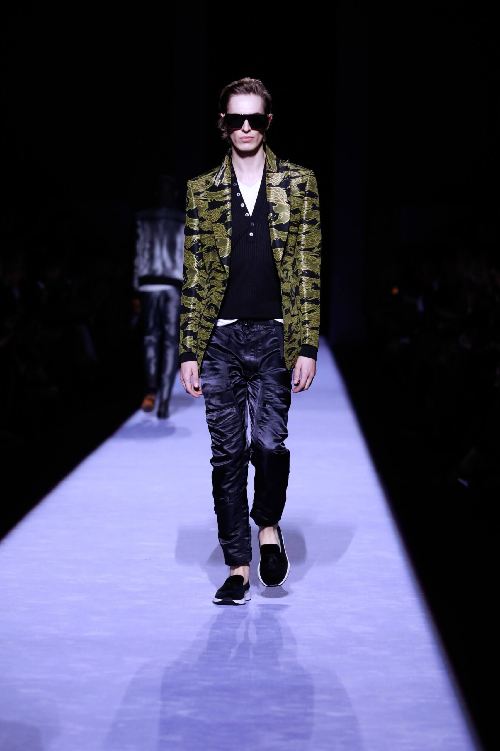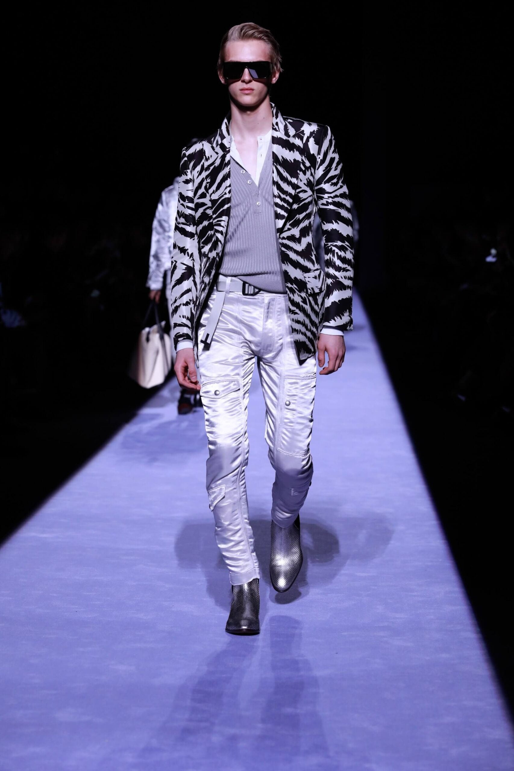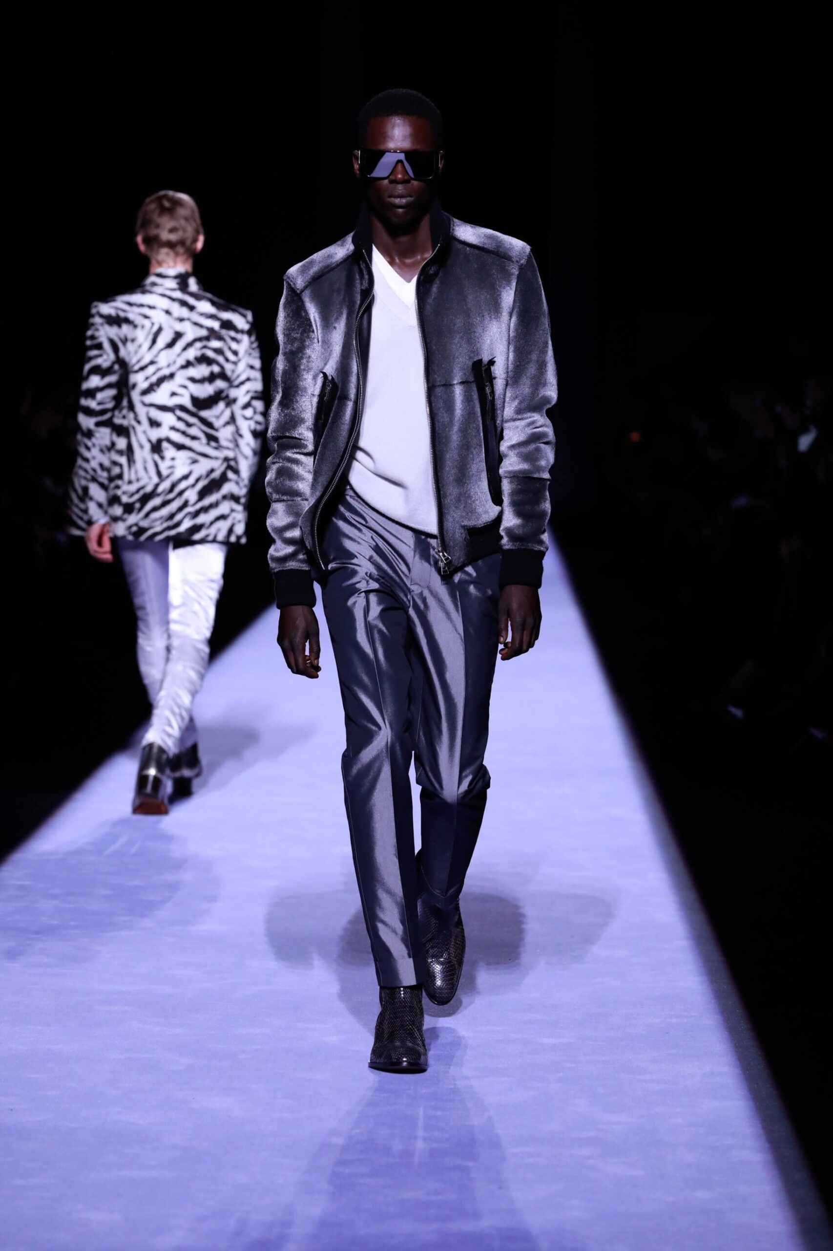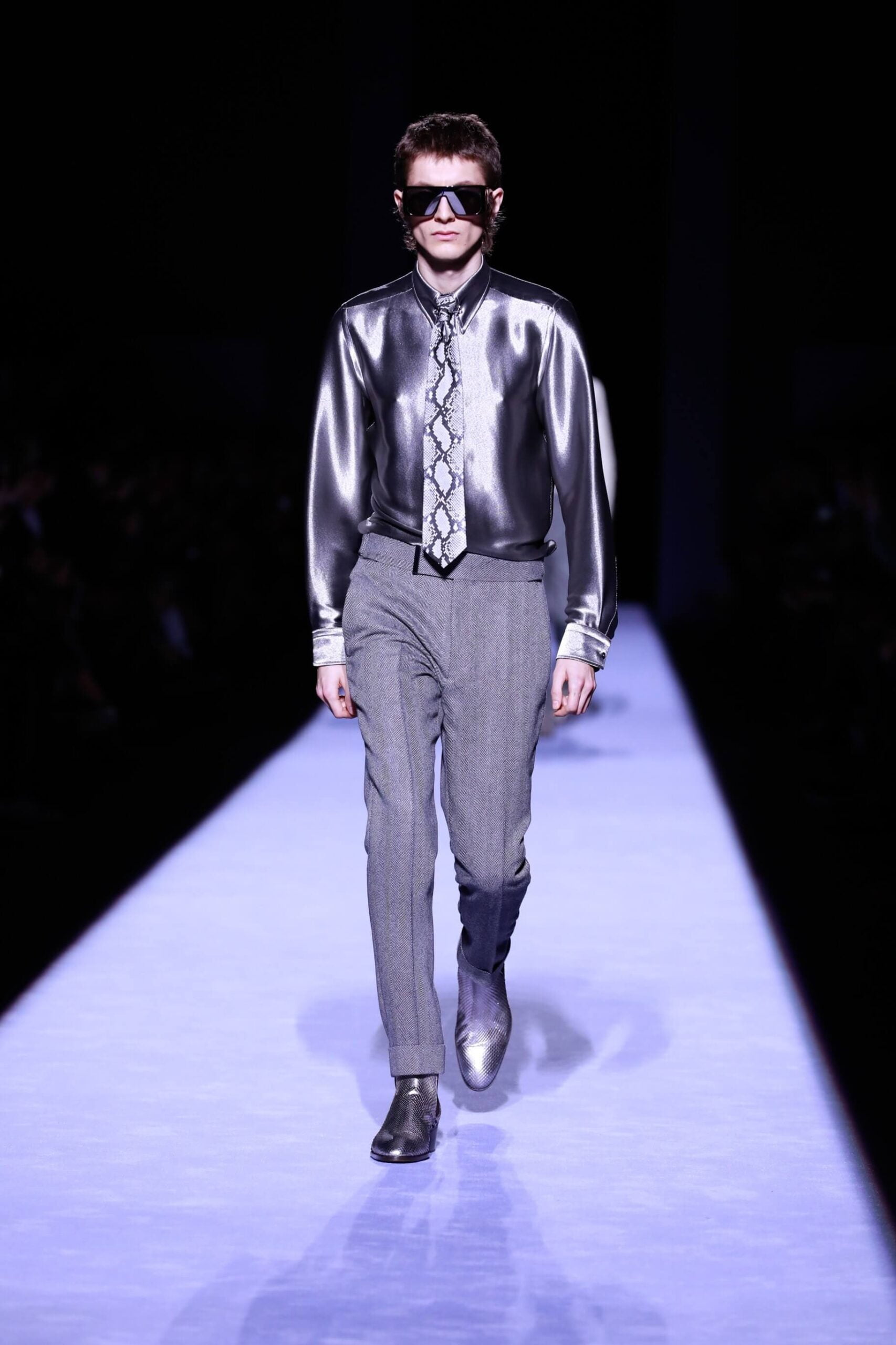 Collar up, sunglasses on, animal print, Tom Ford has got it going on. So fly he’s making us bust a rhyme. Is this the ultimate glamour va va voom menswear? Yes, New York Fashion Week Autumn/ Winter 18 has officially revved up, is in gear and off, full speed ahead. The Tom Ford man is flash, cashed up in all that sheen and metallic magic. Hmm we’re getting Tom Ford Gucci days vibes with that impeccably tailored sheen in so many great prints and colours. Bringing the good stuff back. So lustrous, even the shoes gleamed.