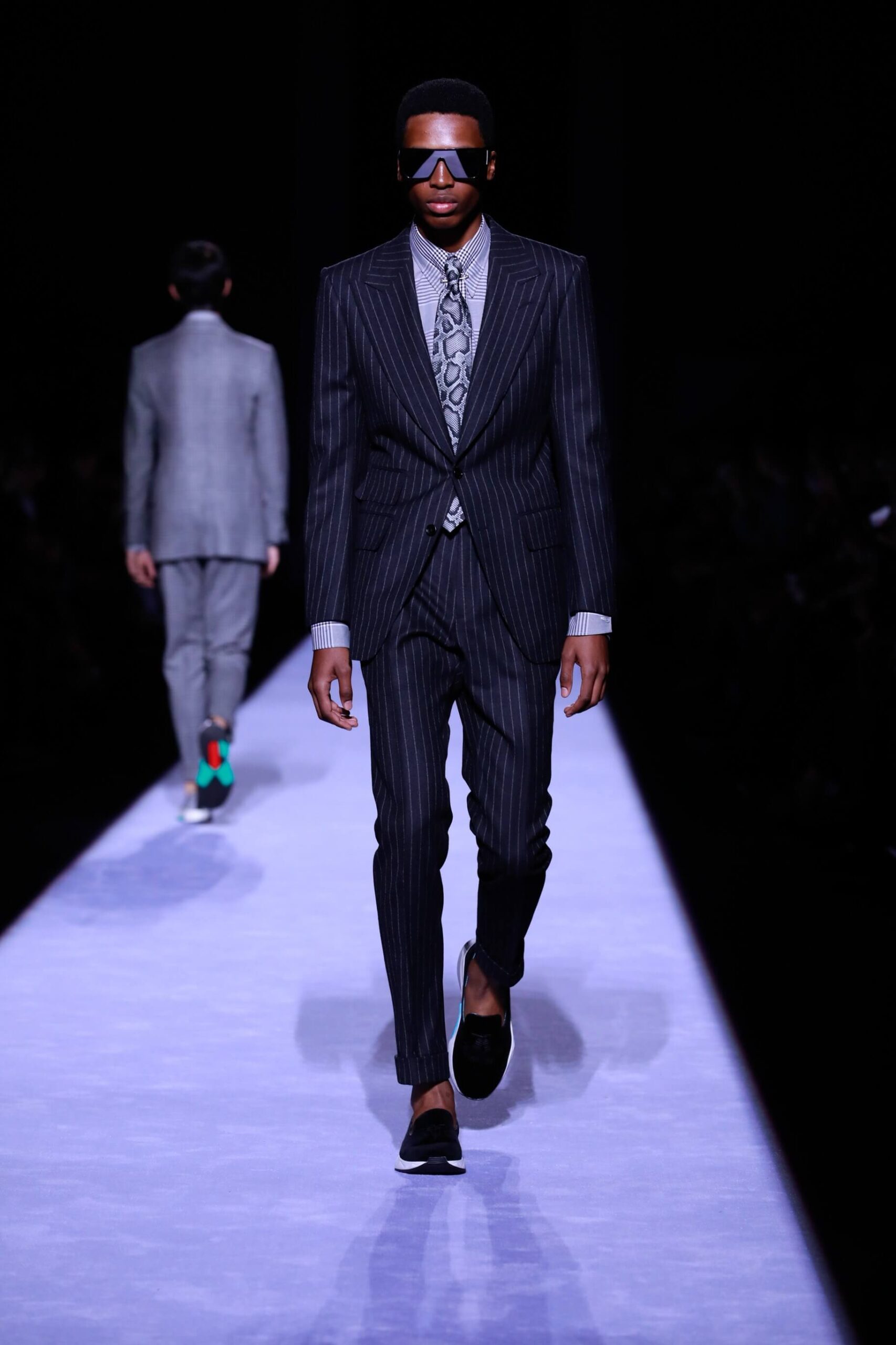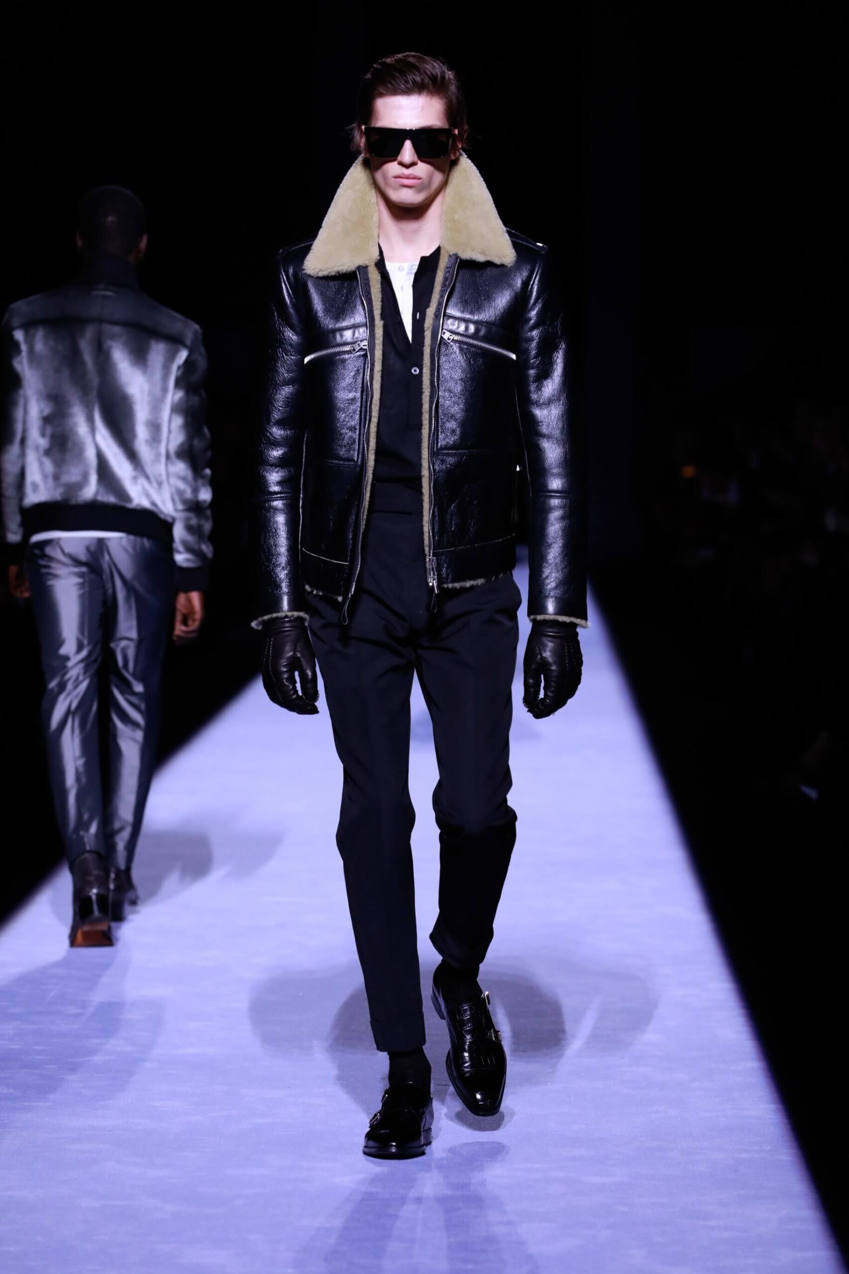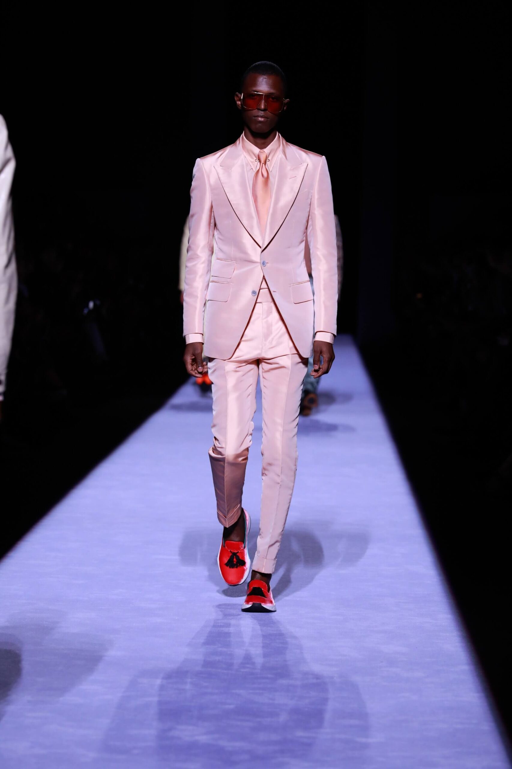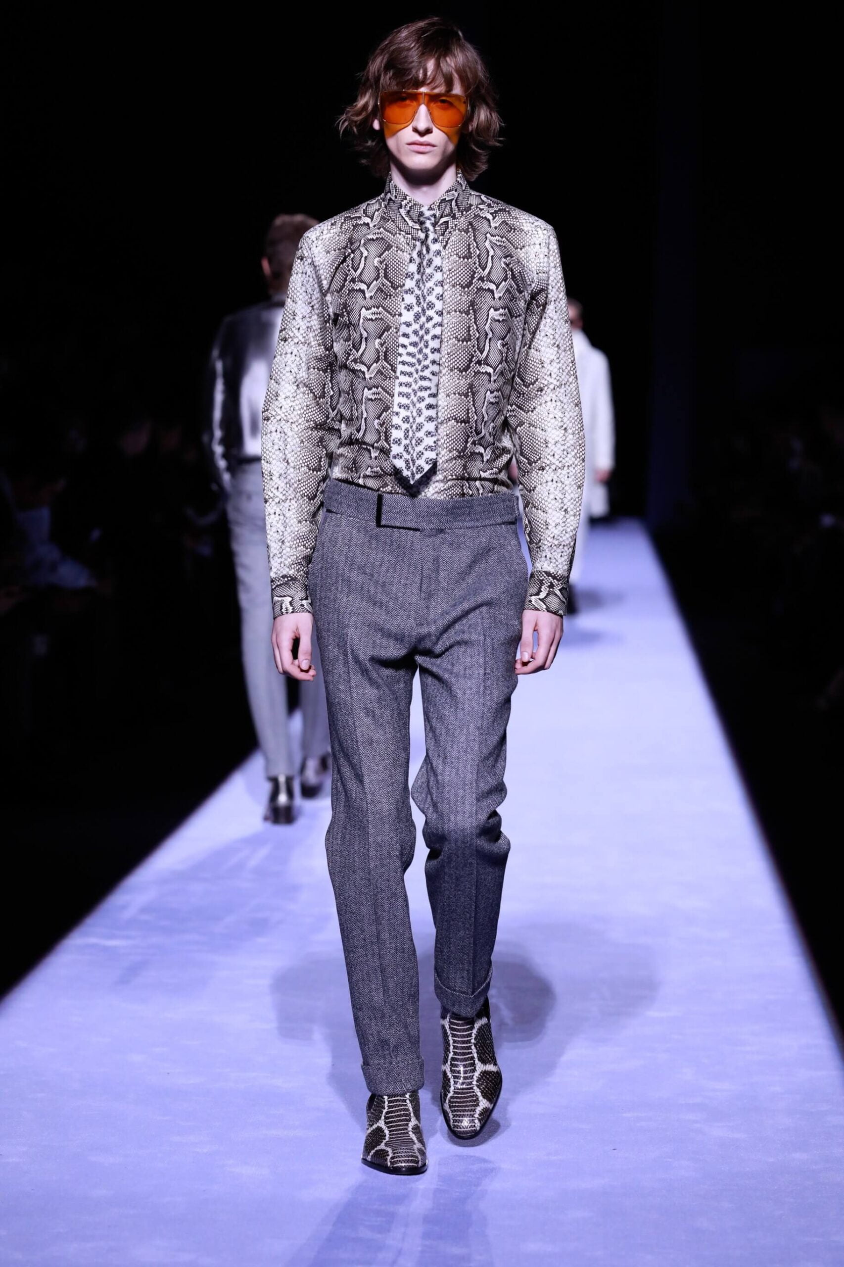 Collar up, sunglasses on, animal print, Tom Ford has got it going on. So fly he’s making us bust a rhyme. Is this the ultimate glamour va va voom menswear? Yes, New York Fashion Week Autumn/ Winter 18 has officially revved up, is in gear and off, full speed ahead. The Tom Ford man is flash, cashed up in all that sheen and metallic magic. Hmm we’re getting Tom Ford Gucci days vibes with that impeccably tailored sheen in so many great prints and colours. Bringing the good stuff back. So lustrous, even the shoes gleamed.