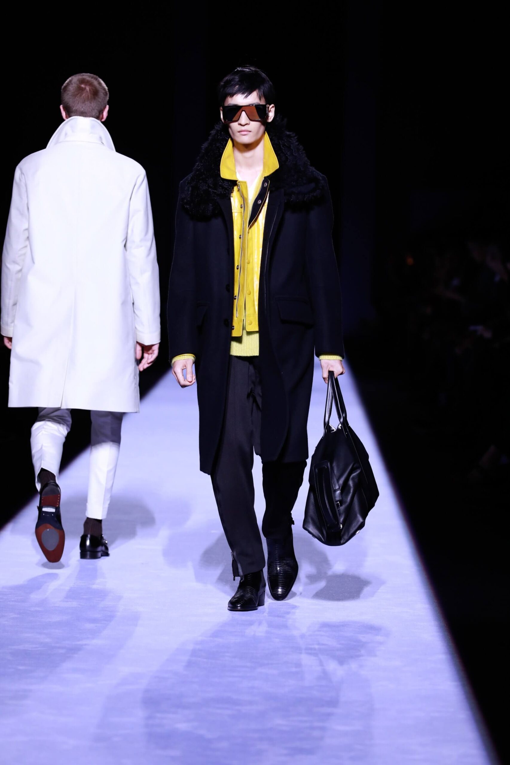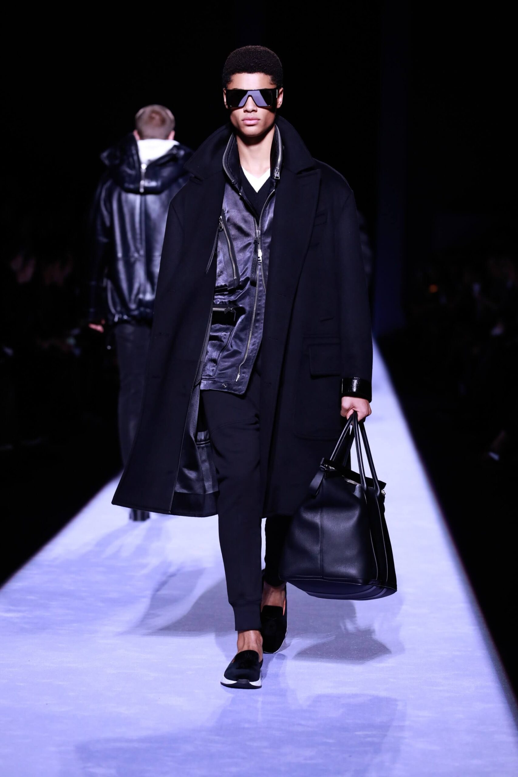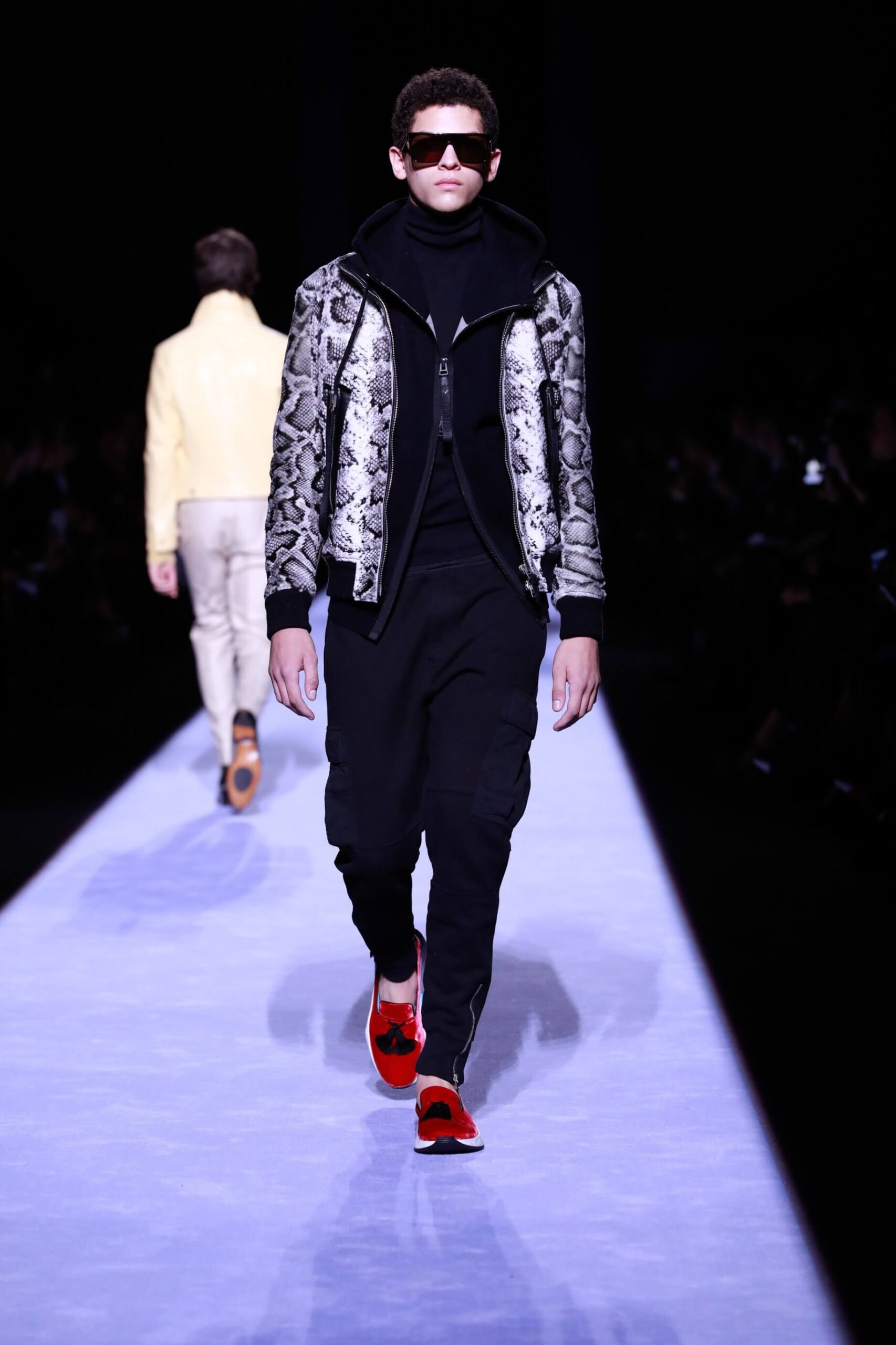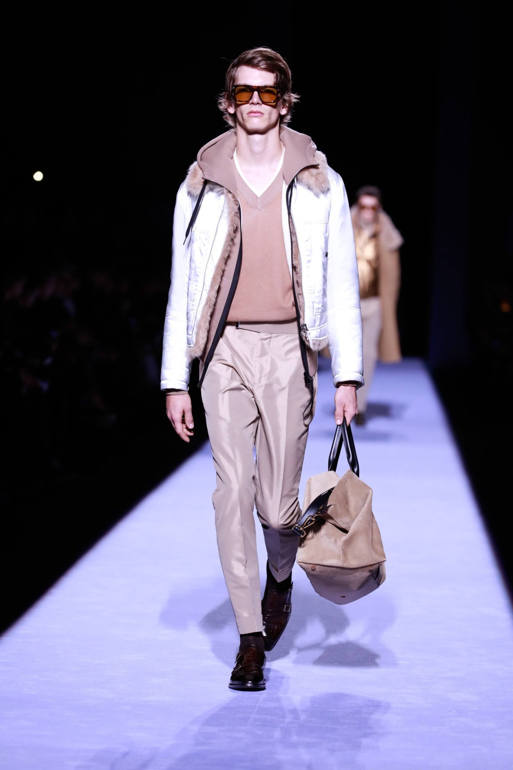 Collar up, sunglasses on, animal print, Tom Ford has got it going on. So fly he’s making us bust a rhyme. Is this the ultimate glamour va va voom menswear? Yes, New York Fashion Week Autumn/ Winter 18 has officially revved up, is in gear and off, full speed ahead. The Tom Ford man is flash, cashed up in all that sheen and metallic magic. Hmm we’re getting Tom Ford Gucci days vibes with that impeccably tailored sheen in so many great prints and colours. Bringing the good stuff back. So lustrous, even the shoes gleamed.